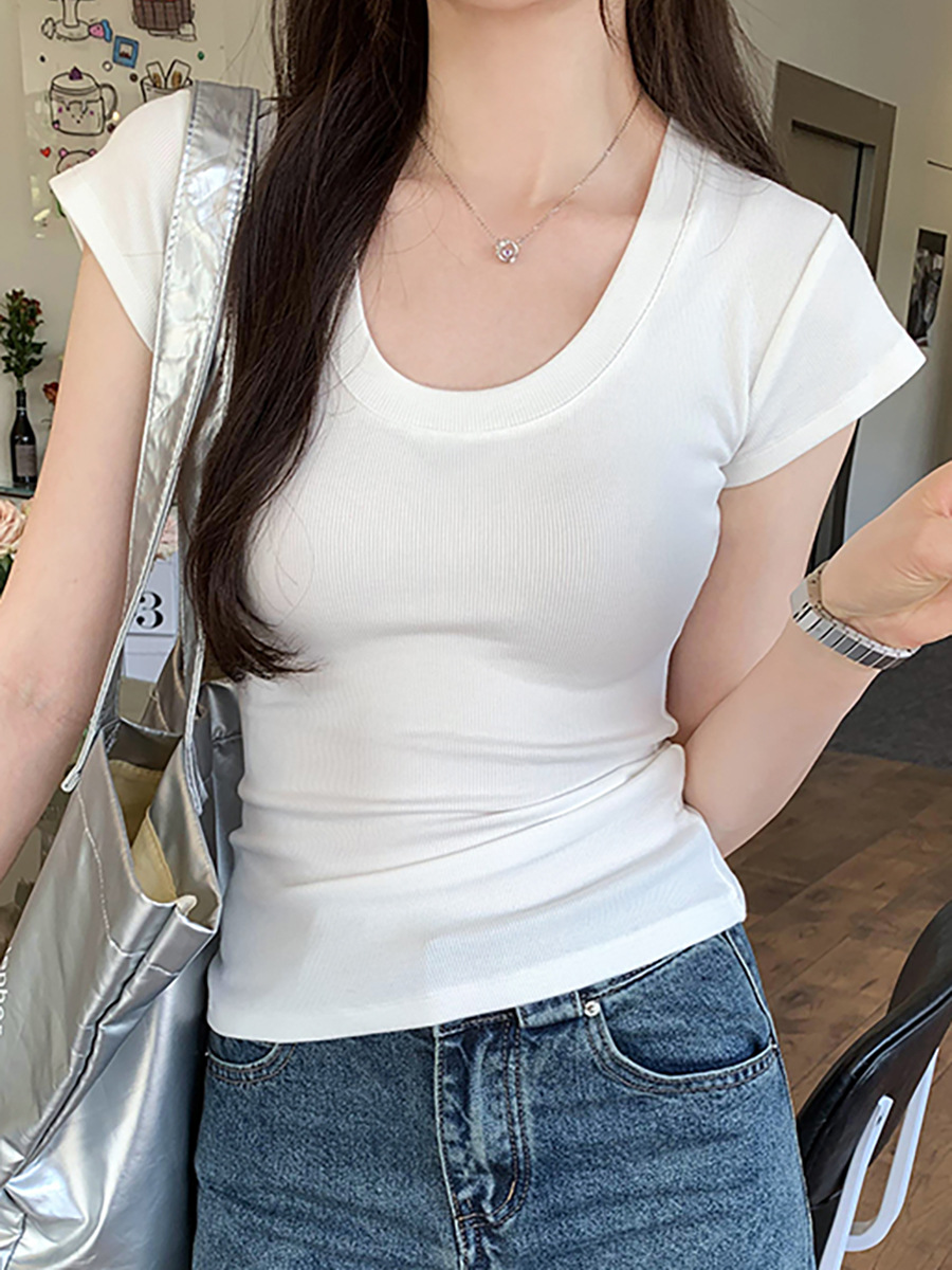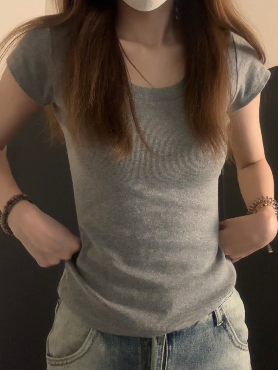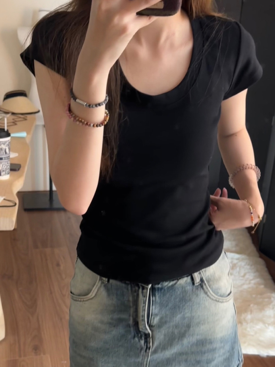 少女感粉色U领短袖上衣女夏季螺纹修身显瘦纯欲风百搭正肩T恤