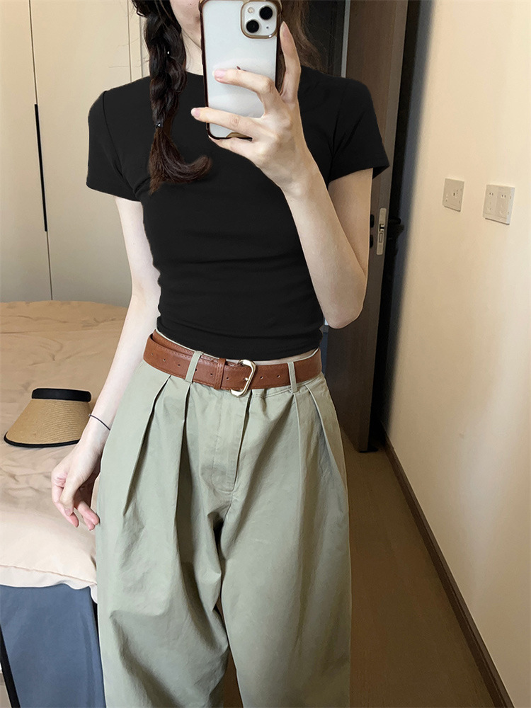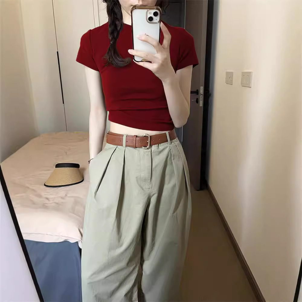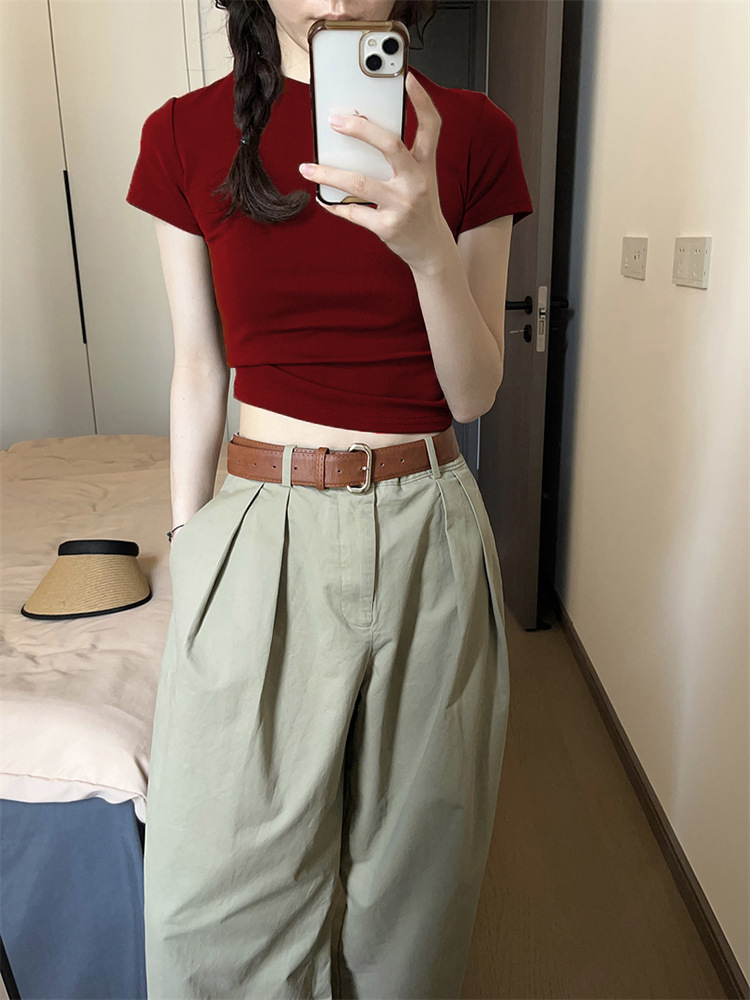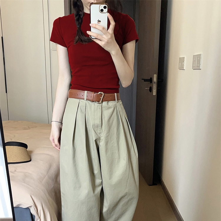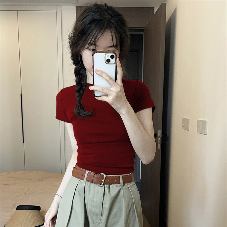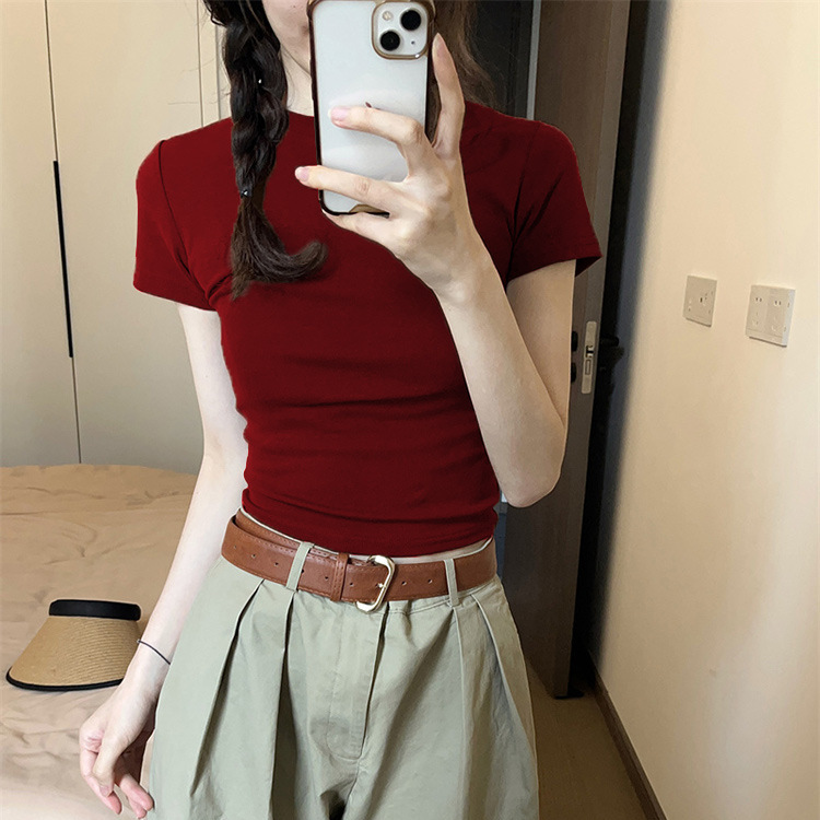 紧身正肩T恤女酒红色复古显白上衣夏季美式辣妹chic圆领短袖