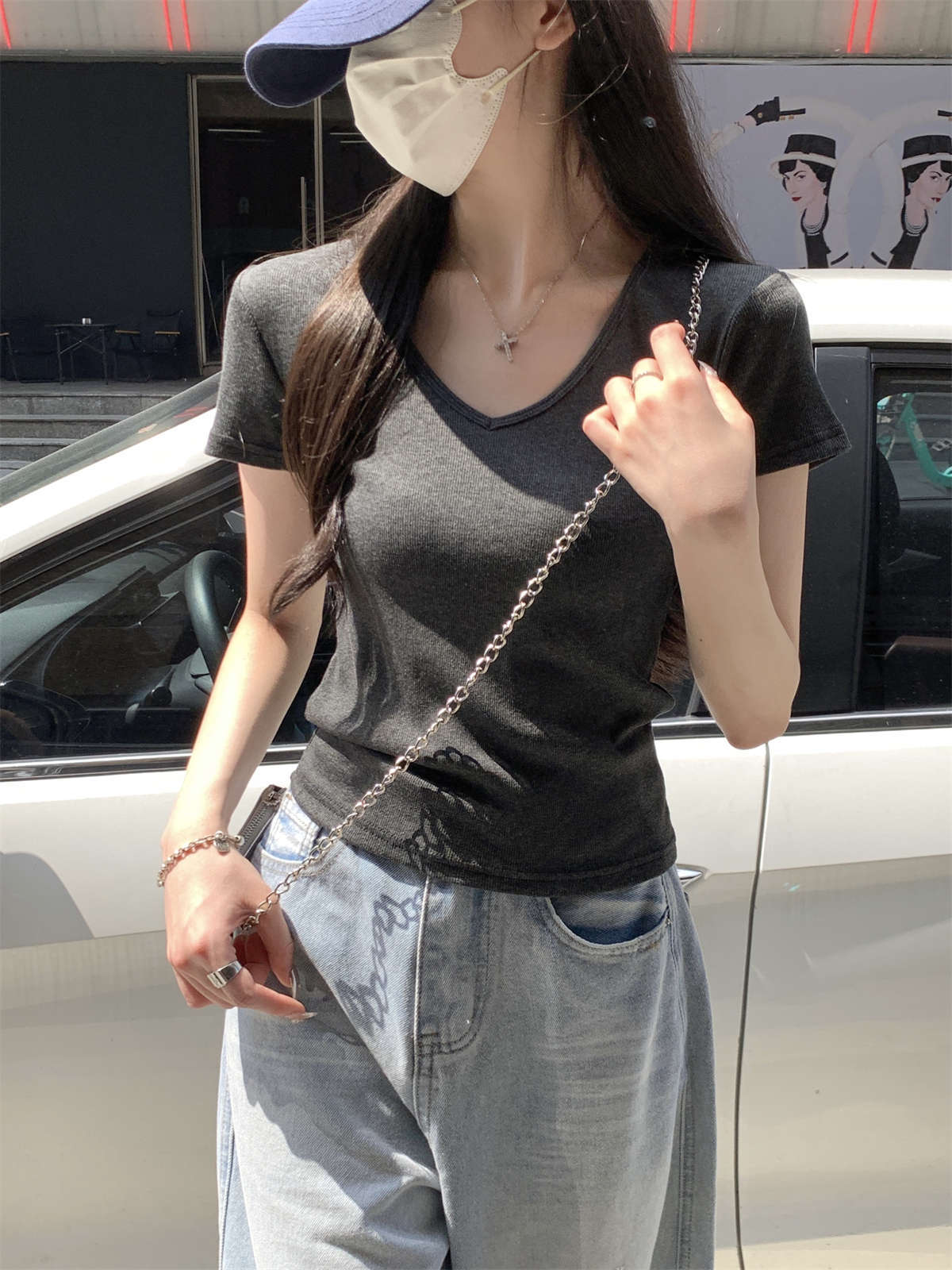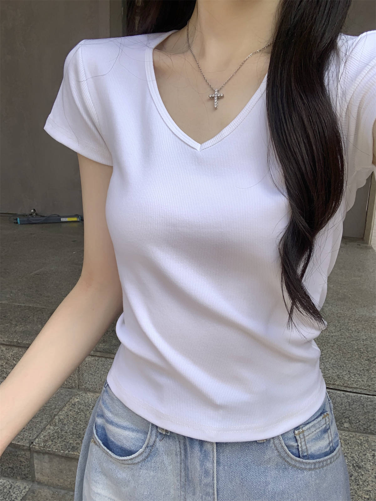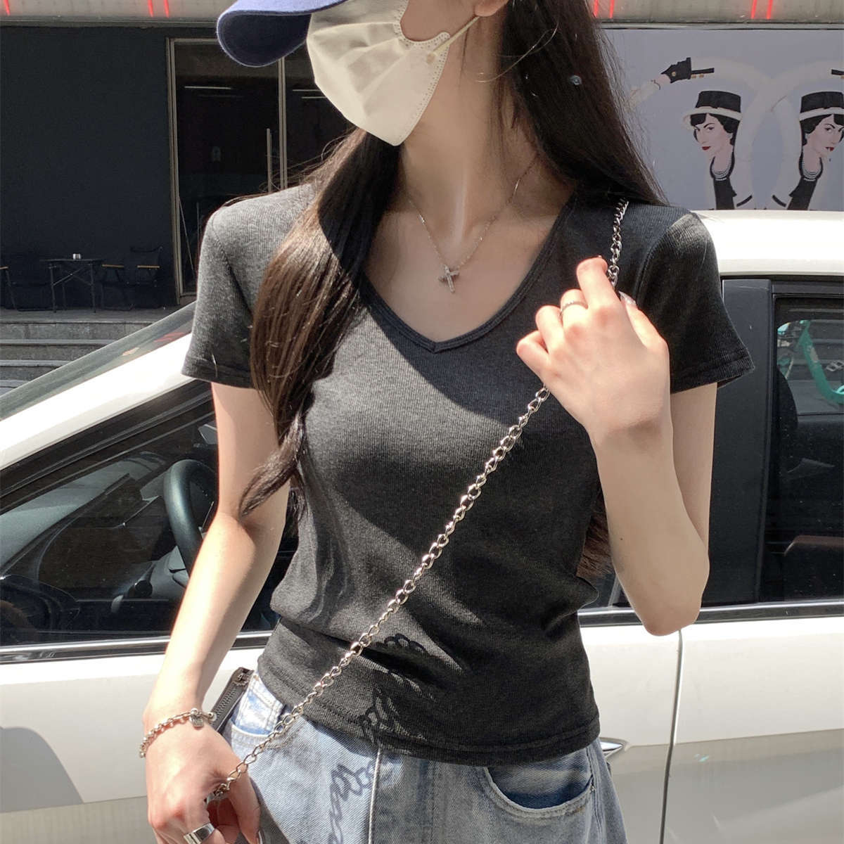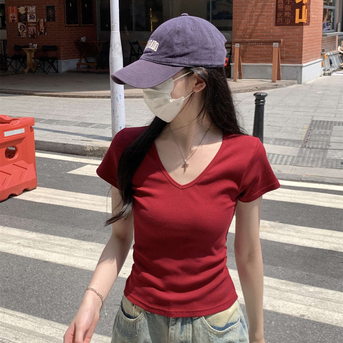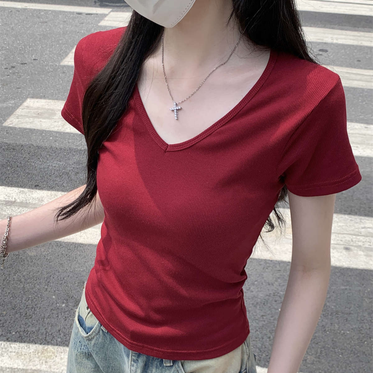 复古红色正肩v领百搭短袖T恤女夏季chic修身显瘦简约套头上衣