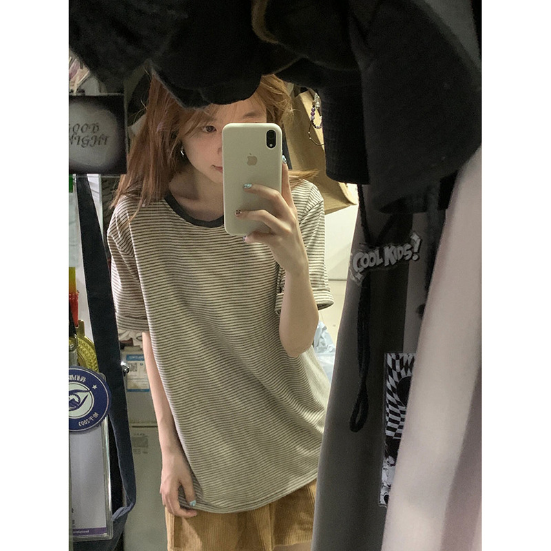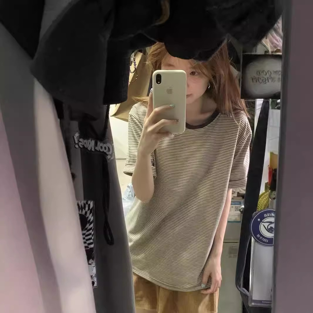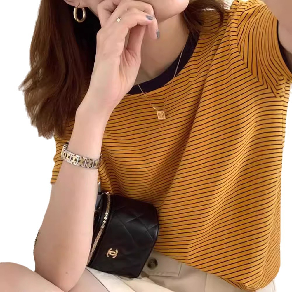 夏季新款设计感正肩条纹撞色圆领短袖T恤女宽松显瘦简约通勤