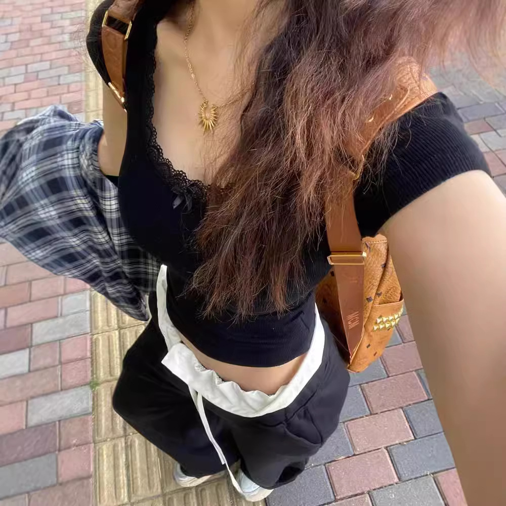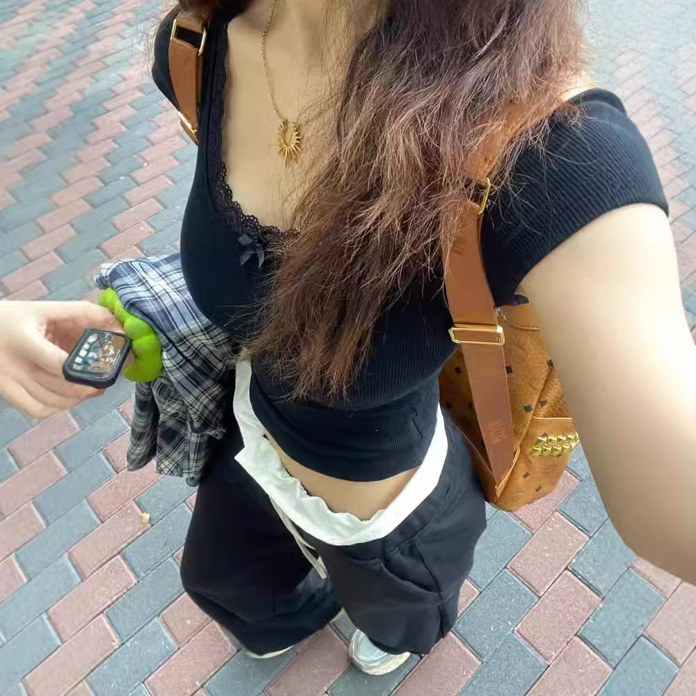 黑色纯欲别致短款蕾丝花边大领口短袖夏季女甜辣美式纯欲上衣