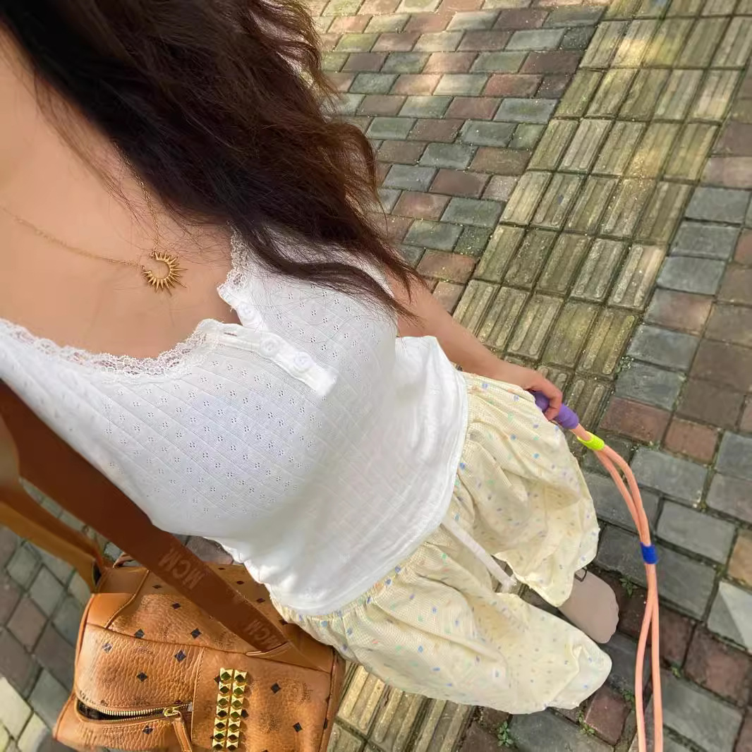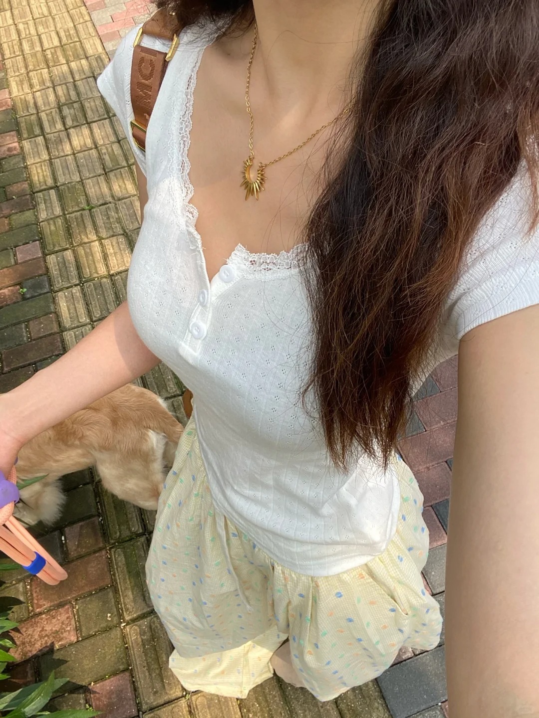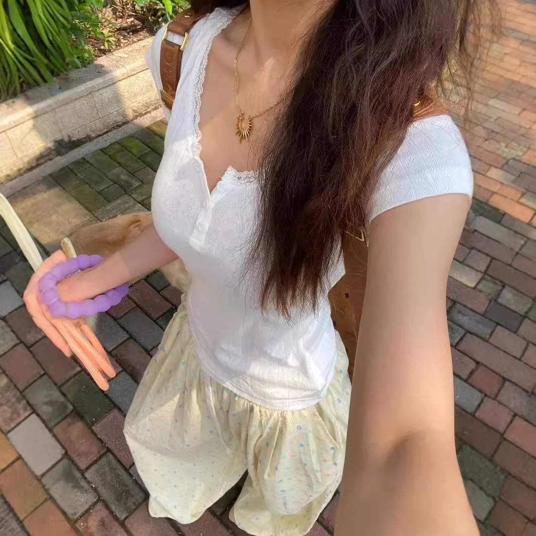 白色蕾丝花边大领口露锁骨纯欲风正肩短袖T恤夏减龄辣妹时尚