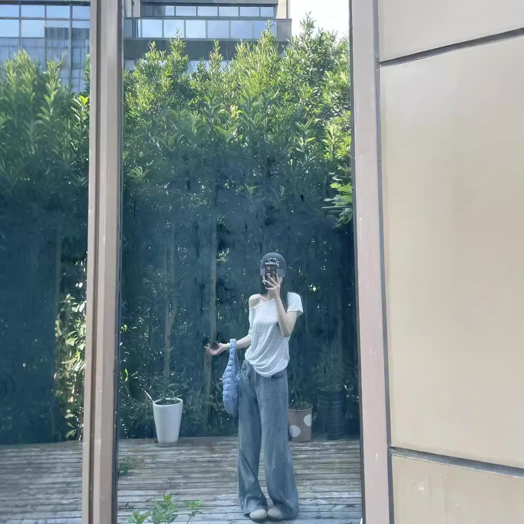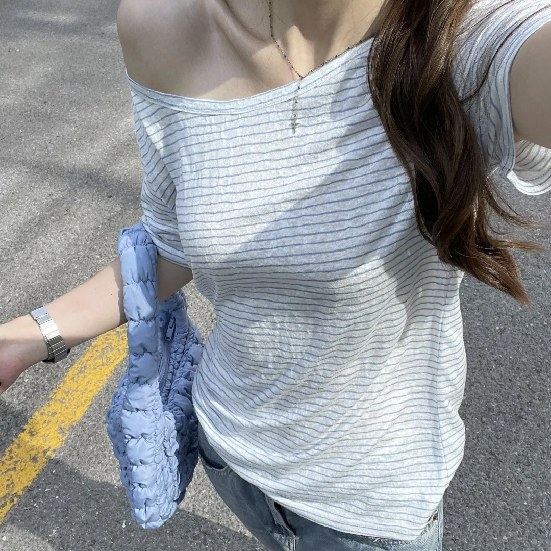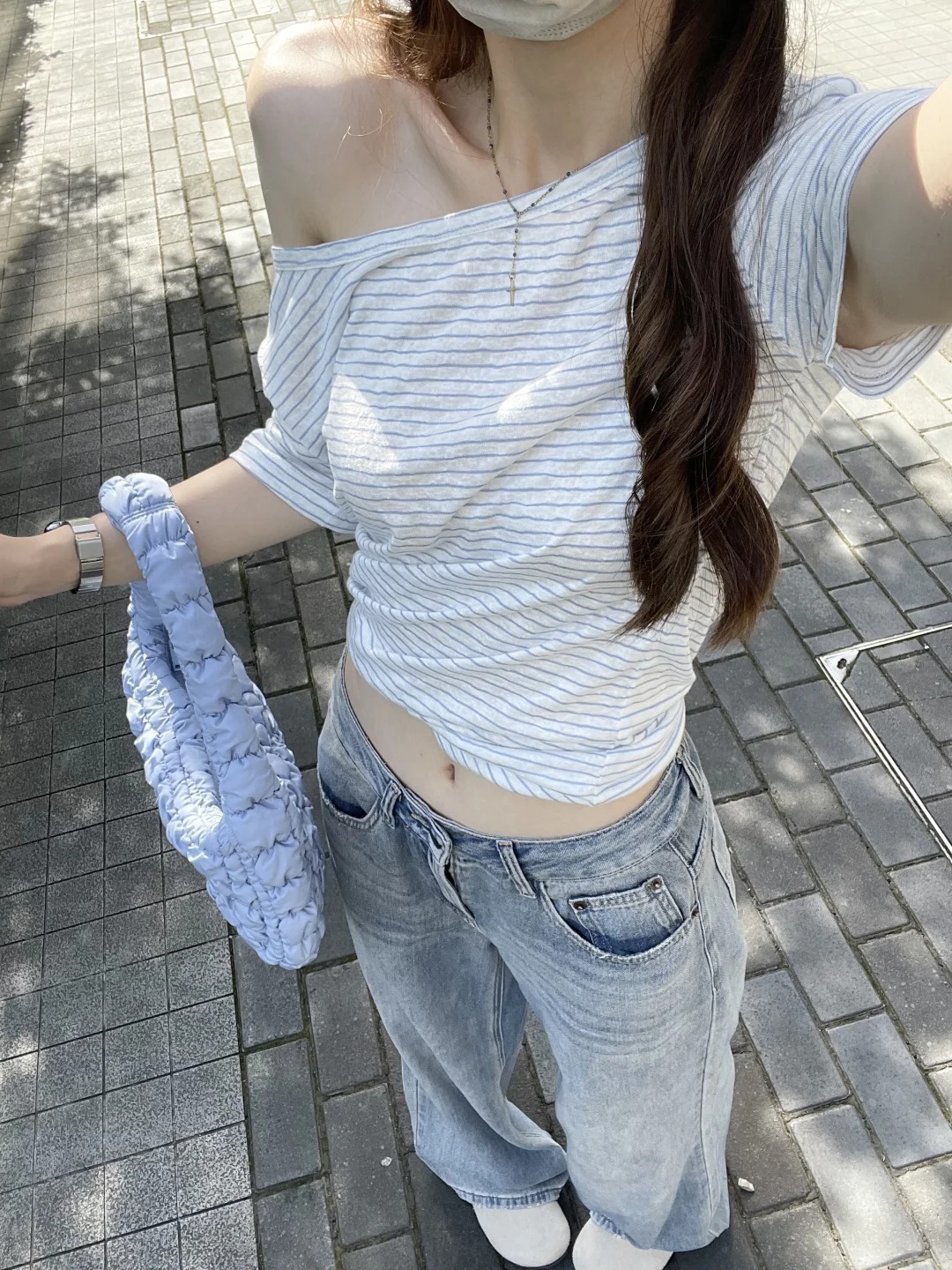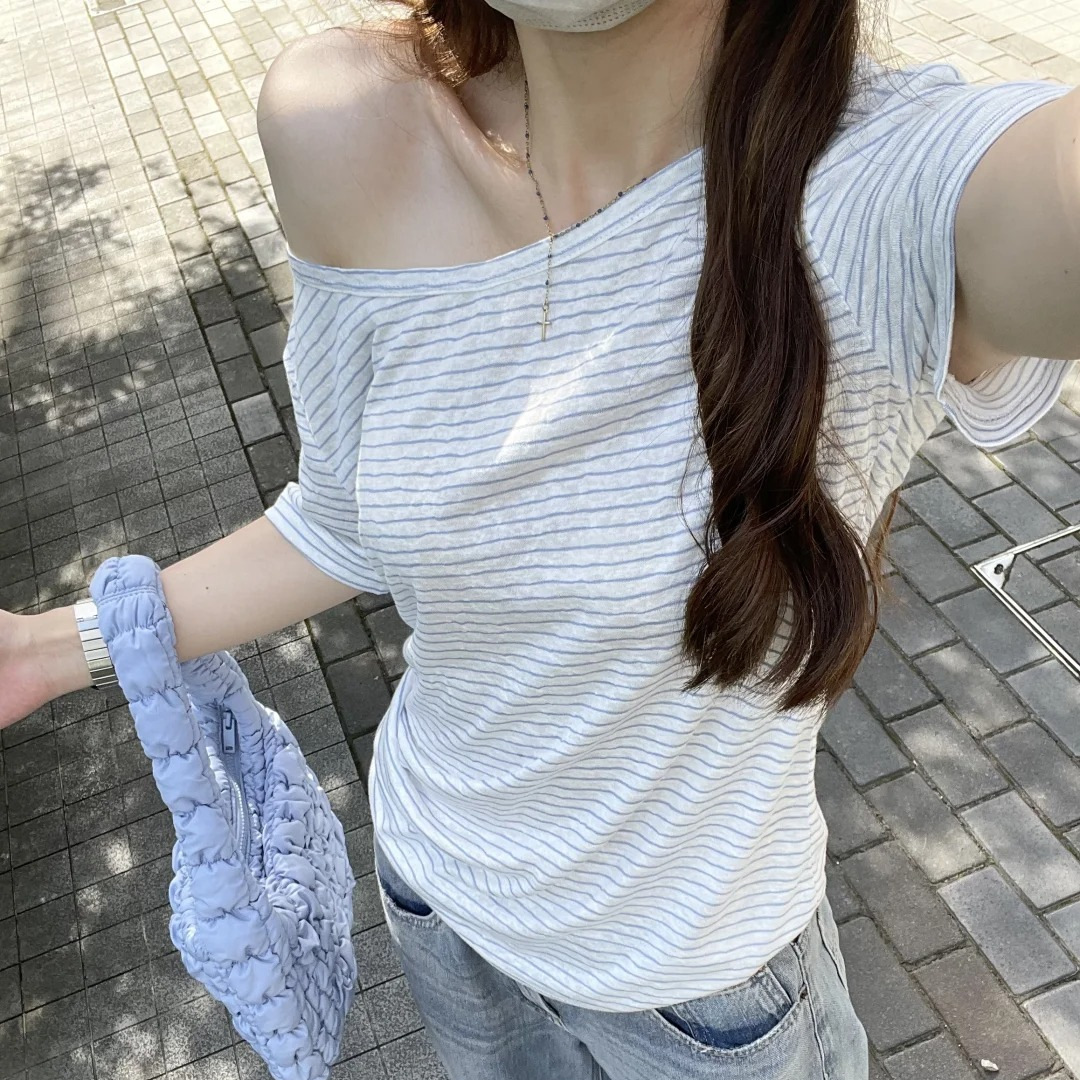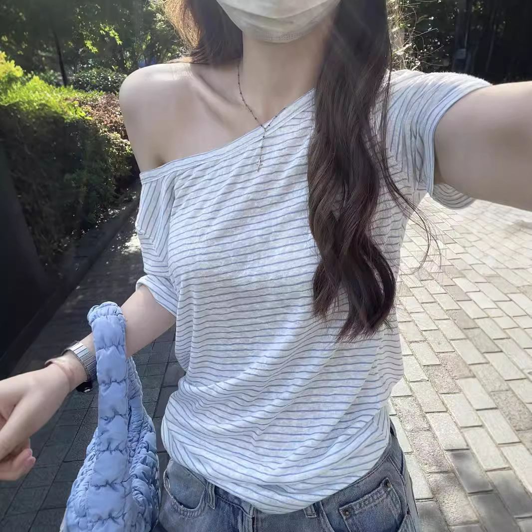 蓝白条纹T恤大领口斜肩短袖女夏季独特小心机漂亮ins露肩上衣
