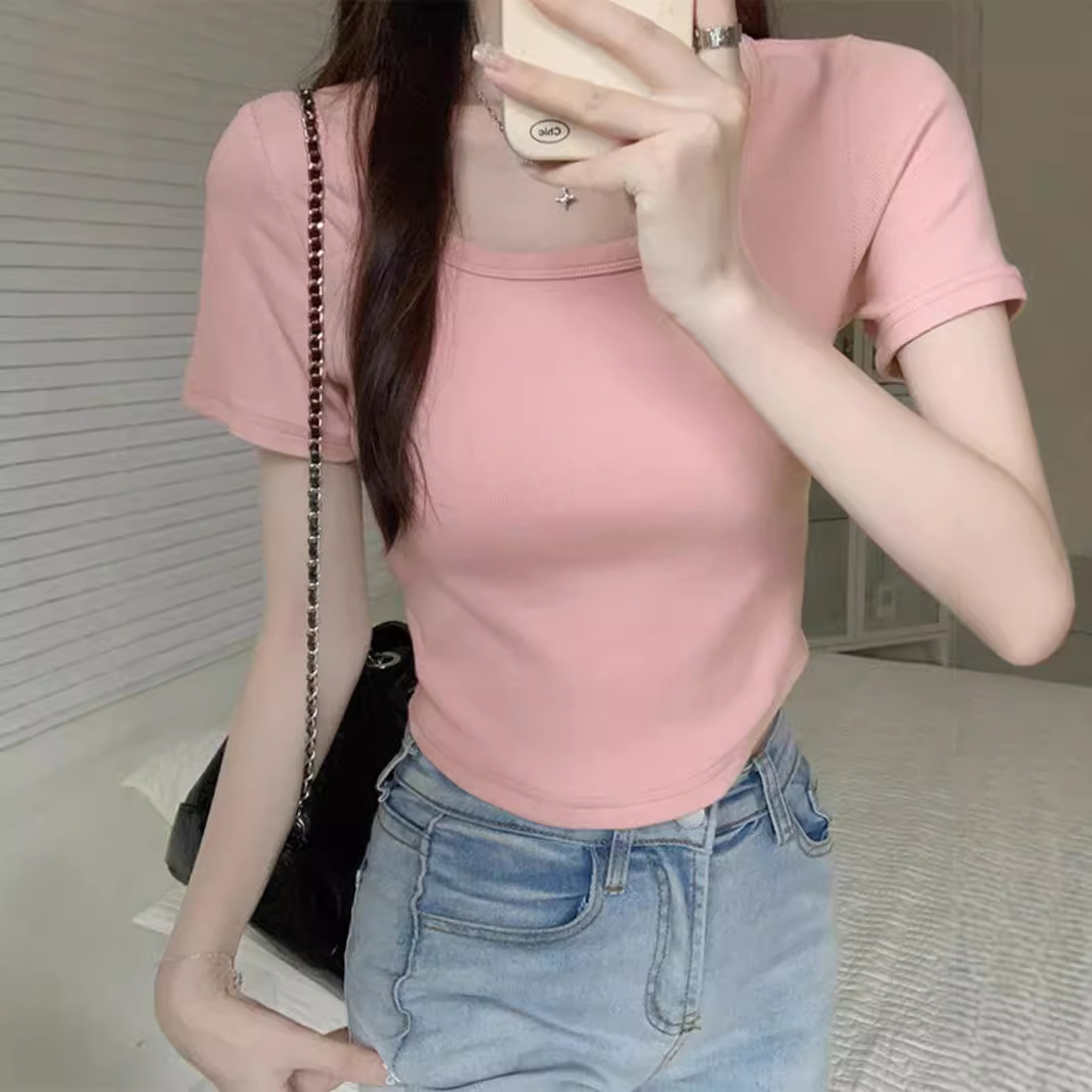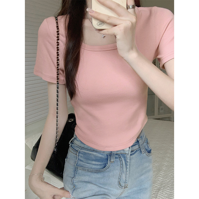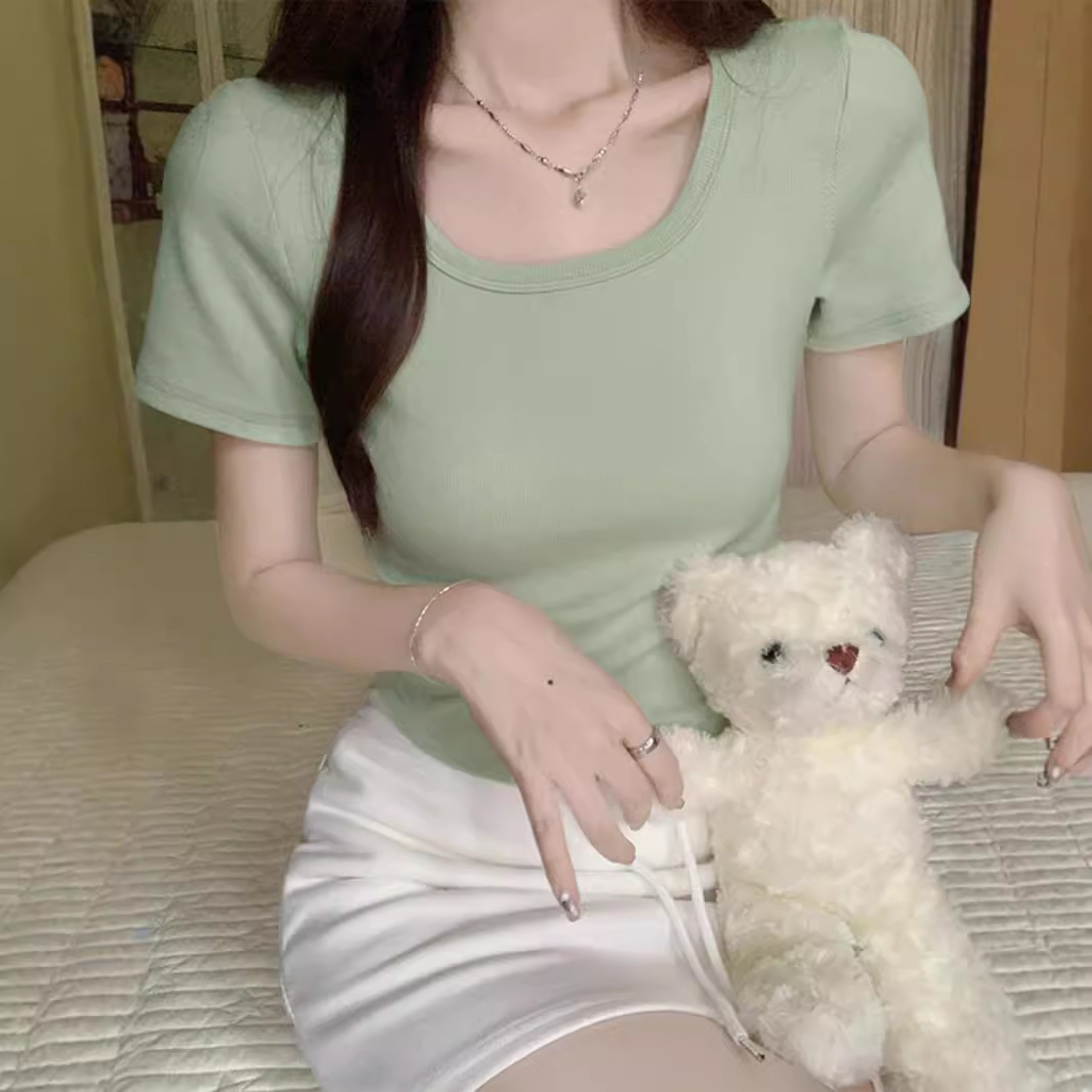 高级感方领T恤女正肩短上衣夏季韩版遮肚子显瘦弧形下摆短袖