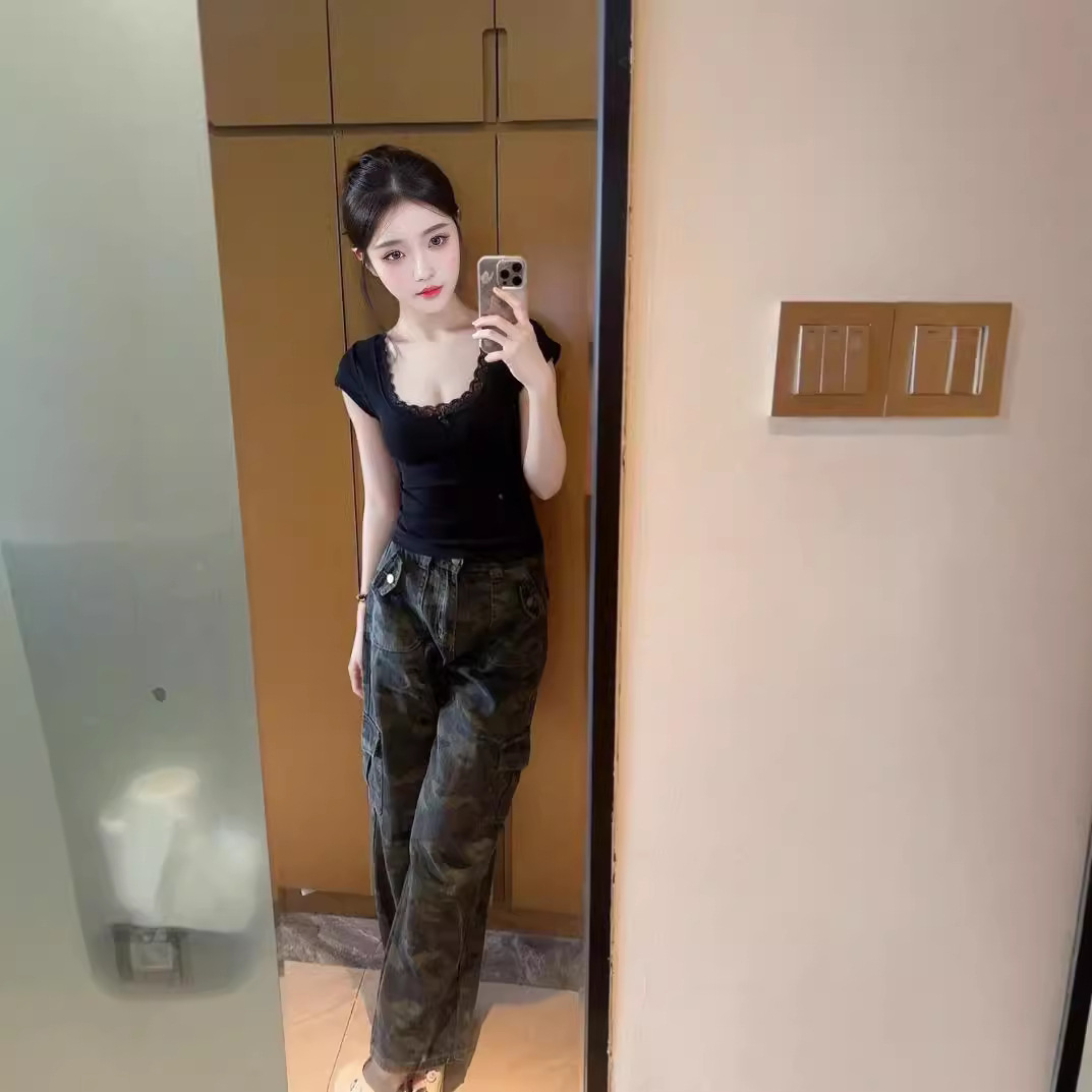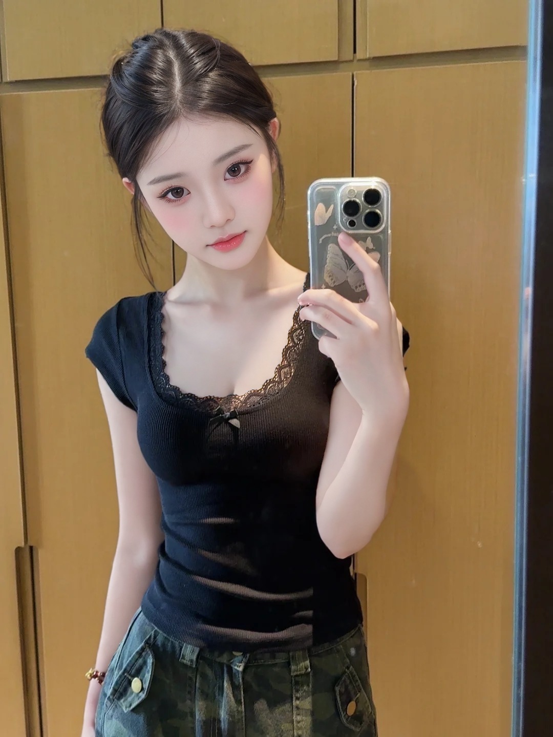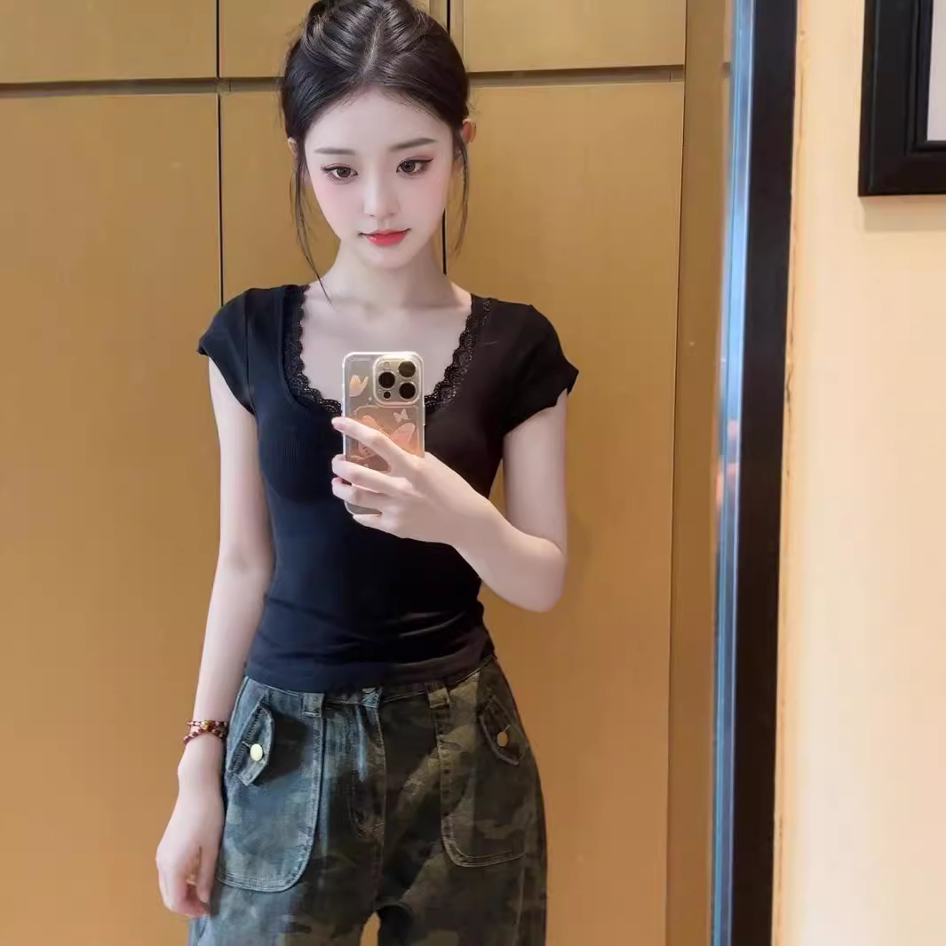 U领蕾丝花边T恤女夏季紧身显瘦辣妹风正肩上衣高级感黑色短袖