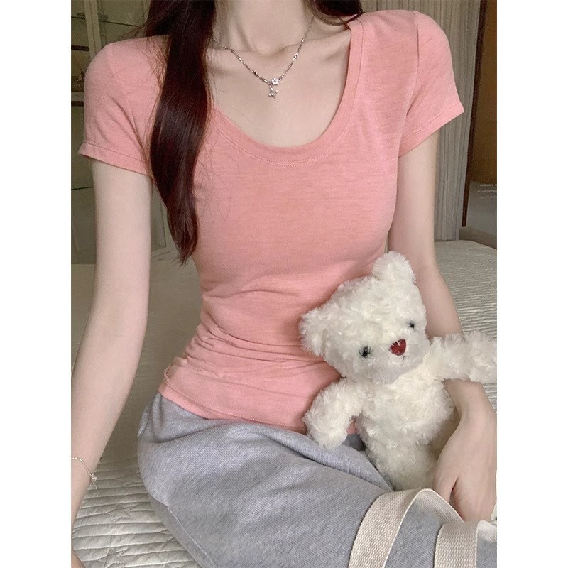 韩版多巴胺u领上衣修身显瘦正肩柔软弹力露脐短袖夏季显白女T恤