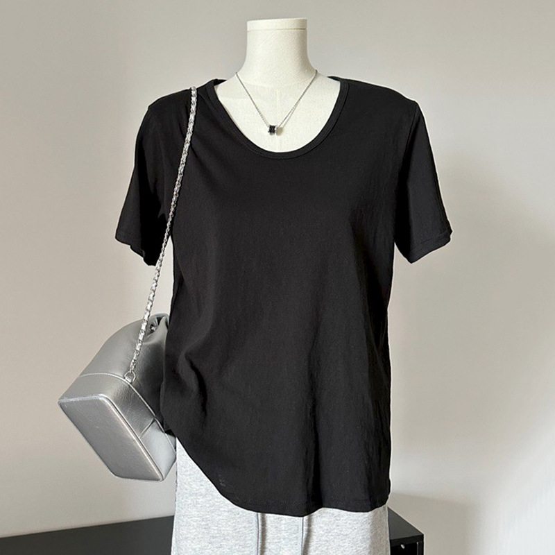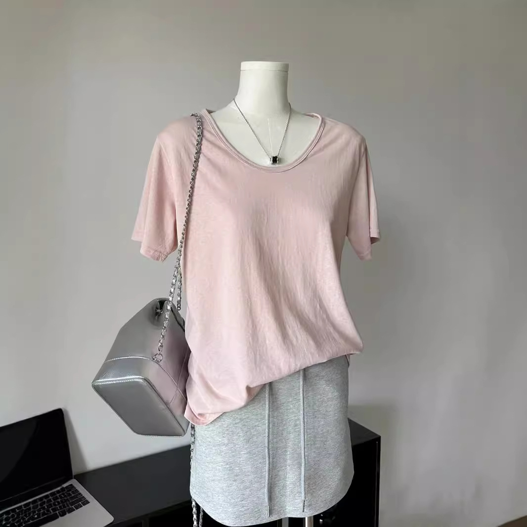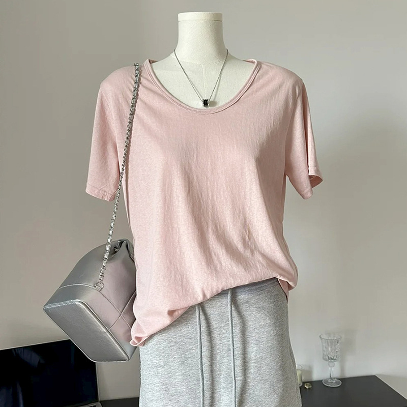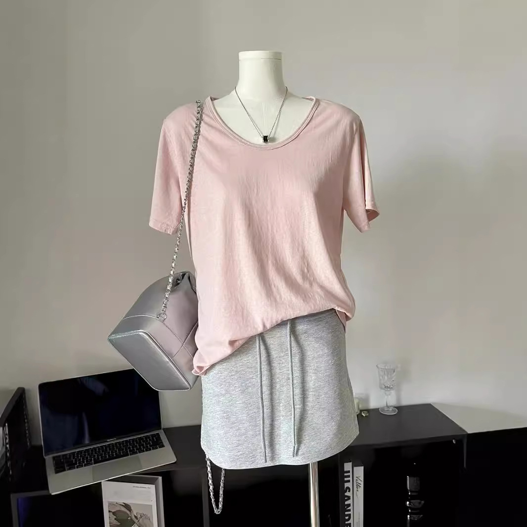 温柔少女感U领短袖女夏季韩版小个子减龄粉色T恤气质百搭上衣