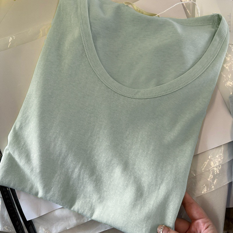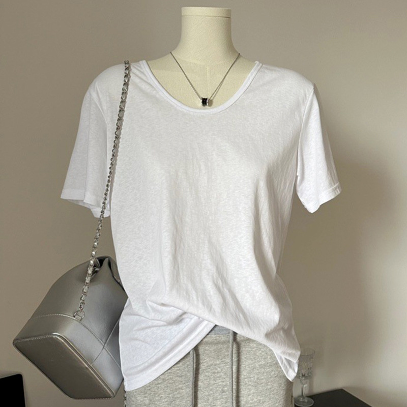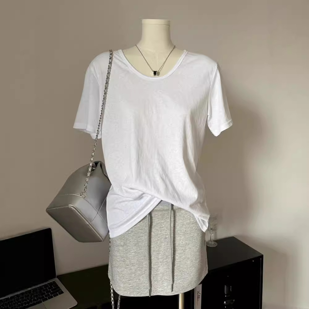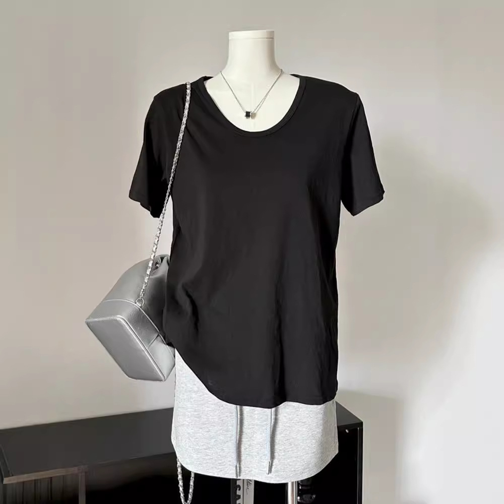 温柔少女感U领短袖女夏季韩版小个子减龄粉色T恤气质百搭上衣