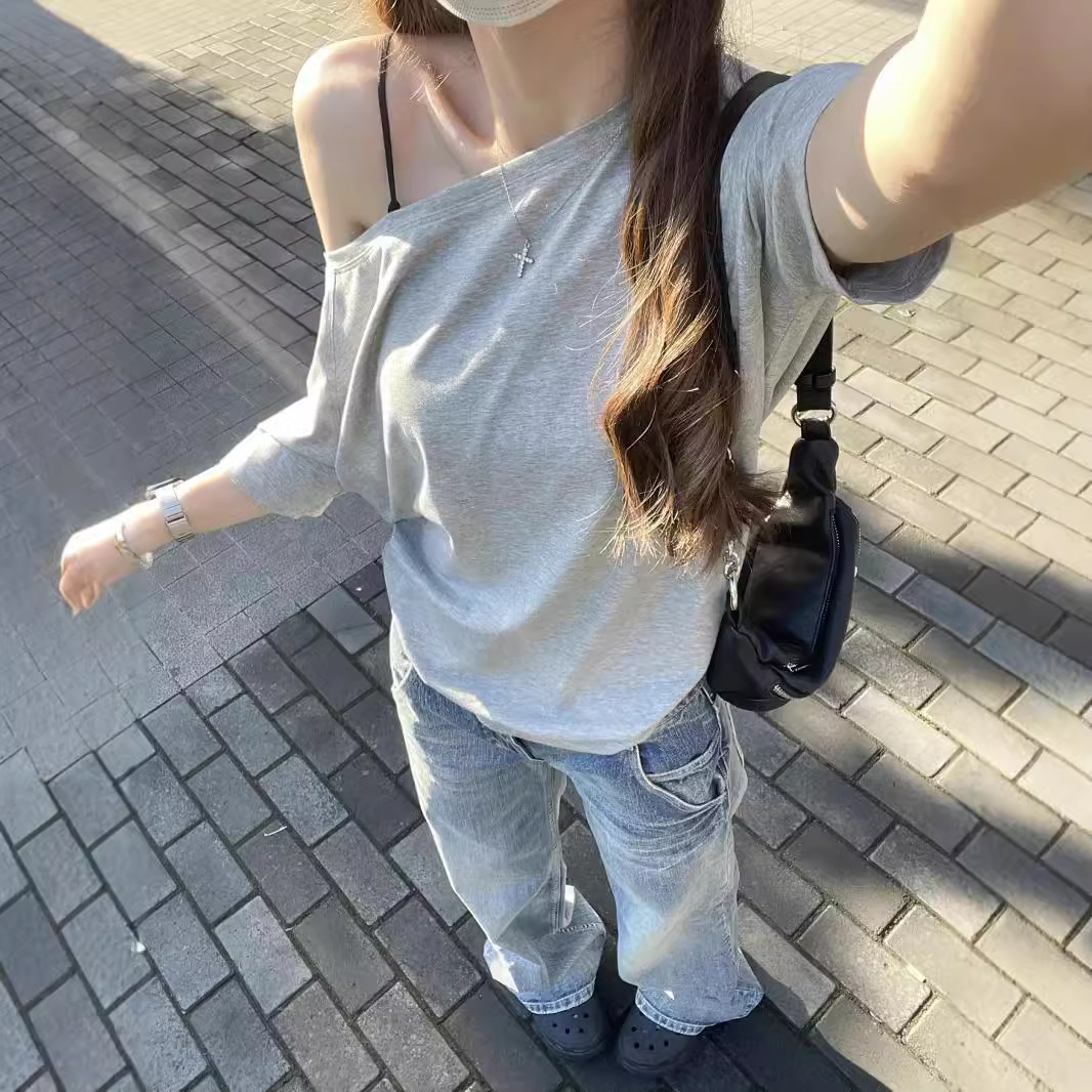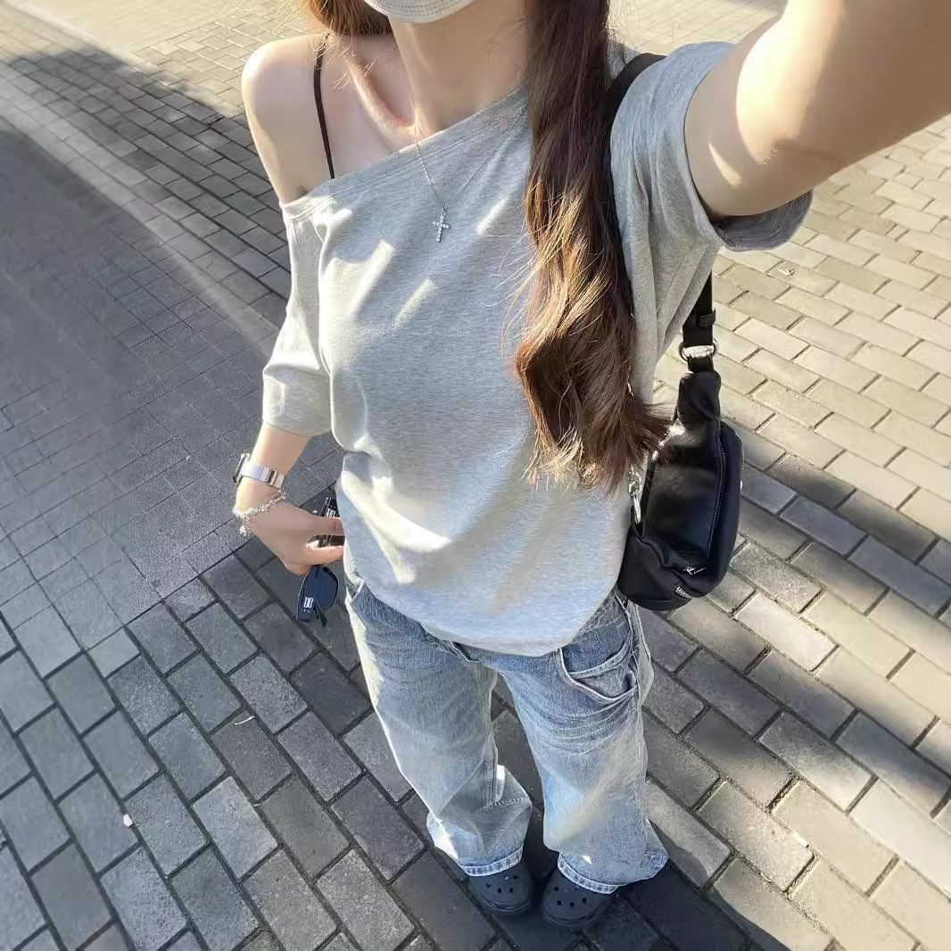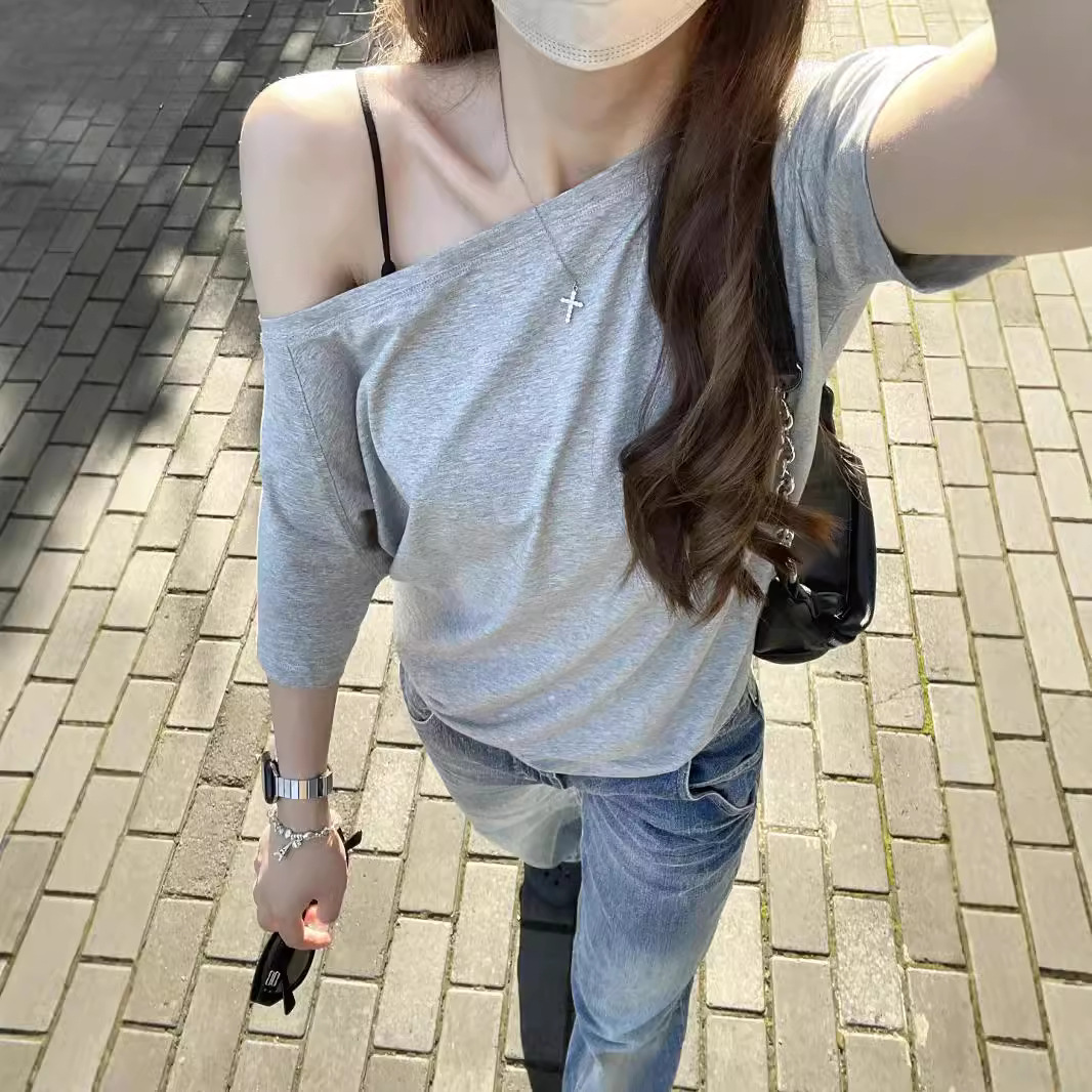 气质斜肩一字领T恤女修身辣妹短袖夏季小众绝美露肩chic上衣