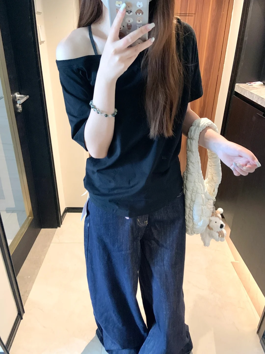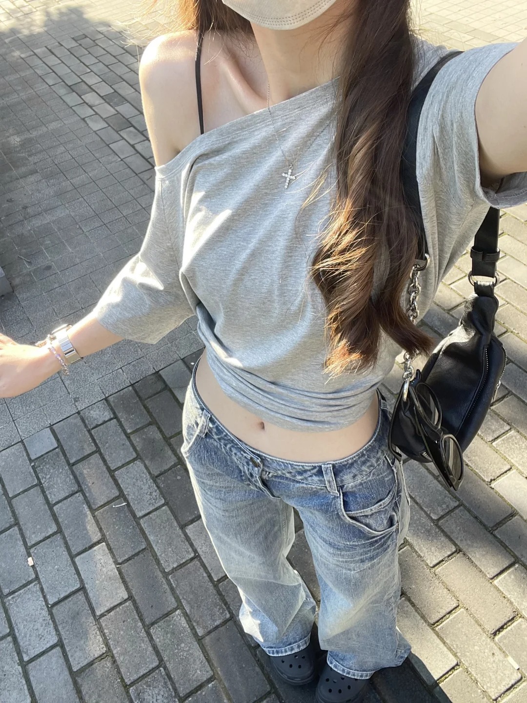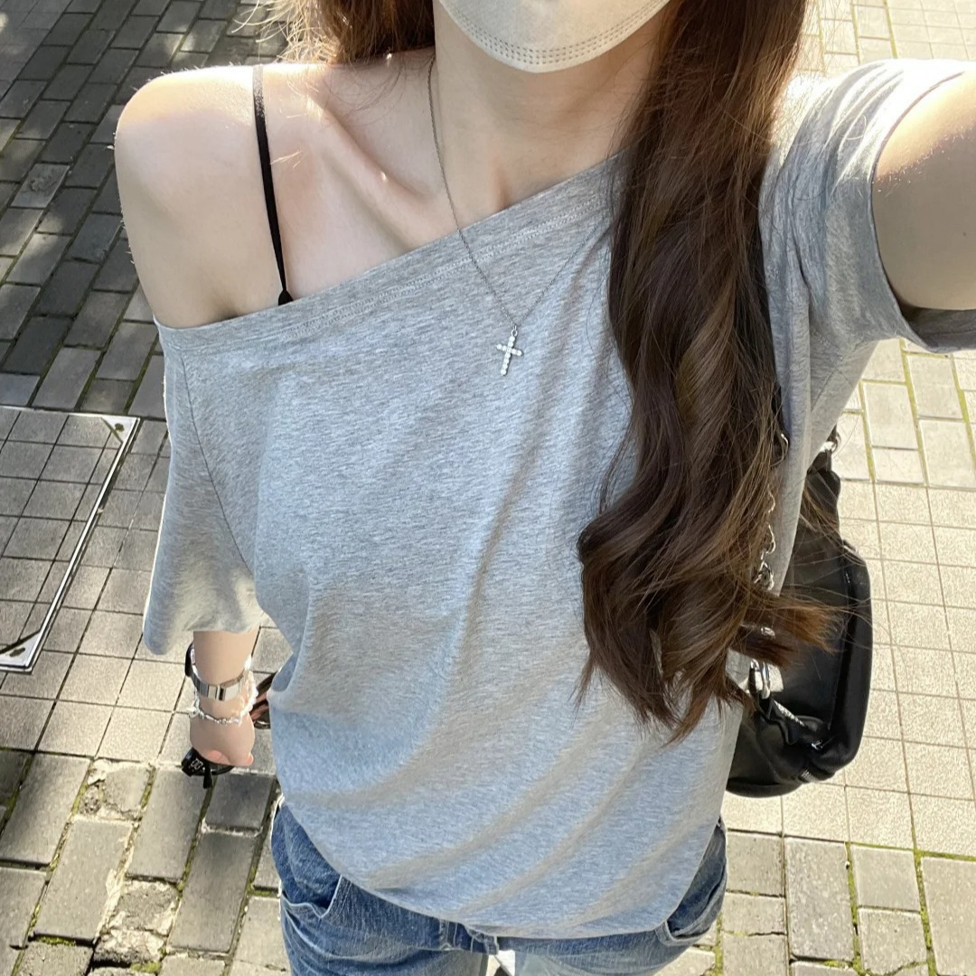 气质斜肩一字领T恤女修身辣妹短袖夏季小众绝美露肩chic上衣