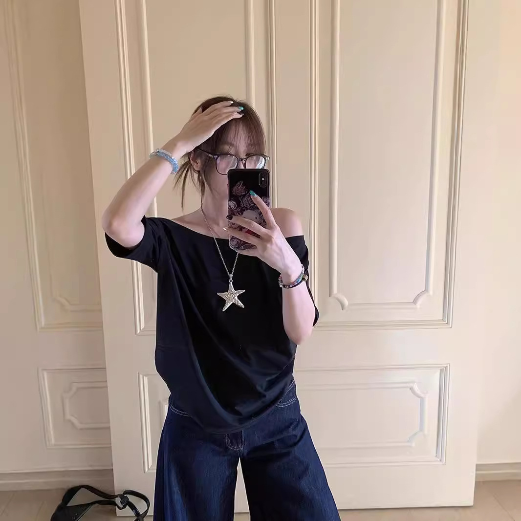 夏季新款一字肩露肩百搭减龄不撞款外穿辣妹女高级感灰色上衣