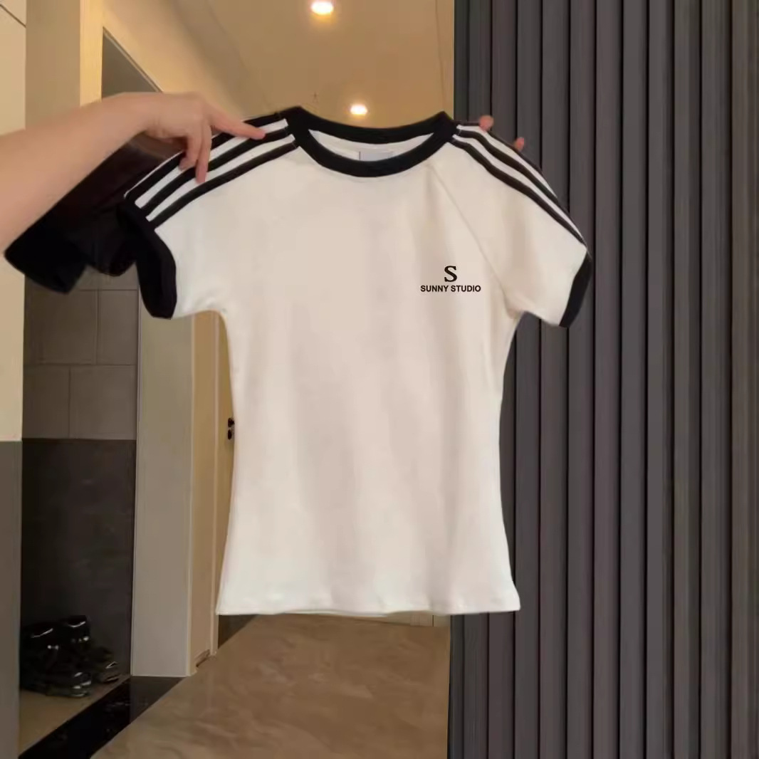 夏季美式复古设计感杠条短袖T恤女独特修身显瘦chic印花上衣