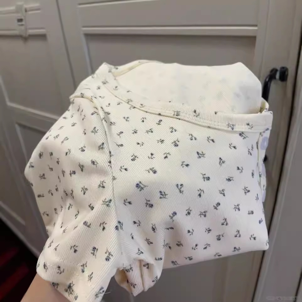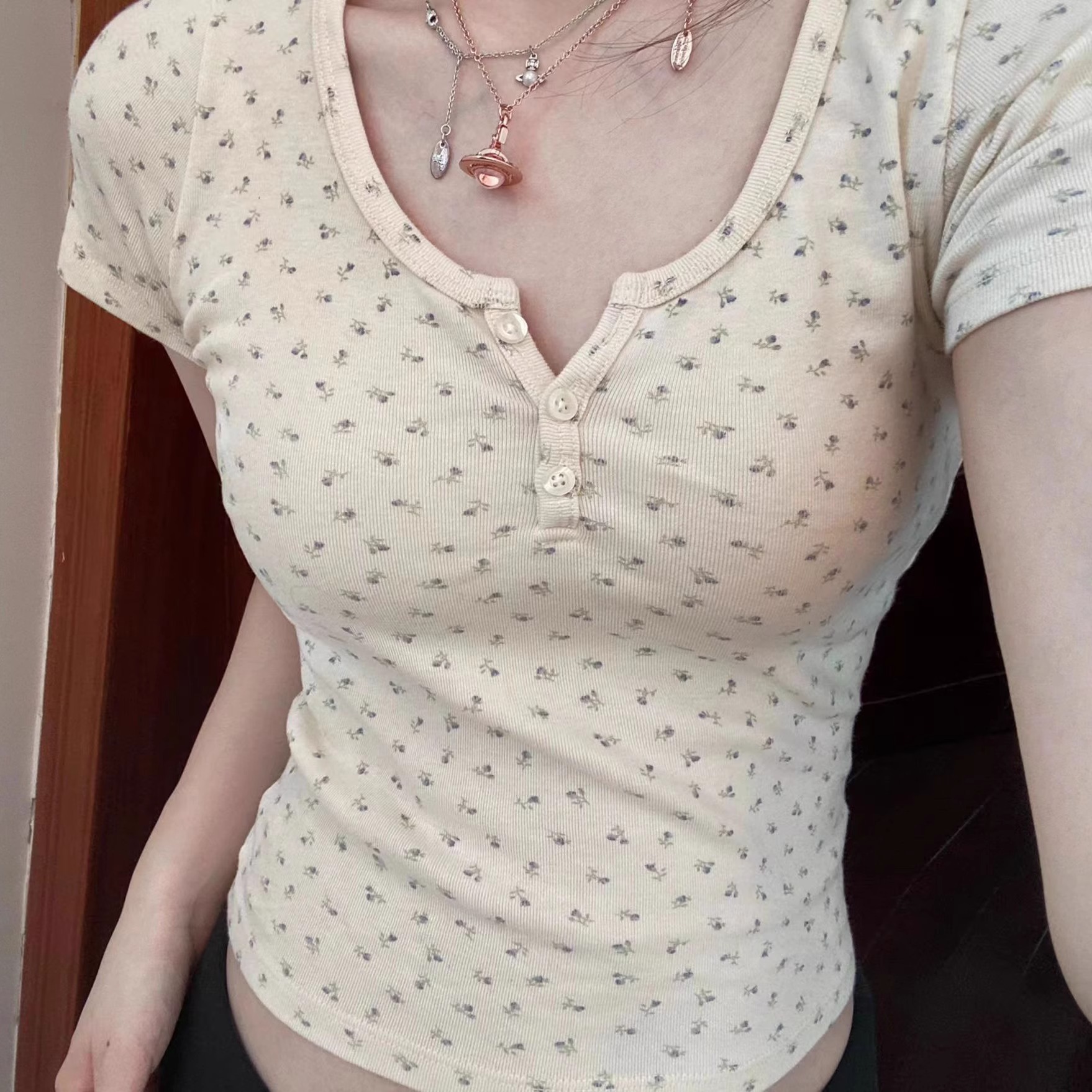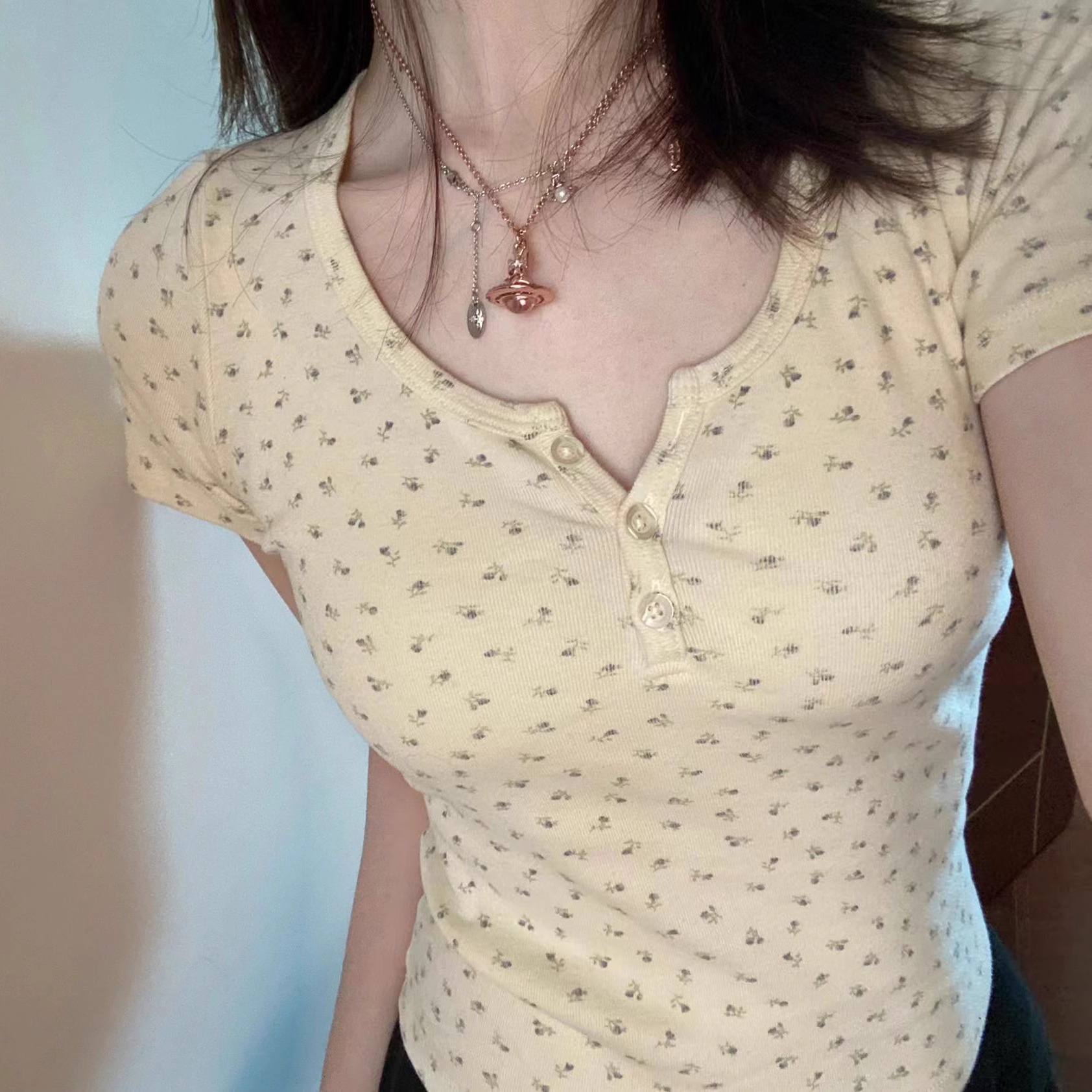 小个子减龄甜欲漂亮纽扣U领露锁骨正肩短款短袖夏女公主风潮