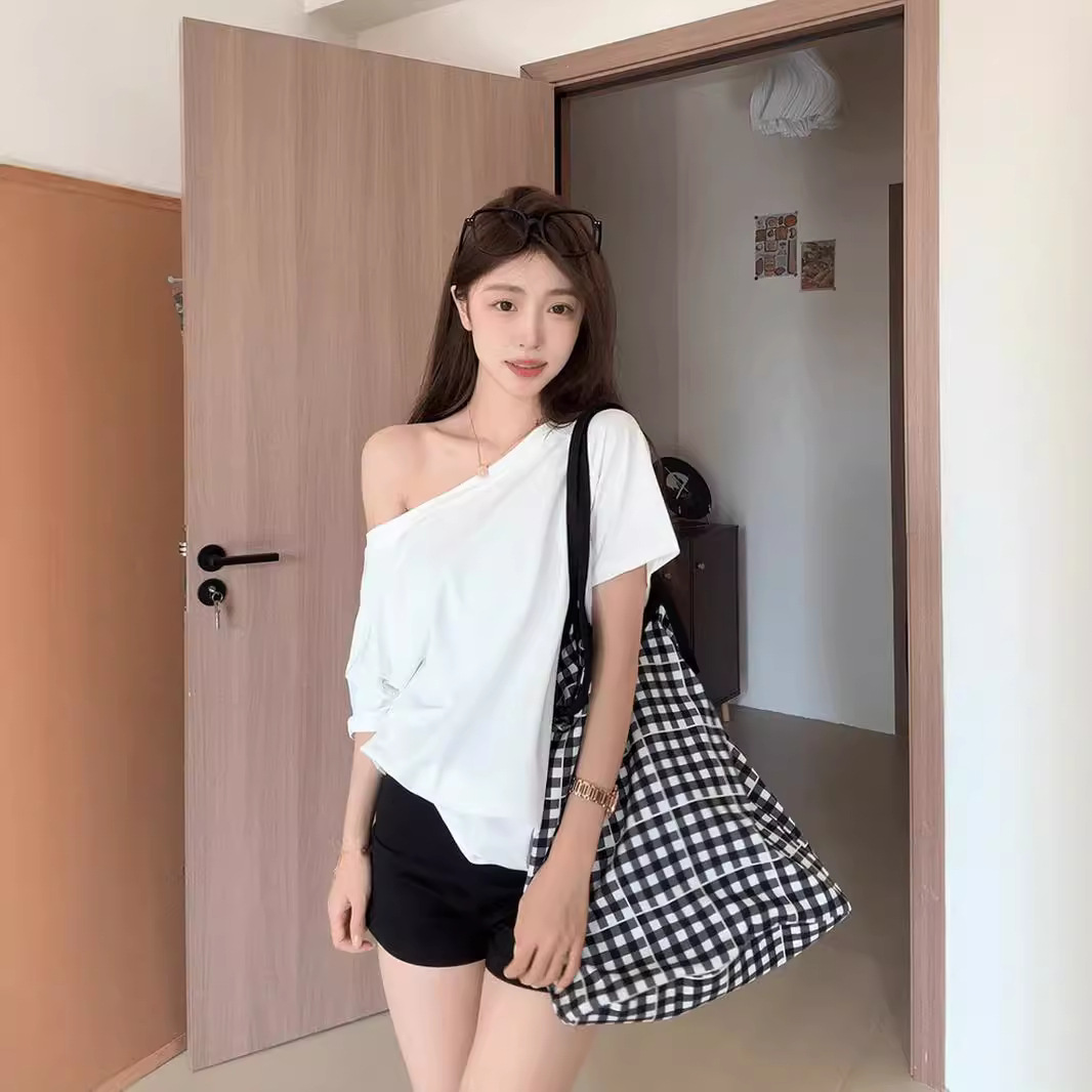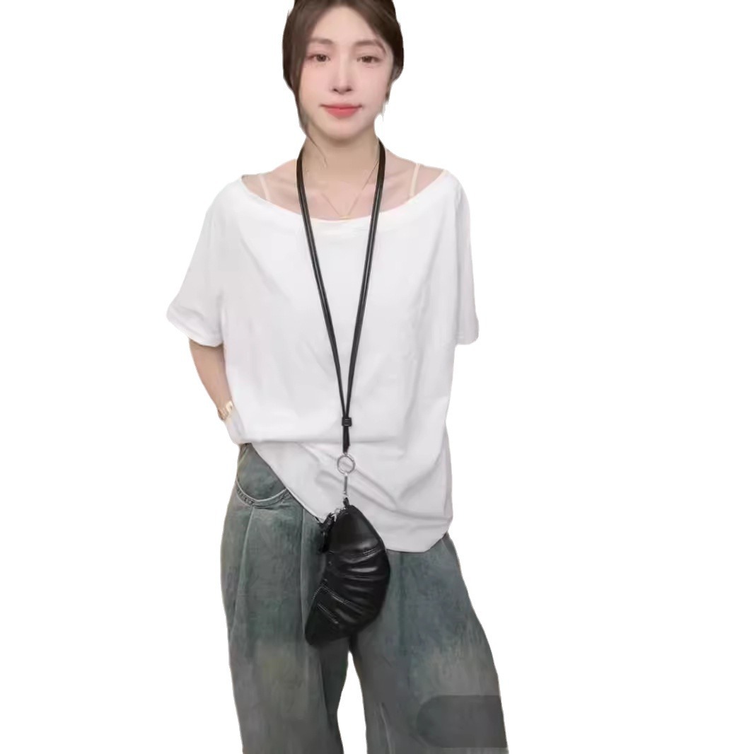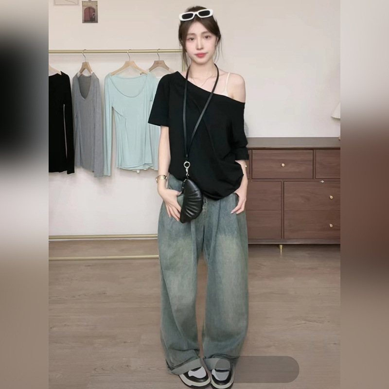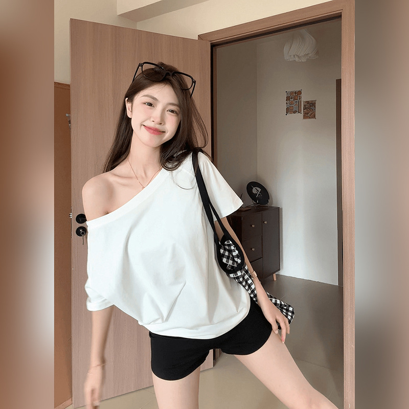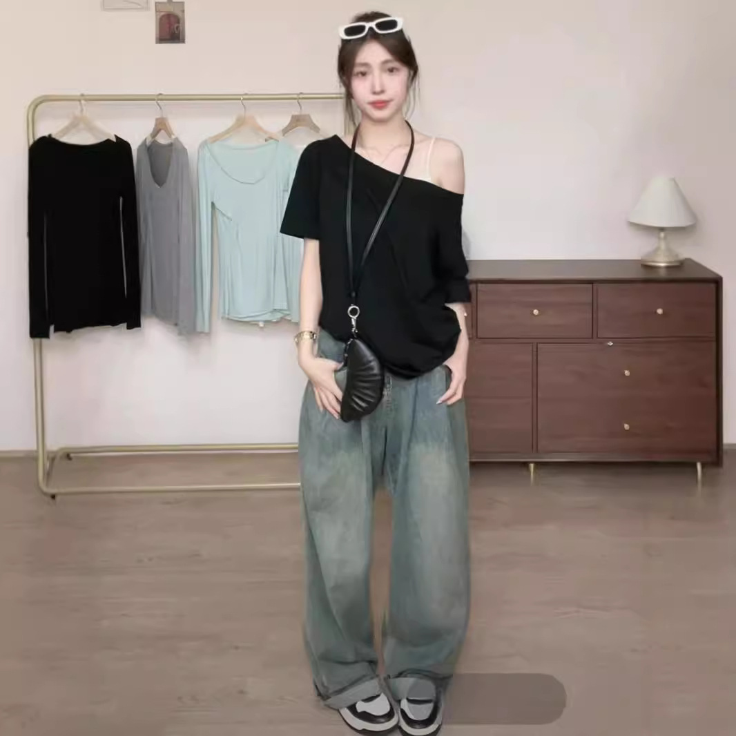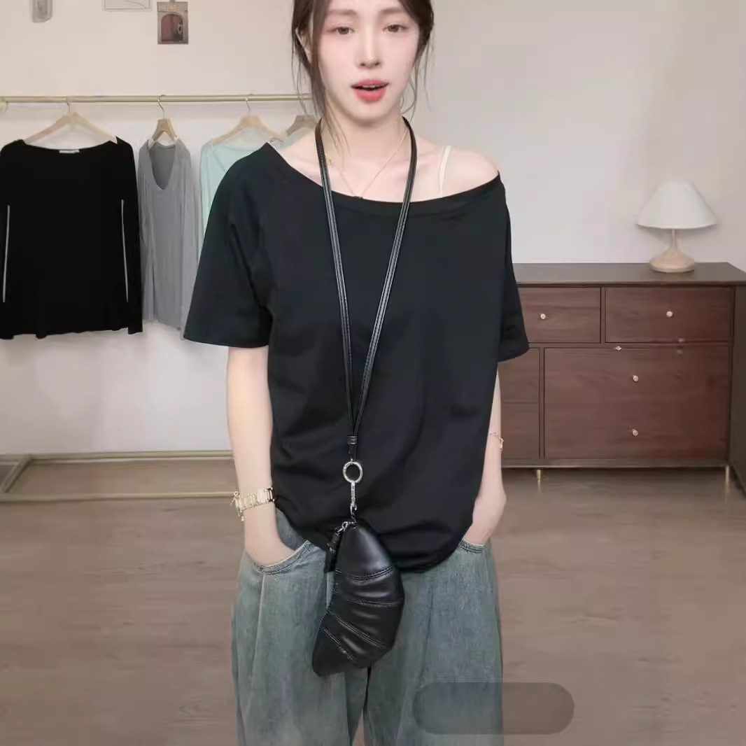 张婧仪明星同款气质松弛时尚慵懒风一字斜肩短袖女夏季宽松休闲潮