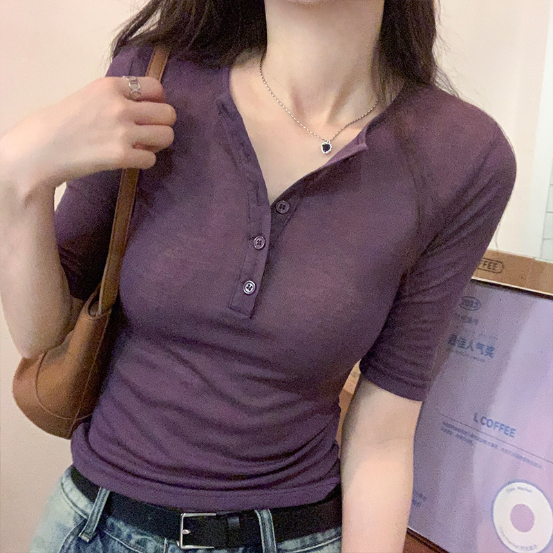黑色V领正肩五分袖T恤女夏季高级感修身显瘦设计感纽扣短上衣