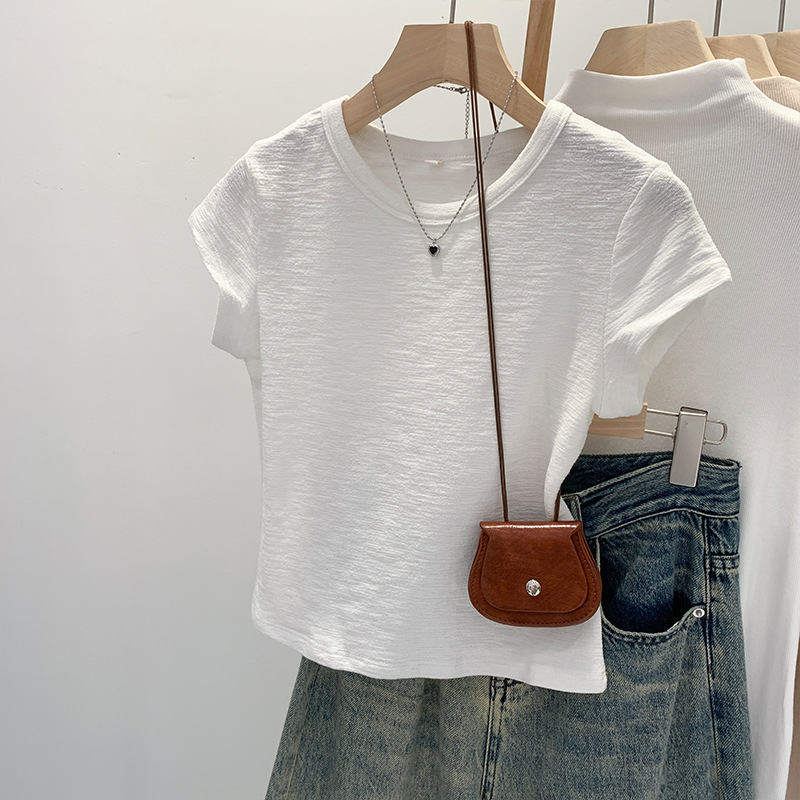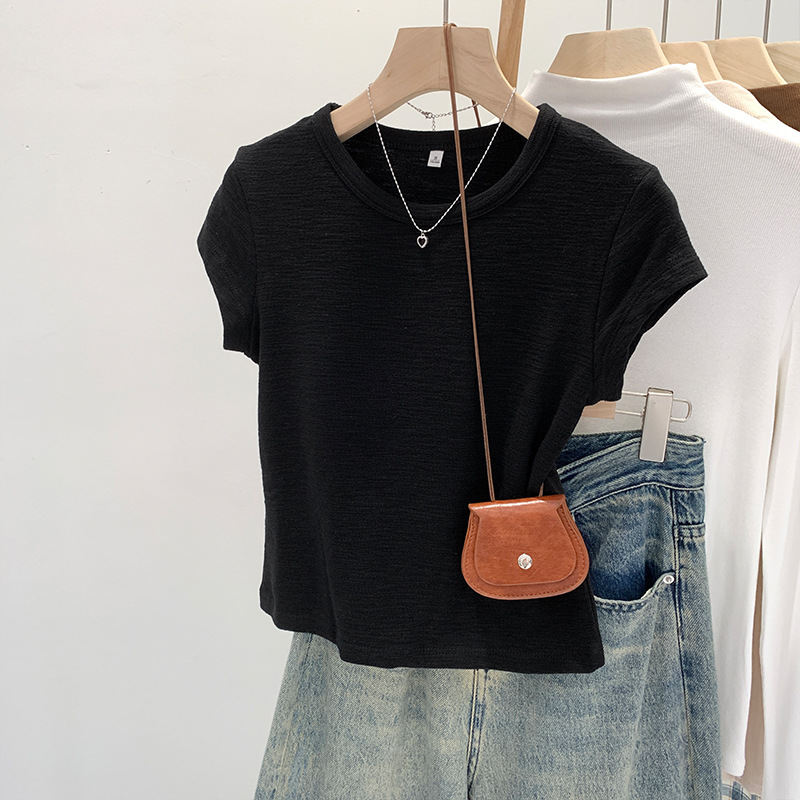 夏季纯色正肩刺绣圆领减龄短袖T恤腰部褶皱收腰显瘦弹力短款上衣