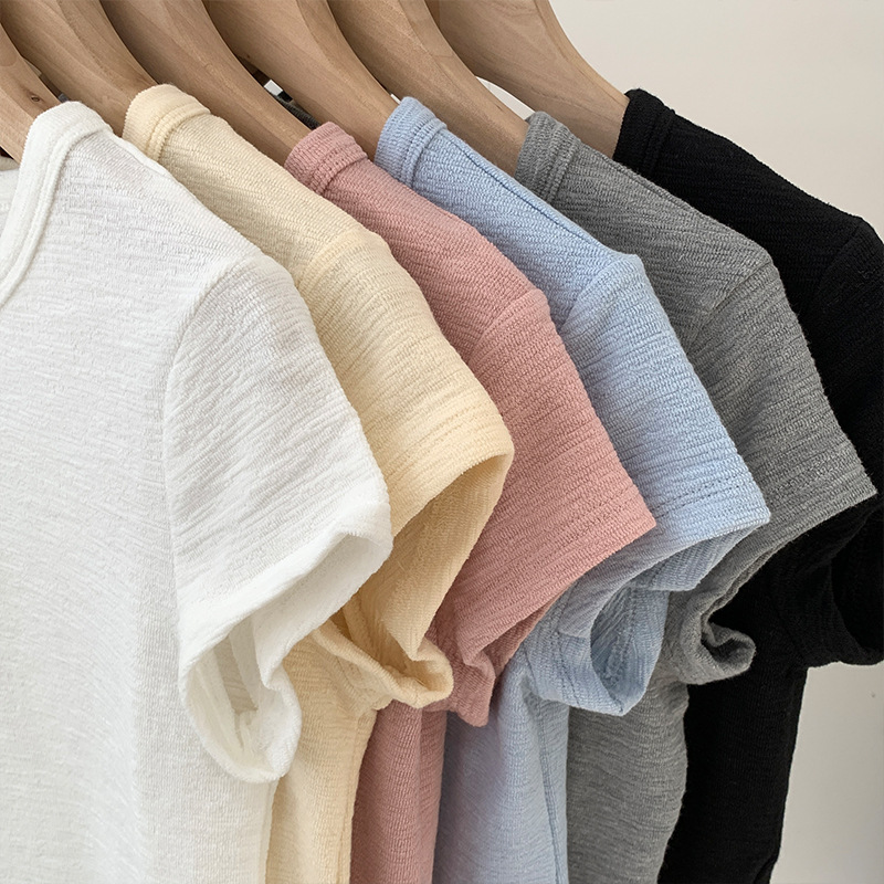 甜美粉色T恤女夏季肌理感小众减龄短上衣韩系小个子正肩短袖