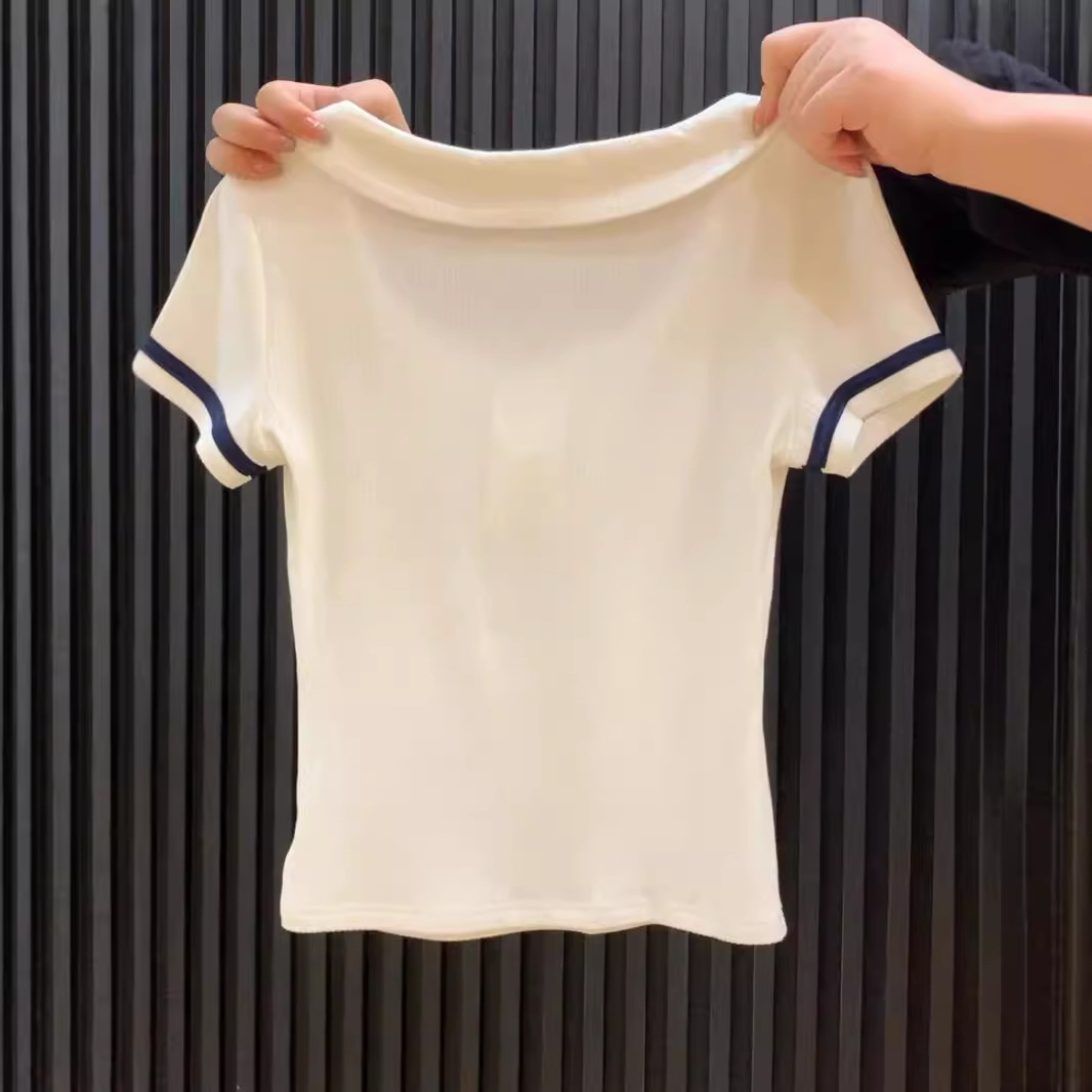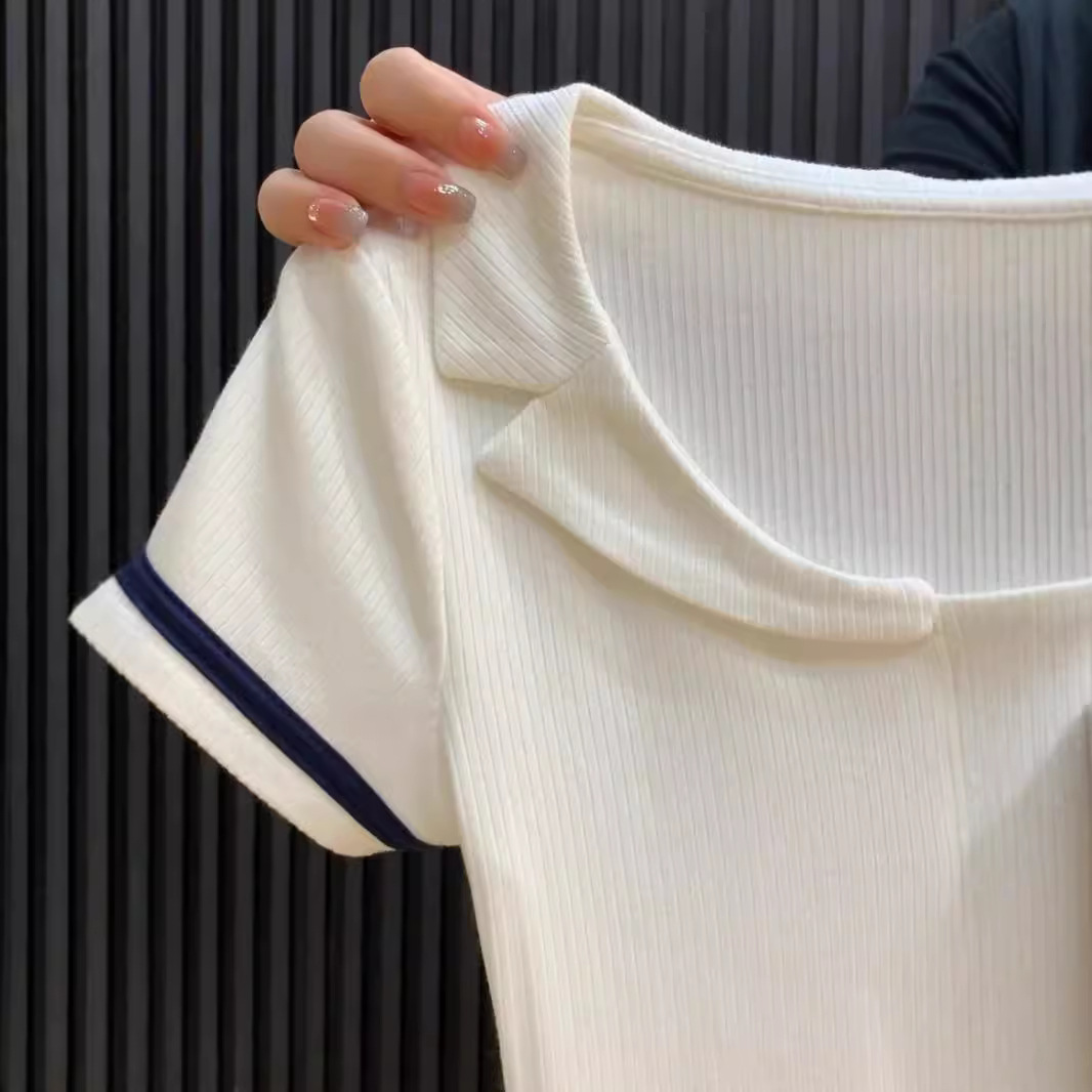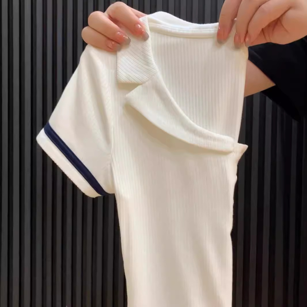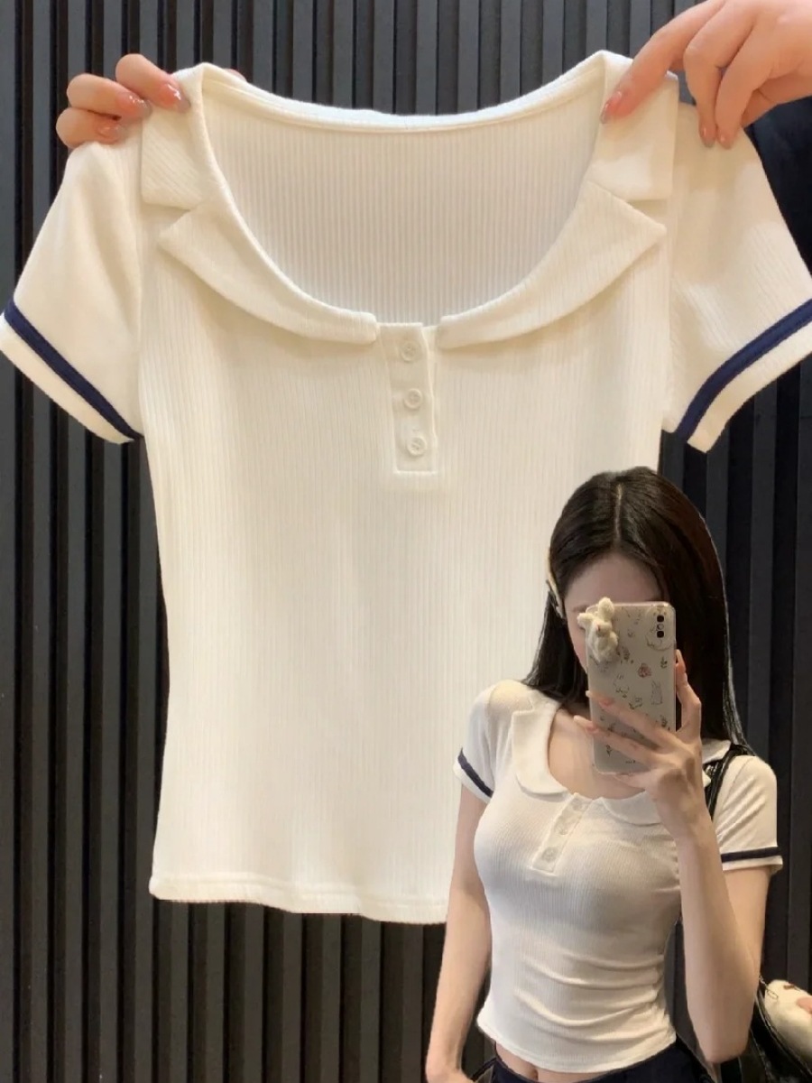 夏季学院风撞色polo翻领T恤女甜美修身显瘦短上衣纯欲风短袖