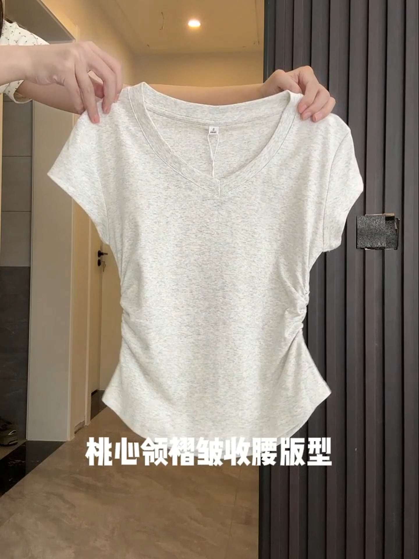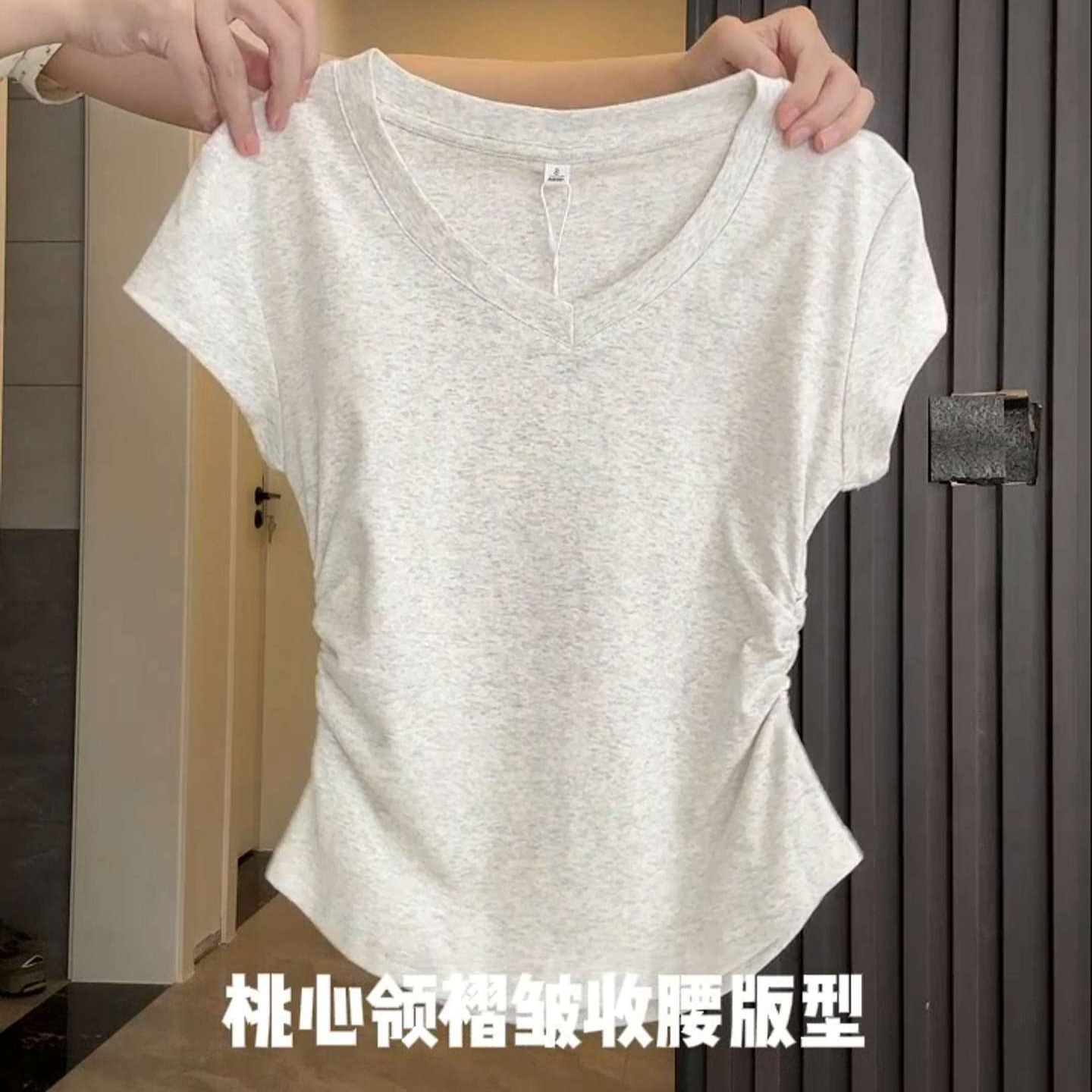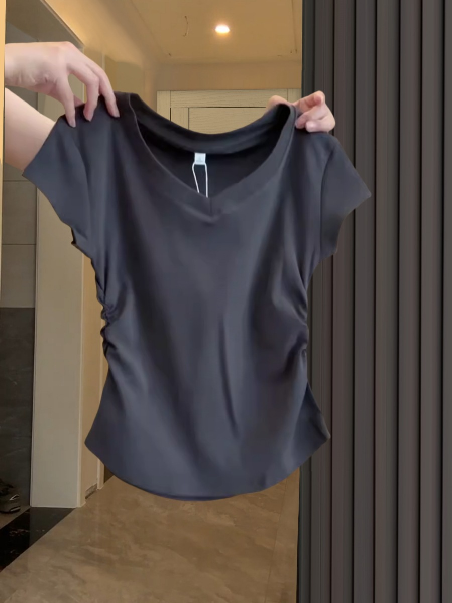 气质V领深灰色正肩短袖女夏季不规则掐腰抽褶T恤辣妹百搭上衣