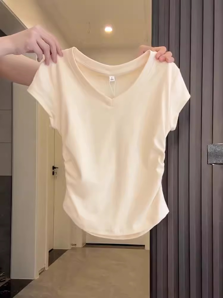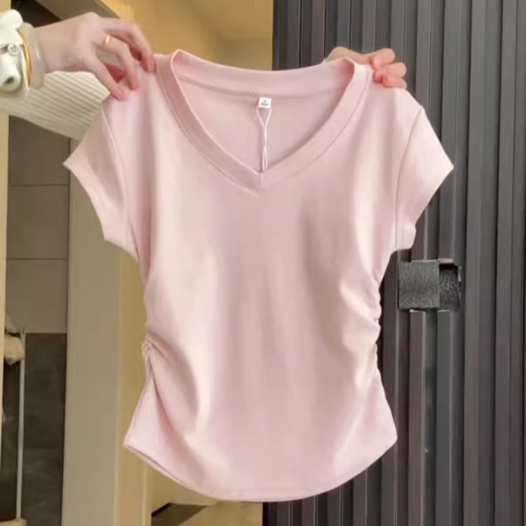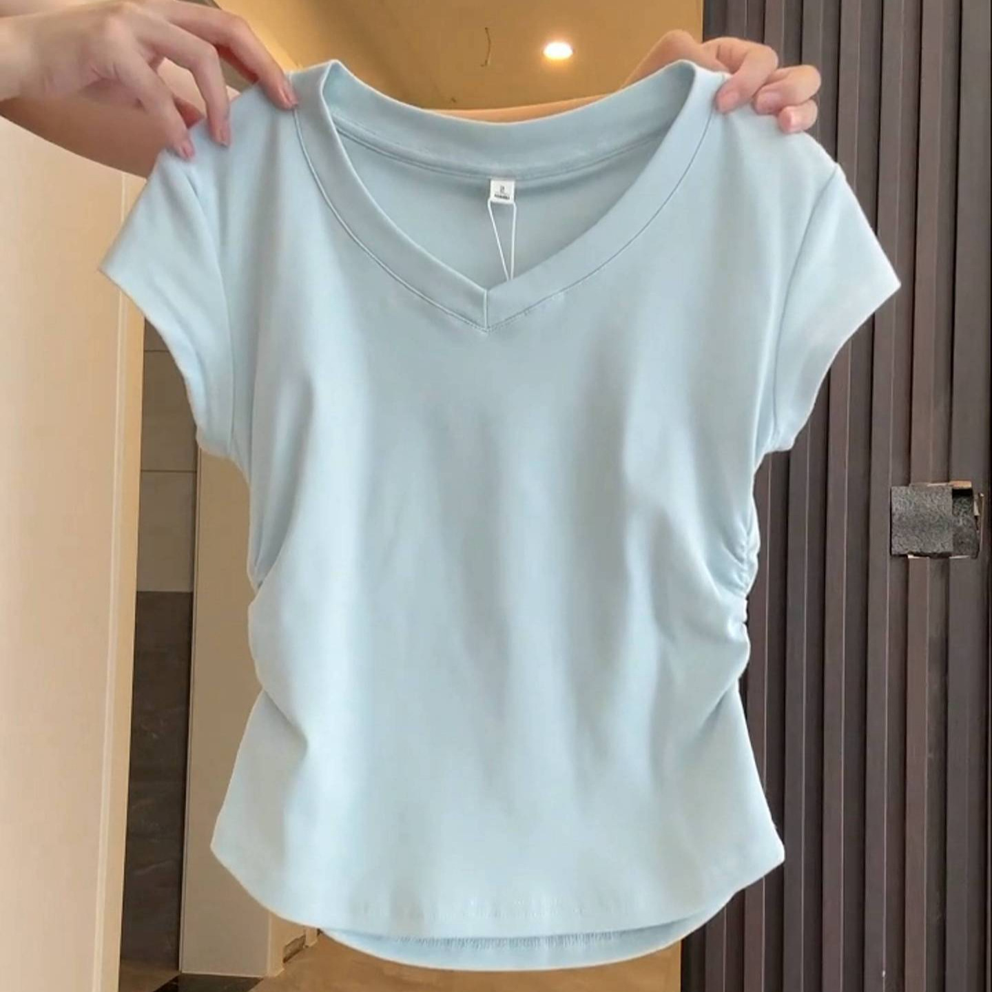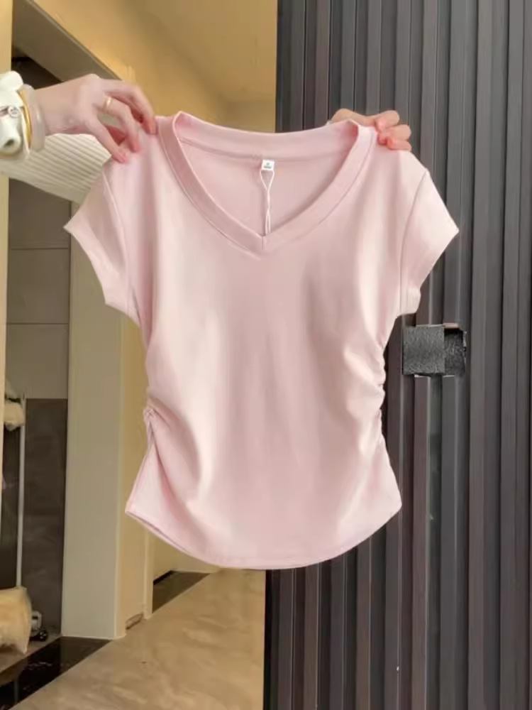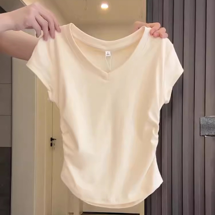 气质V领深灰色正肩短袖女夏季不规则掐腰抽褶T恤辣妹百搭上衣