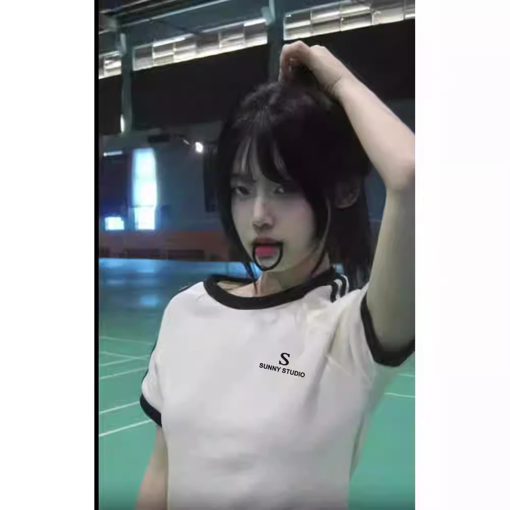 白色正肩圆领短袖T恤女夏季设计感不规则扭结开叉甜辣妹修身上衣