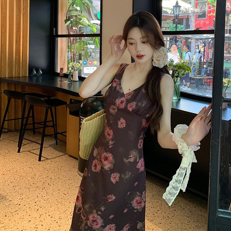 实拍现货~复古优雅V领玫瑰印花修身显瘦连衣裙女夏季无袖背心长裙