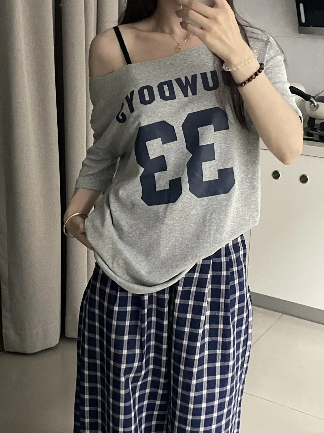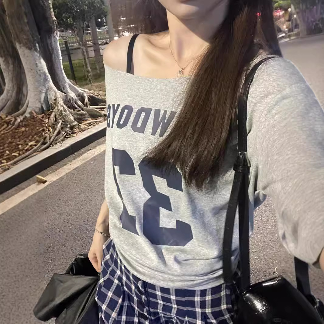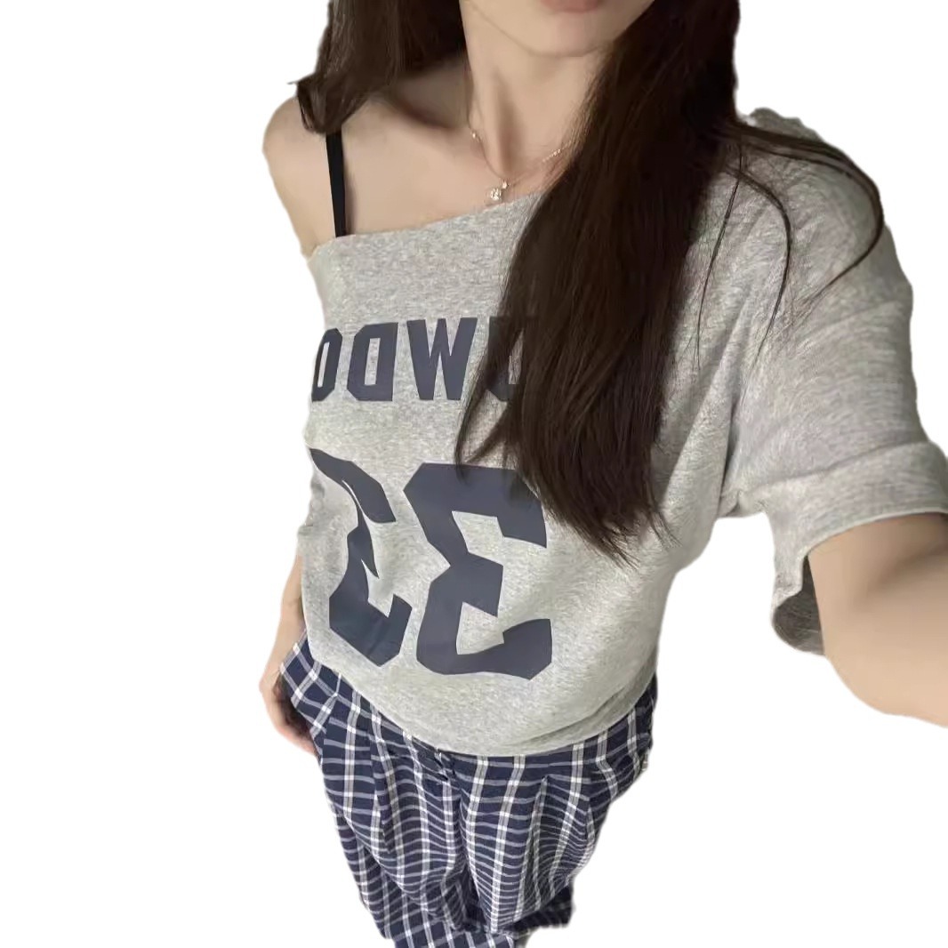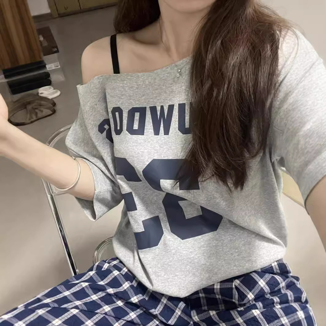 美式复古甜辣斜肩露肩高级感字母印花宽松大版短袖女夏休闲时尚潮