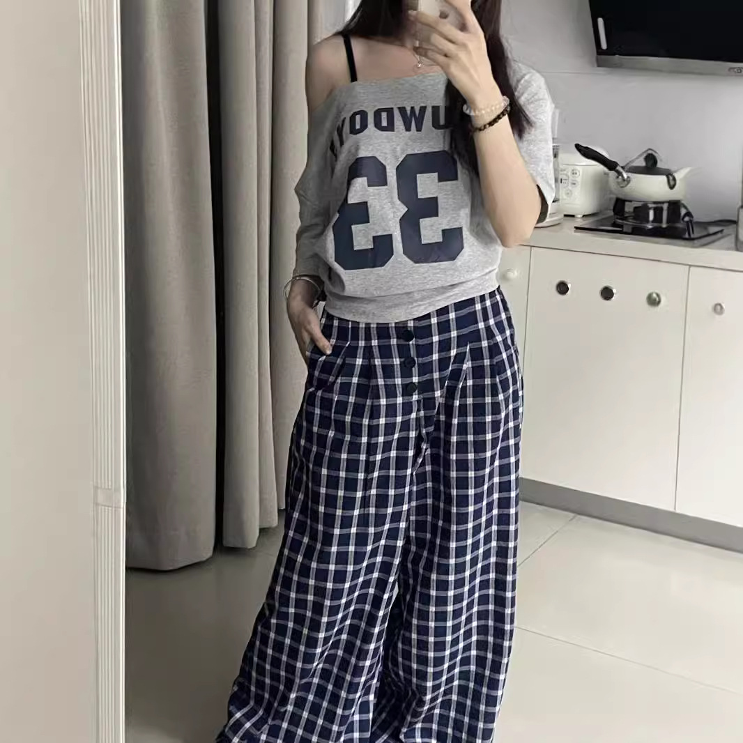 韩版高腰垂感格子阔腿裤女春秋新款宽松显瘦百搭阔腿休闲拖地裤潮
