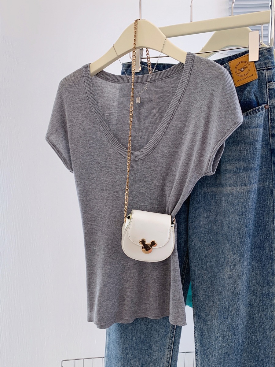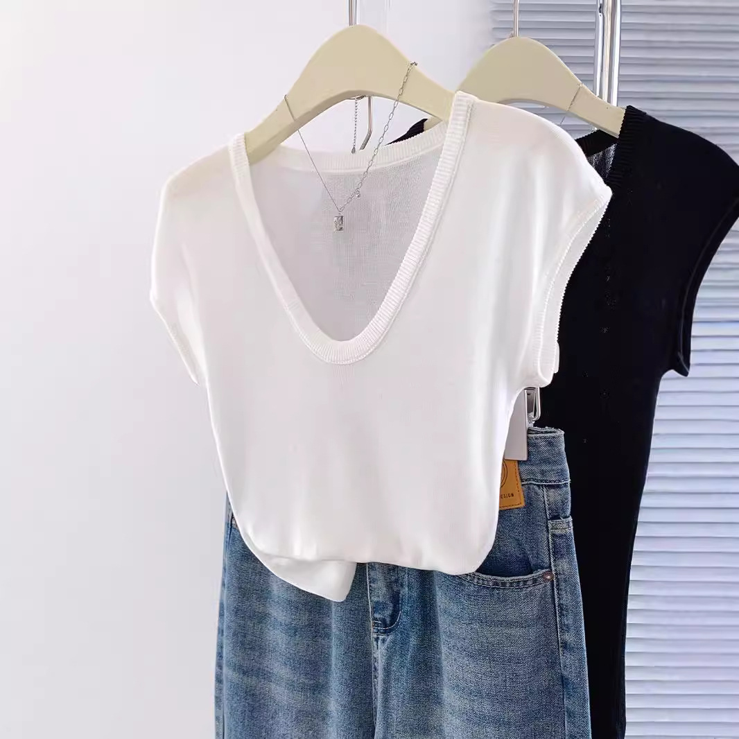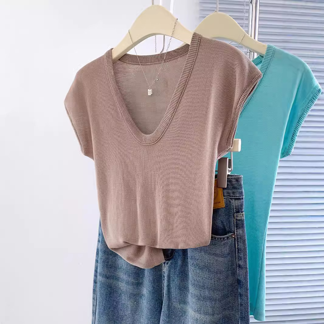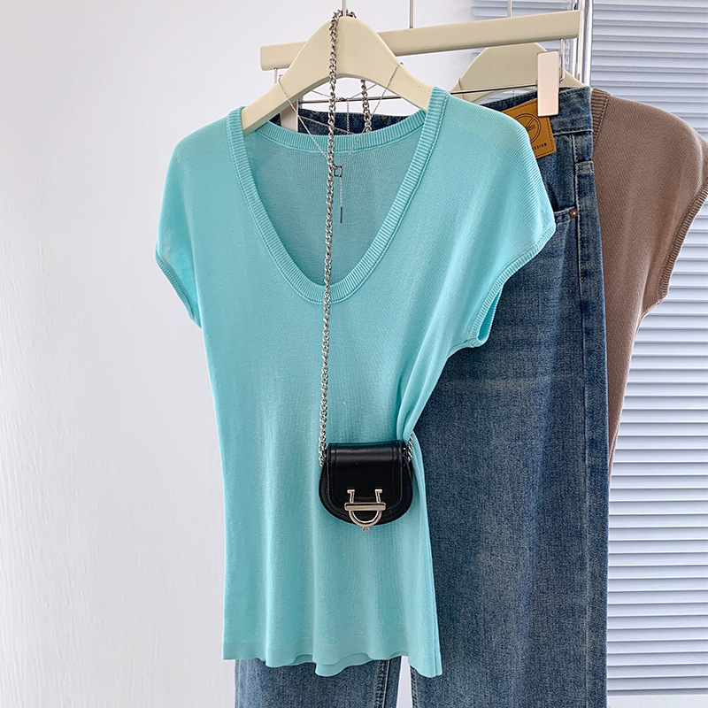 显白奶油蓝U领针织衫短袖女夏季新款冰丝小飞袖修身显瘦洋气上衣