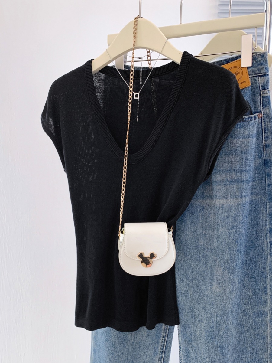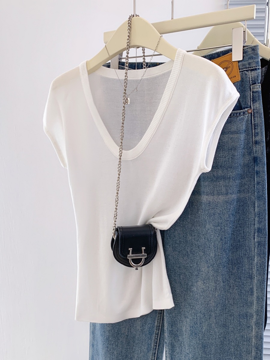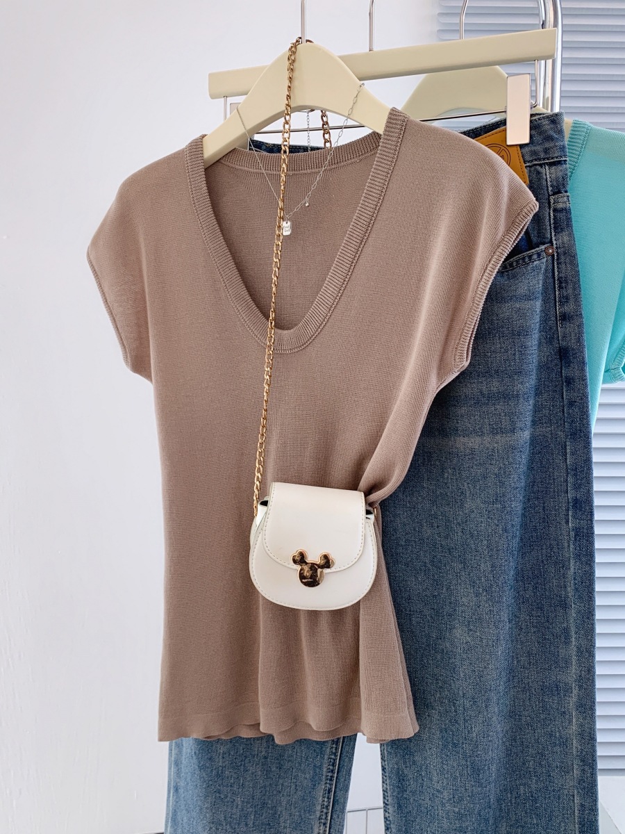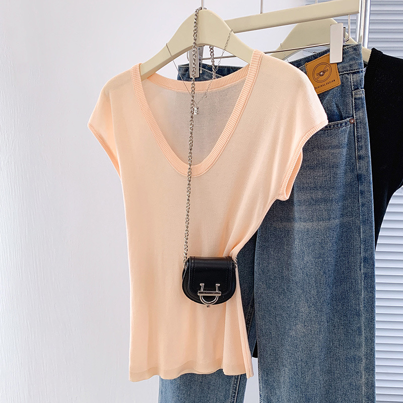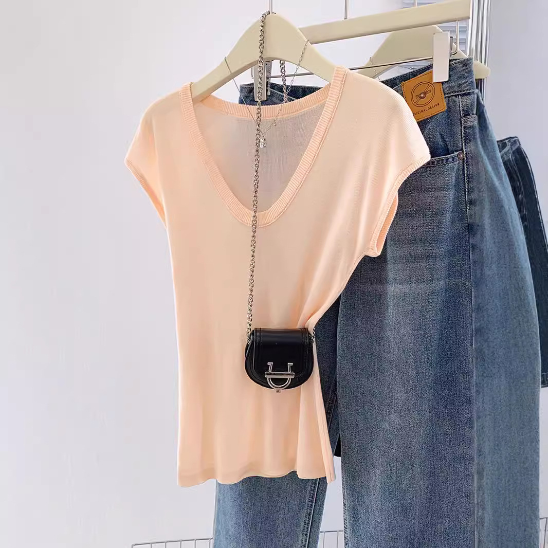 显白奶油蓝U领针织衫短袖女夏季新款冰丝小飞袖修身显瘦洋气上衣