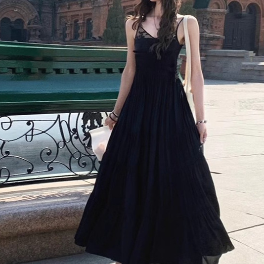 夏季新款 法式两色蕾丝拼接连衣裙女收腰长裙