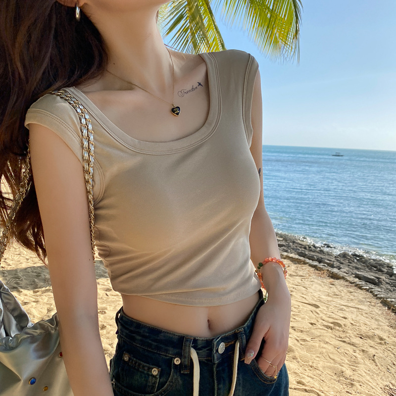 圆领锁骨正肩t恤女短袖夏季高腰短款收腰显瘦辣妹上衣