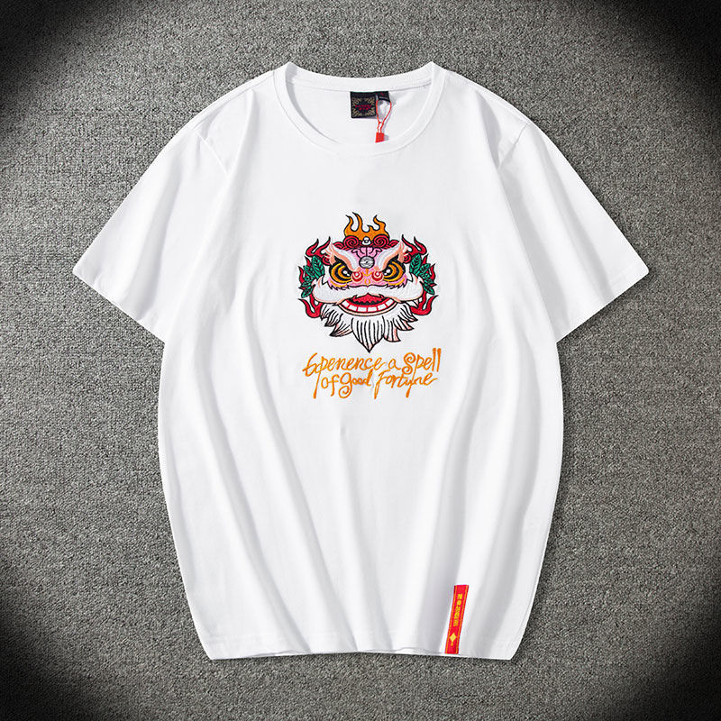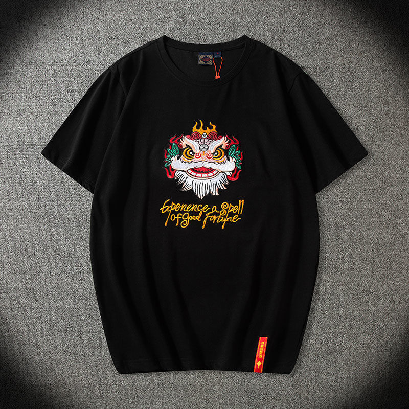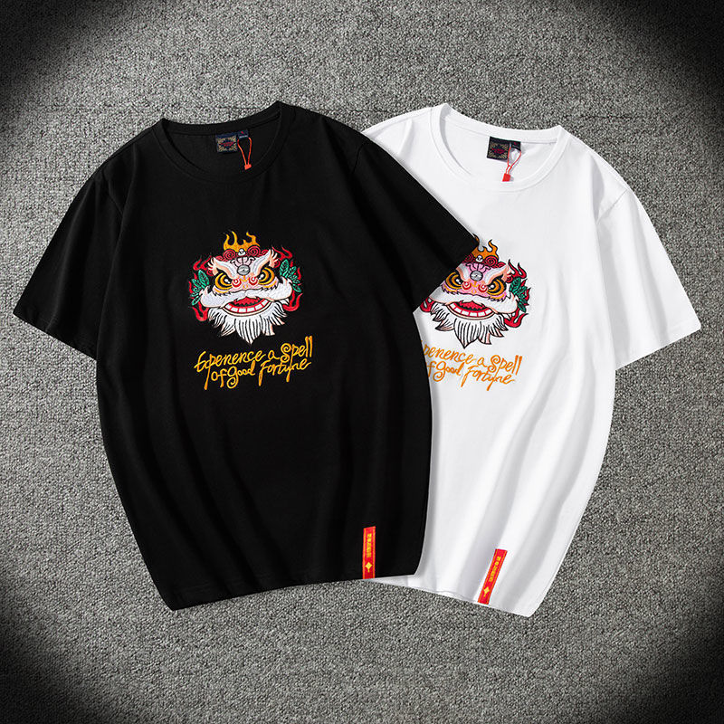 短袖男棉t恤醒狮刺绣新款夏季国潮中国风大码圆领宽松情侣装
