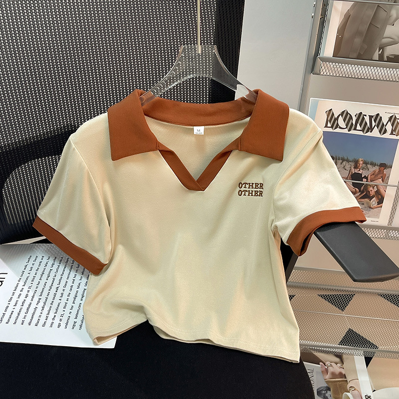 别致小V领撞色正肩短袖夏季新款辣妹港风polo领短款t恤女上衣体恤