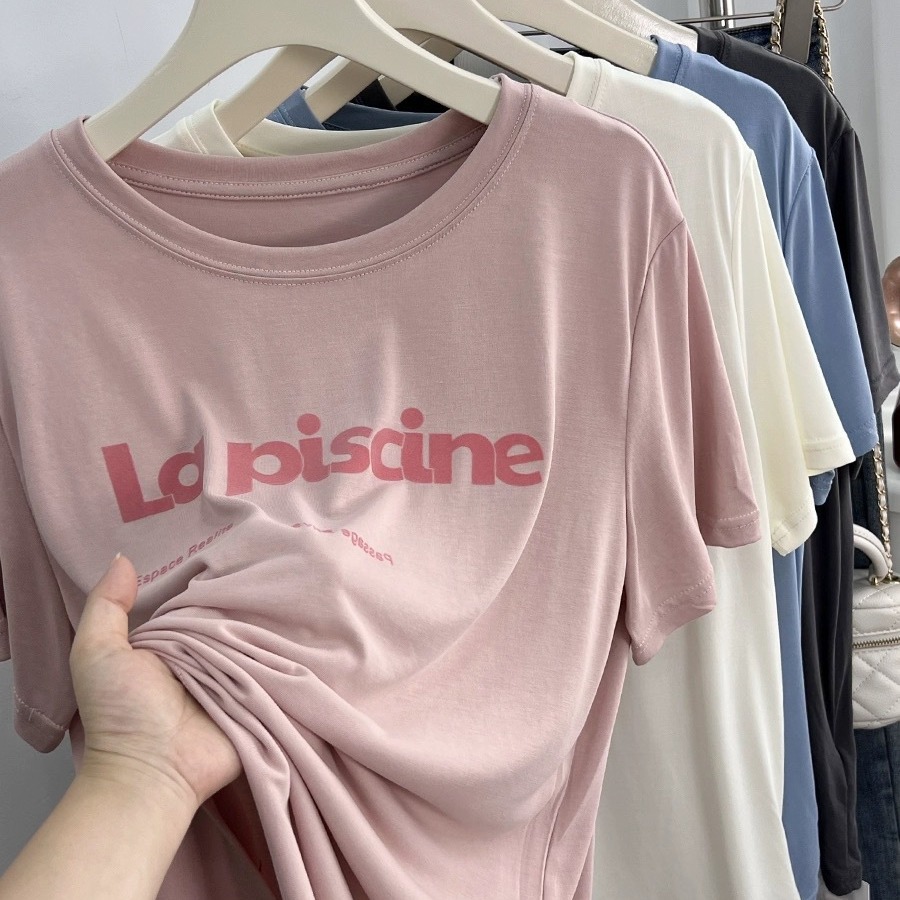 清凉舒适莫代尔粉色短袖t恤女夏季薄款宽松圆领垂感字母面膜上衣