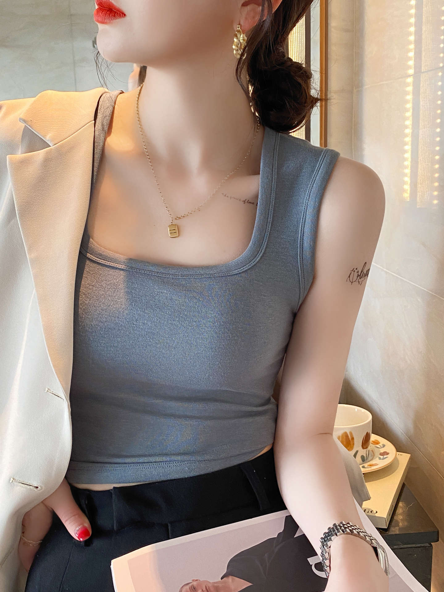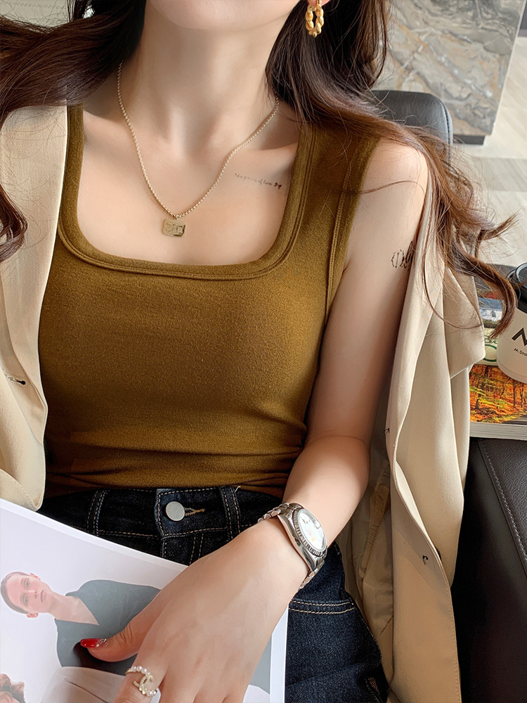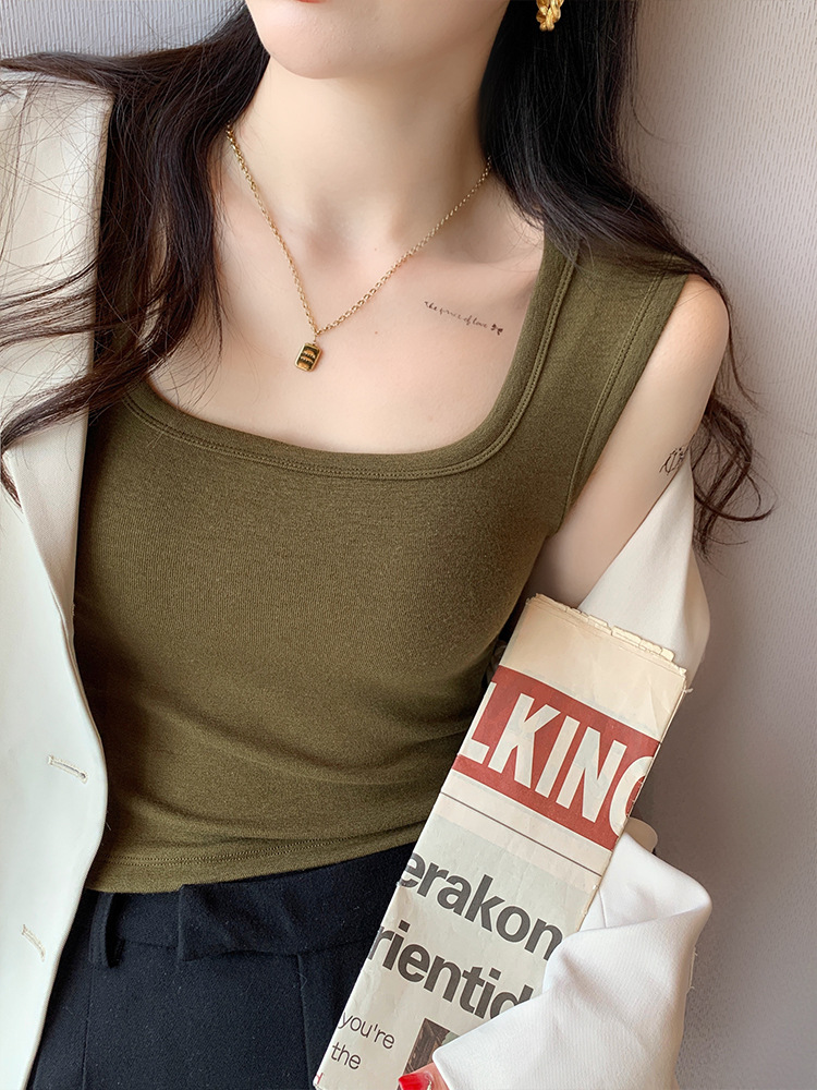 背心女新款蓝色宽肩带方领吊带短款方领打底修身内搭上衣外穿