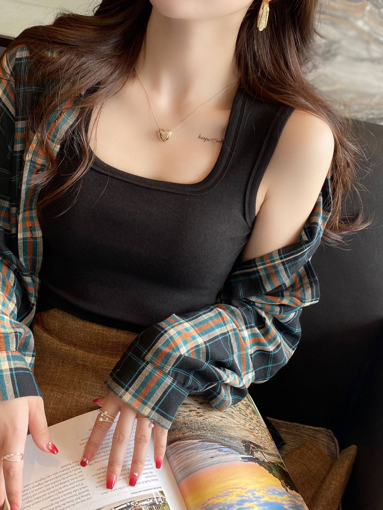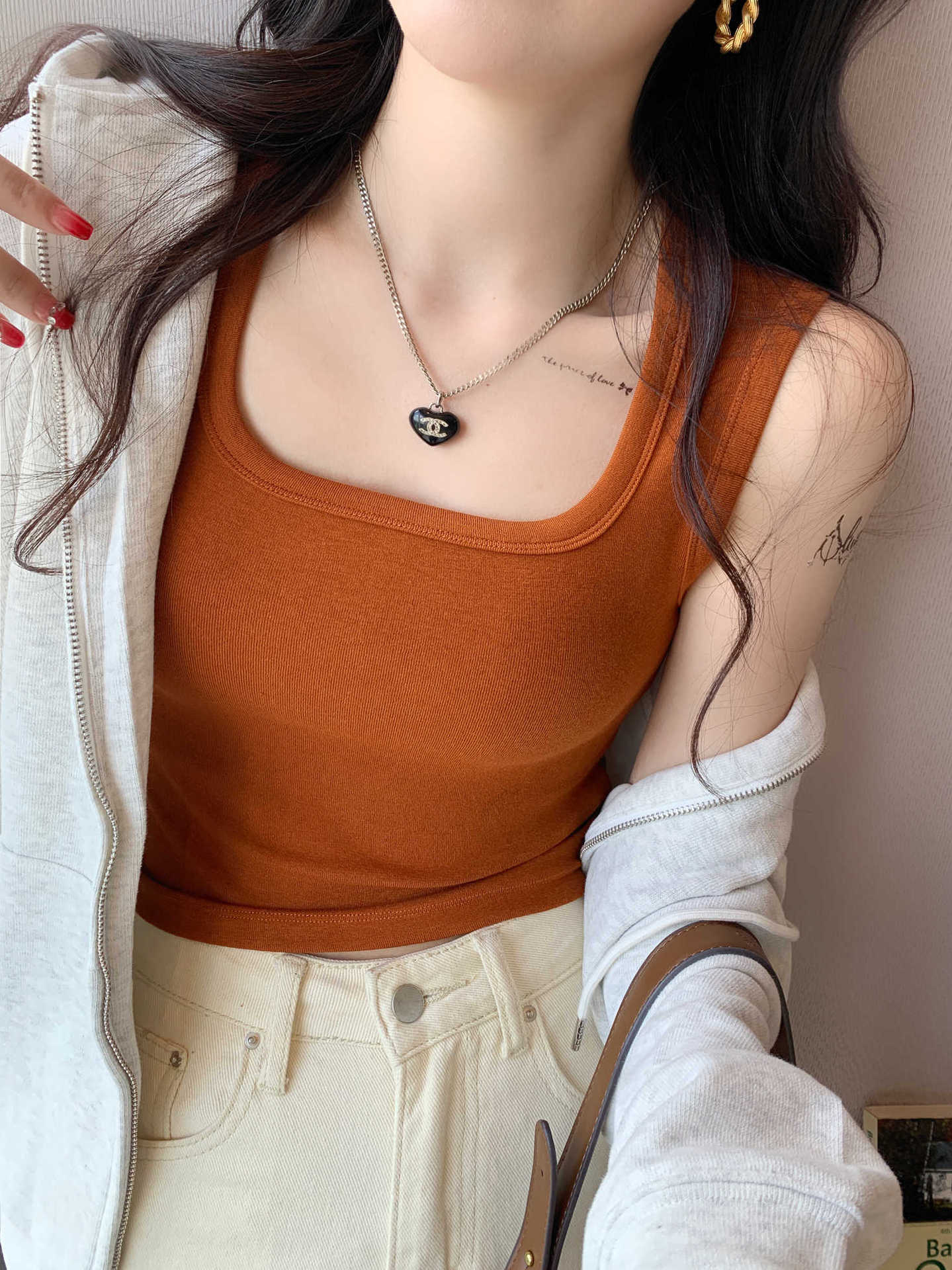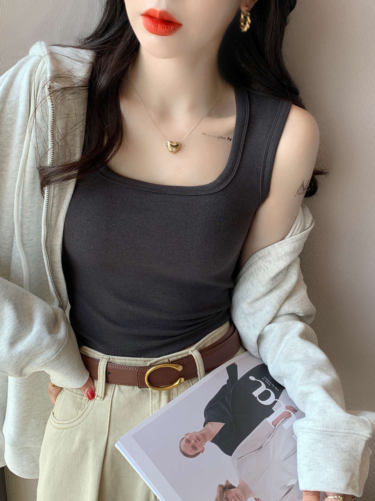 背心女新款蓝色宽肩带方领吊带短款方领打底修身内搭上衣外穿
