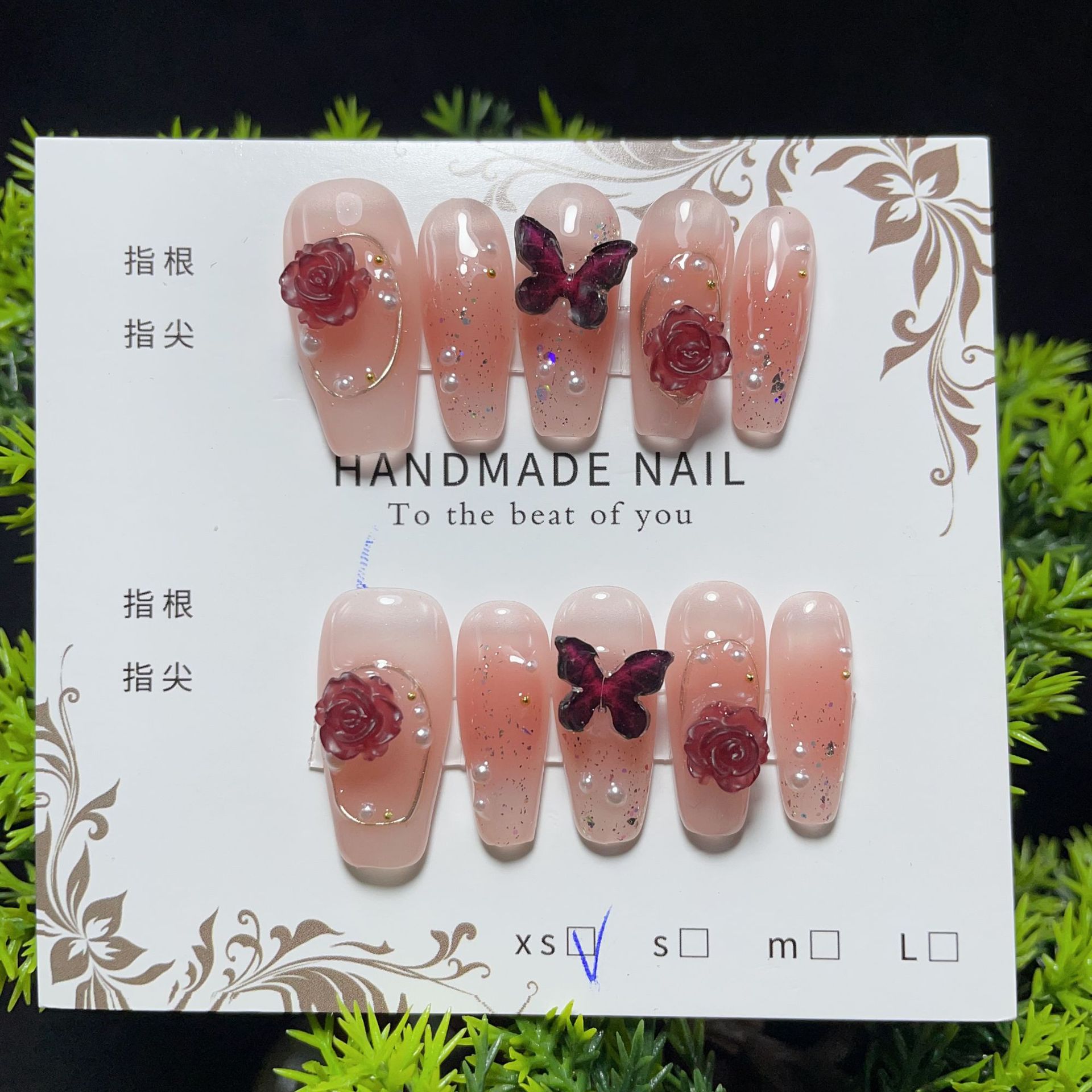 手工穿戴甲乌梅子酱辣妹酒红山茶花蝴蝶假指甲手工穿戴甲贴片