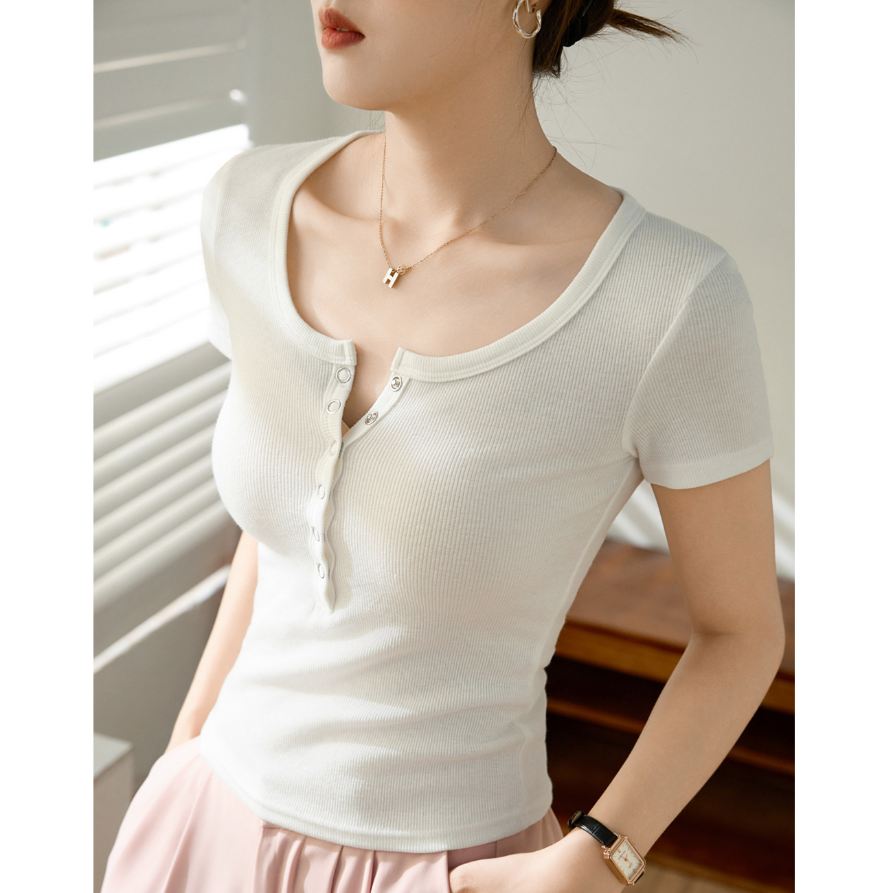 用好料%高级感暗扣短袖T恤女夏螺纹棉2025新款修身显瘦百搭打底衫