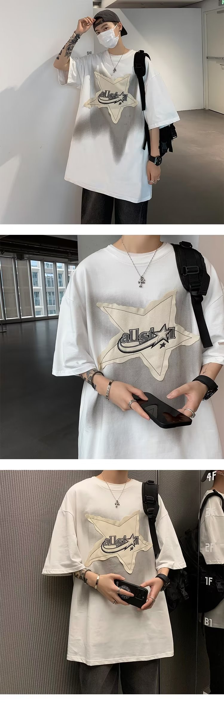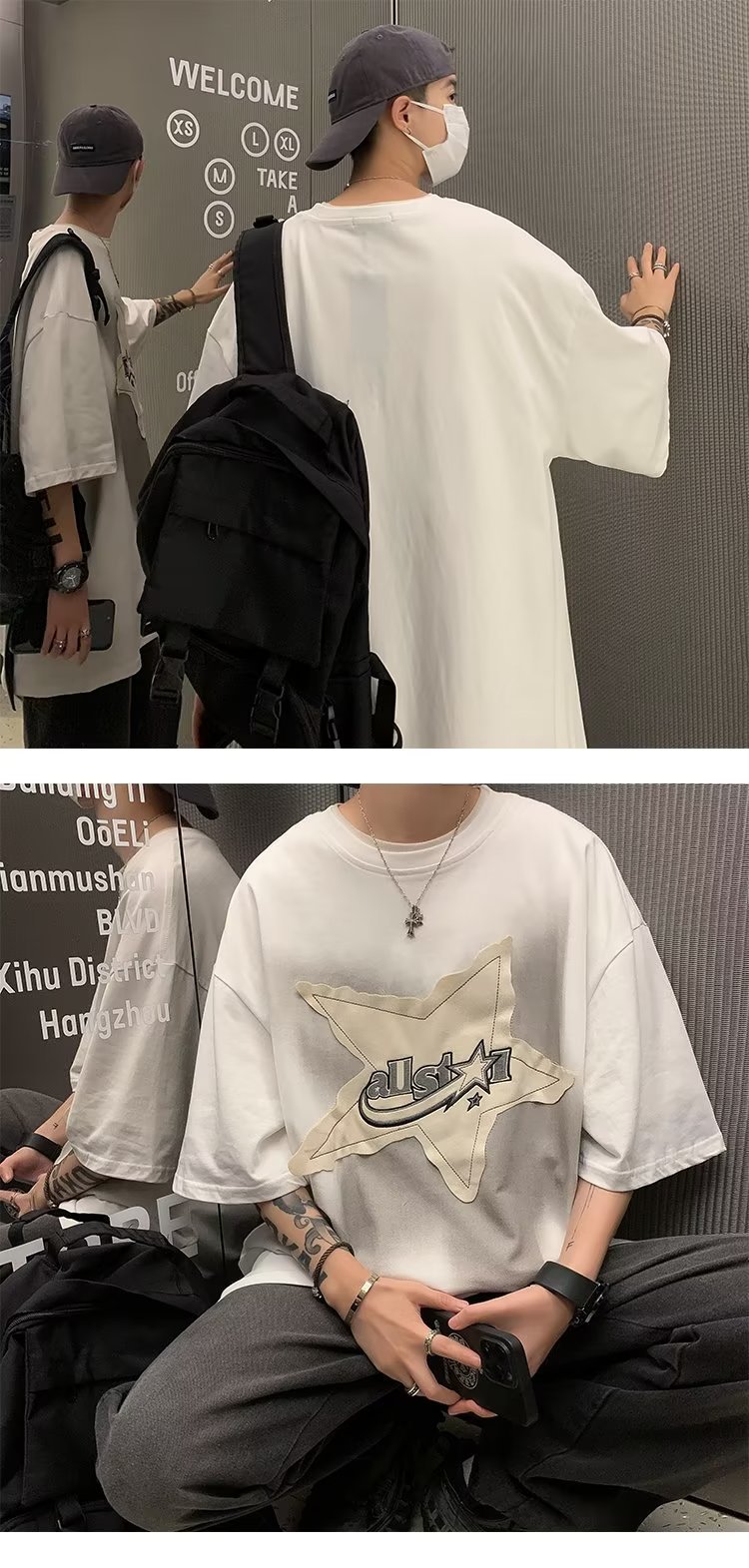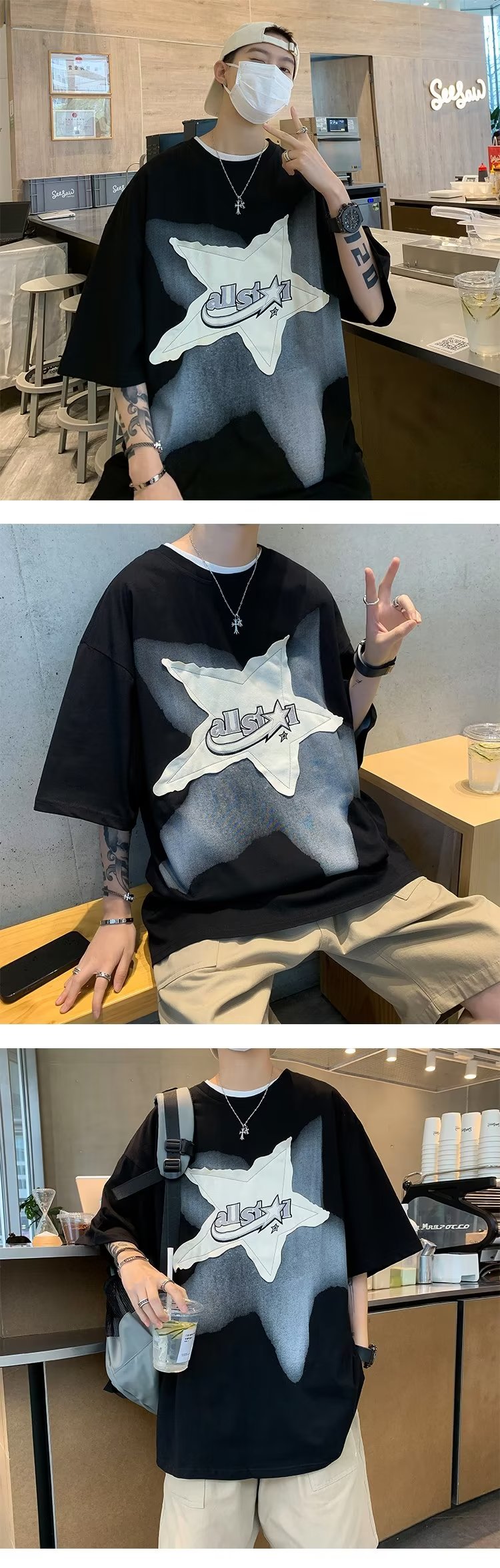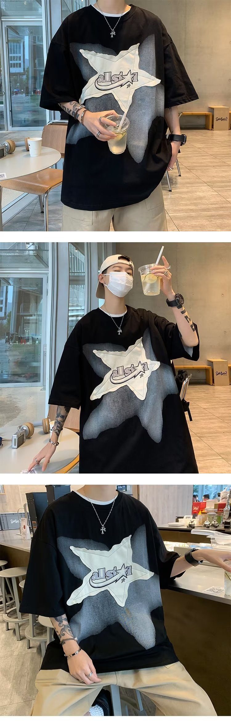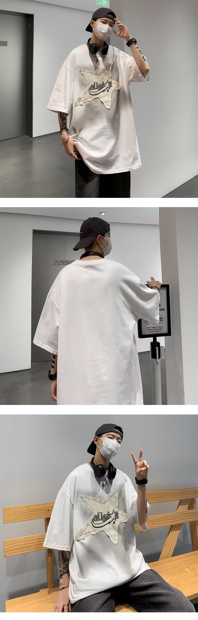 美式复古星星贴布纯棉短袖T恤男潮牌宽松情侣学院风五分袖上衣