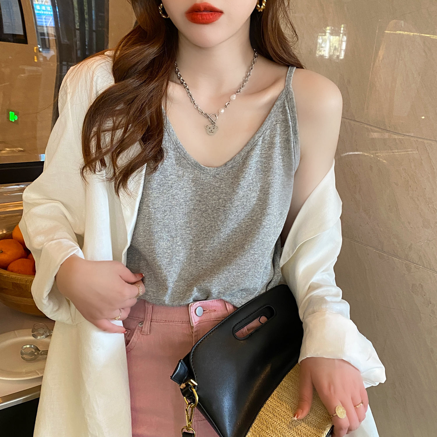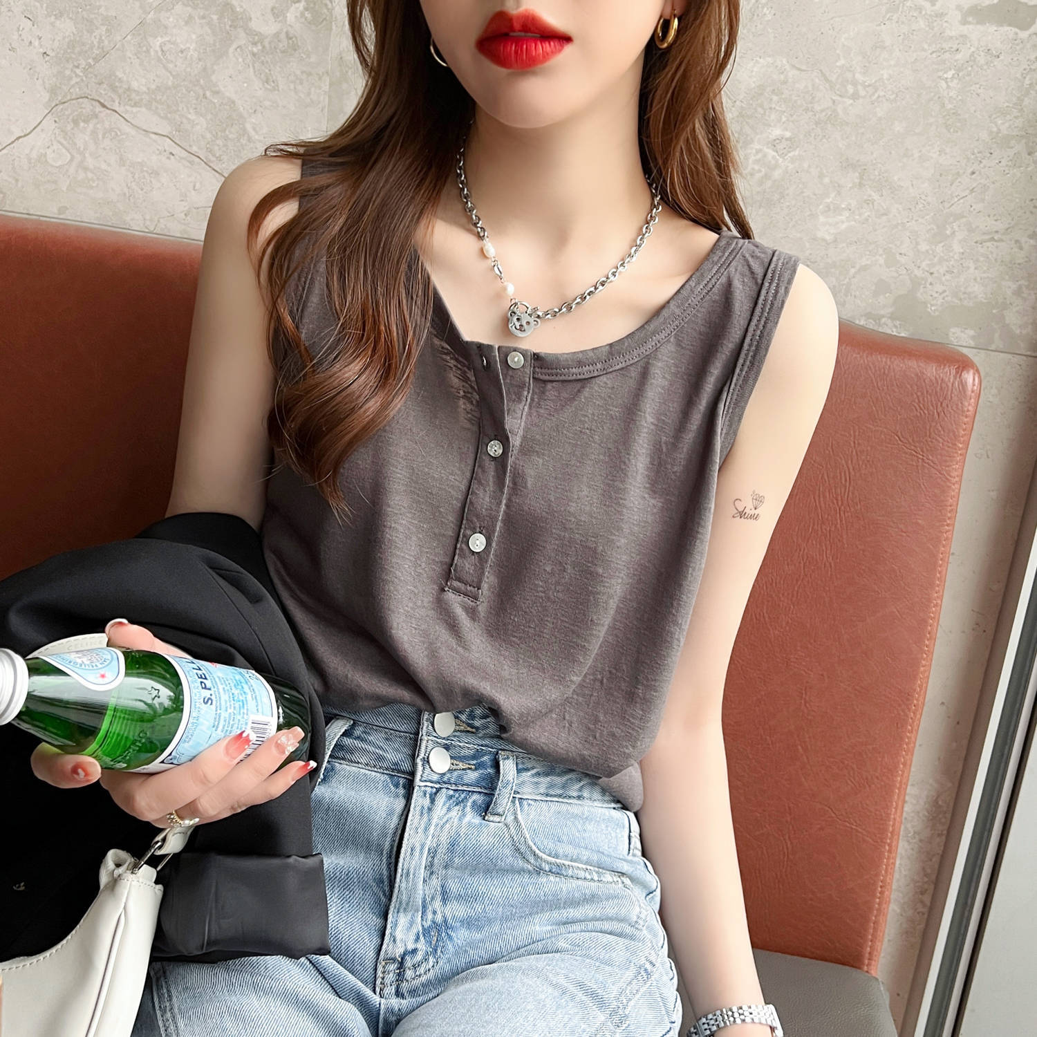 灰色挂脖吊带女夏abg辣妹内搭修身短款美背背心外穿字母刺绣上衣