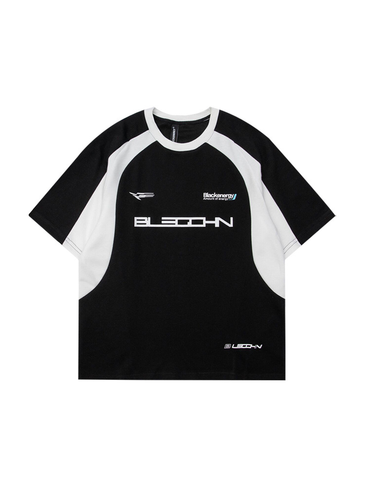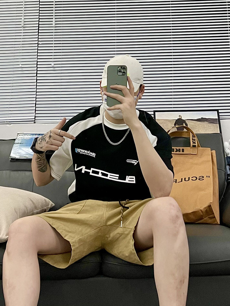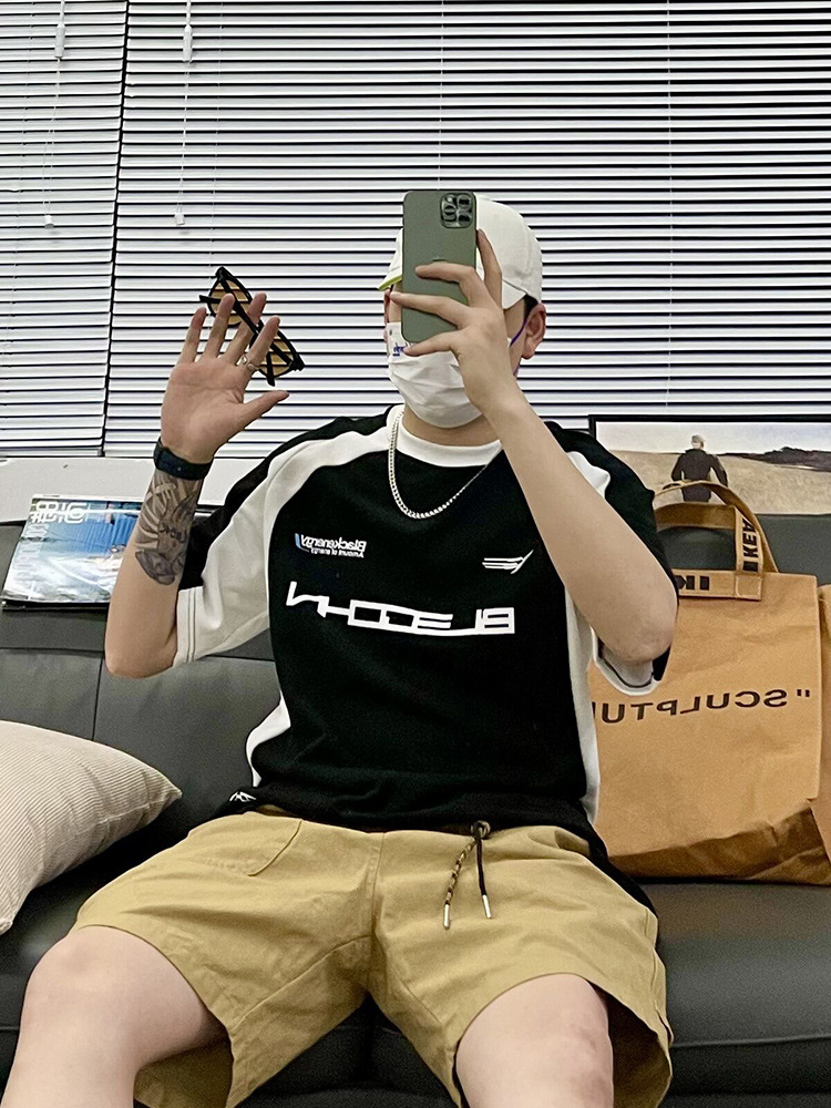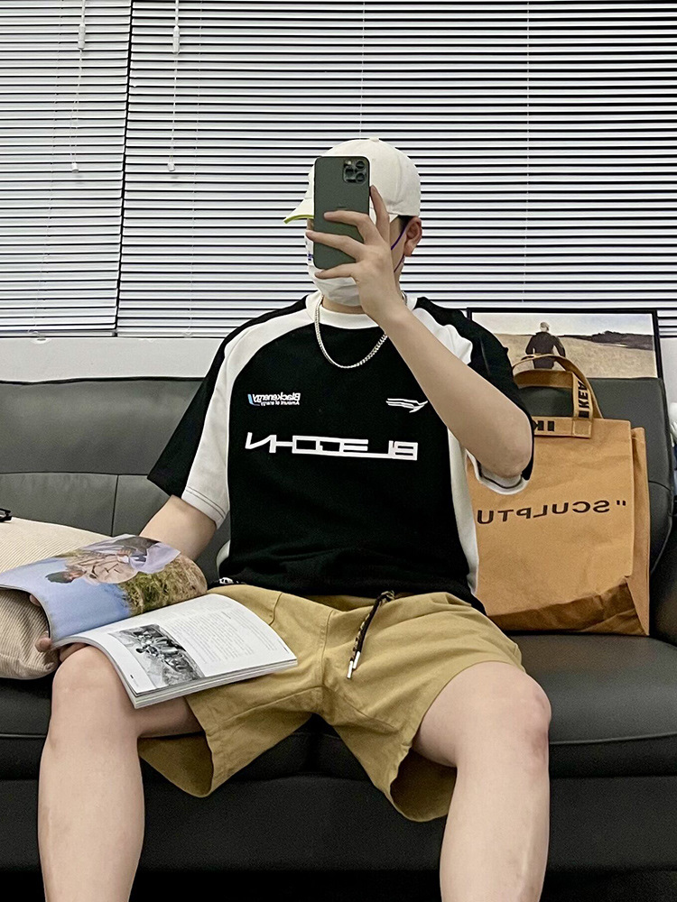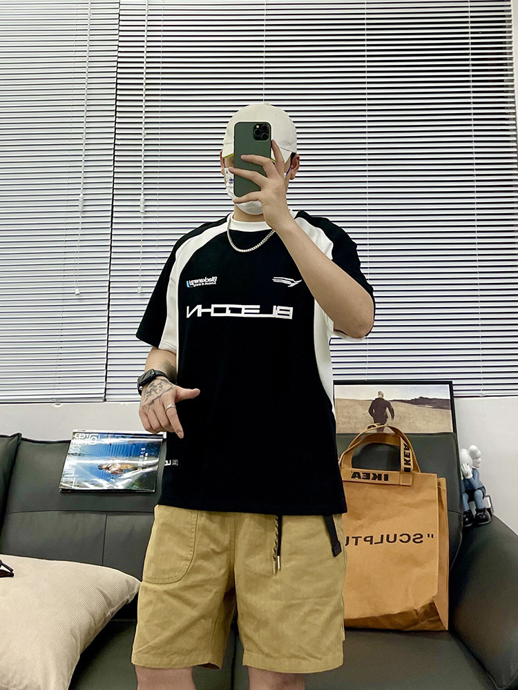 拼色印花短袖t恤男夏季运动落肩袖宽松潮牌体恤圆领半袖国潮上衣