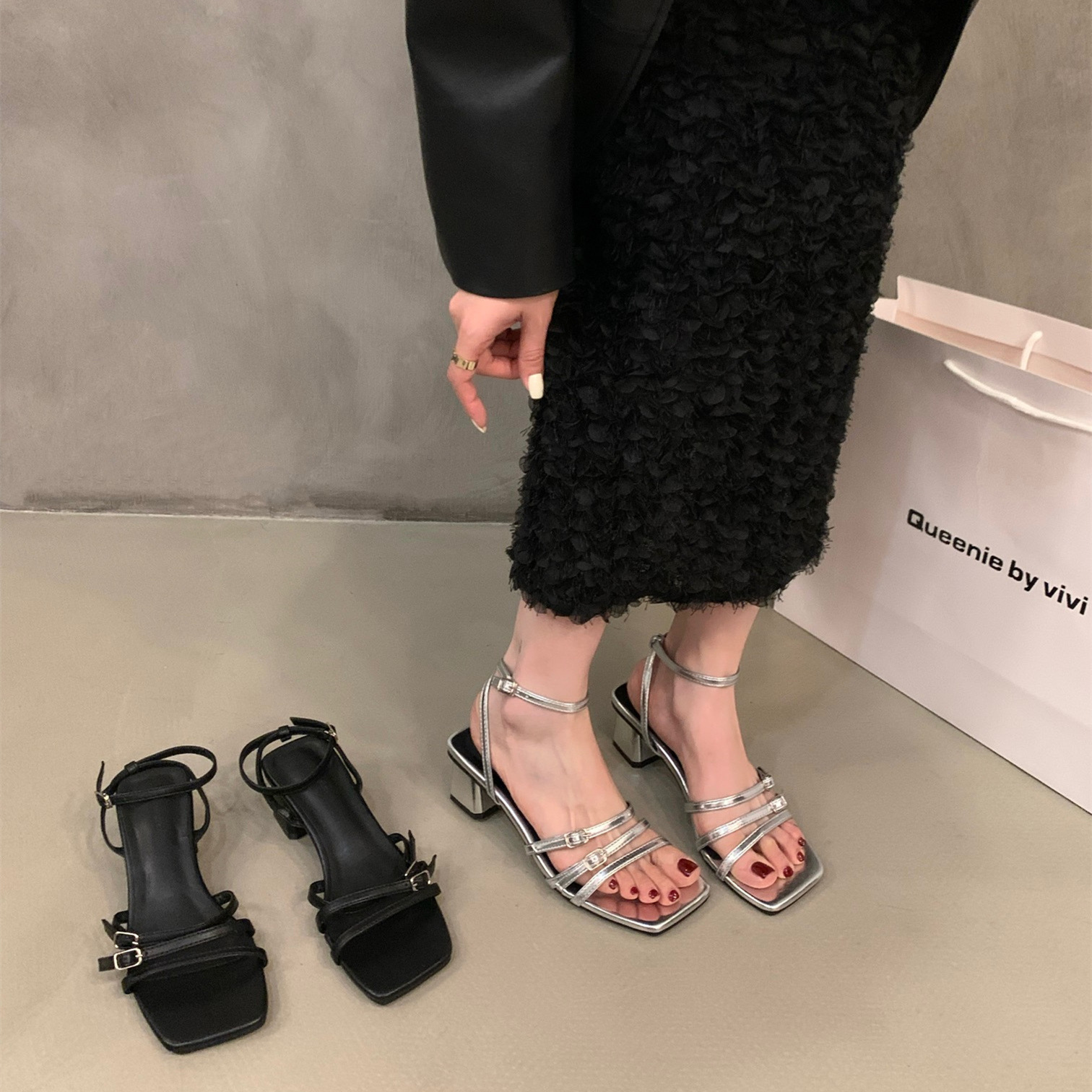 法式中高跟一字带凉鞋仙女鞋子新款夏季气质银色粗跟罗马鞋