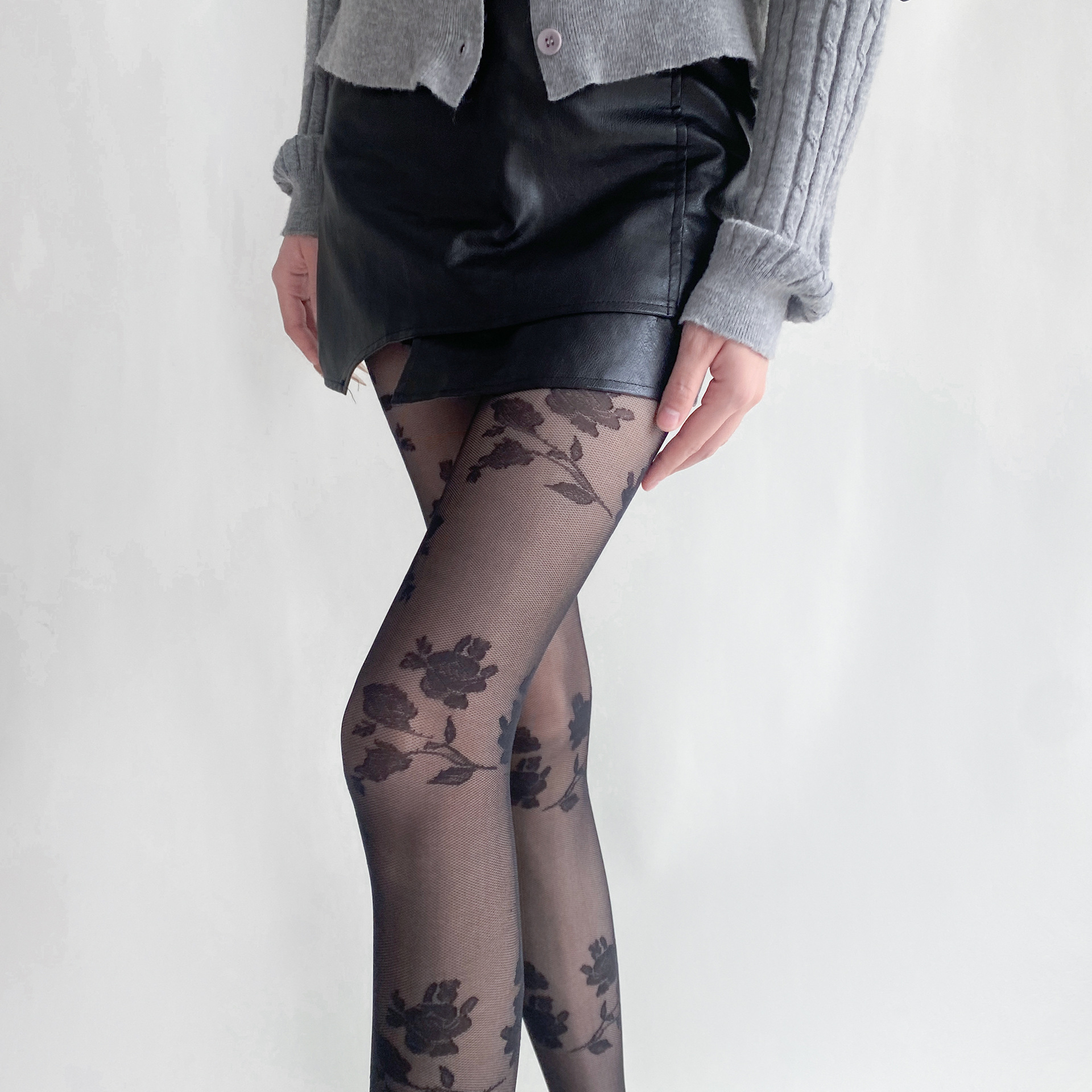 春夏薄款ins复古奶白氨纶玫瑰提花连裤袜超薄透肉暗黑系丝袜
