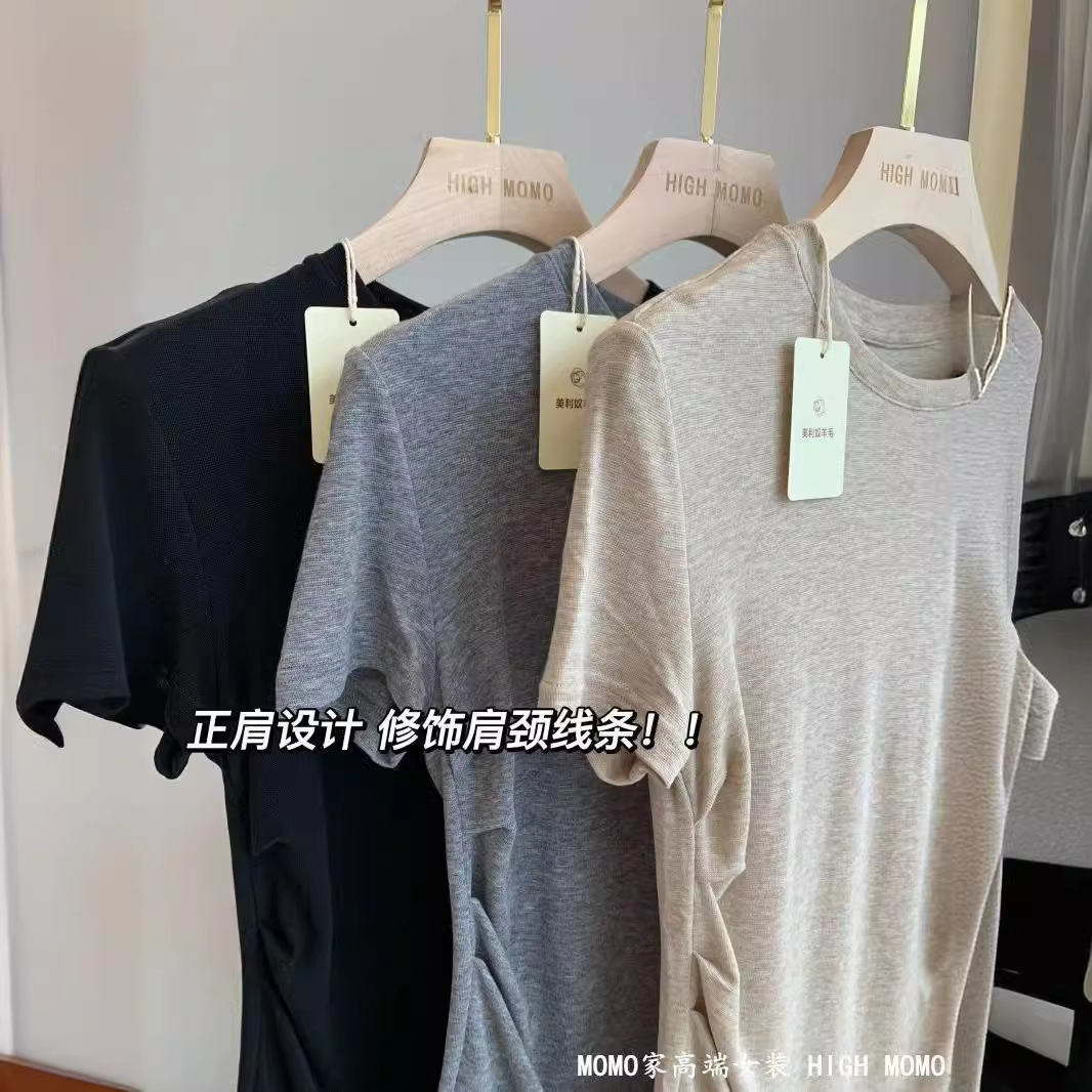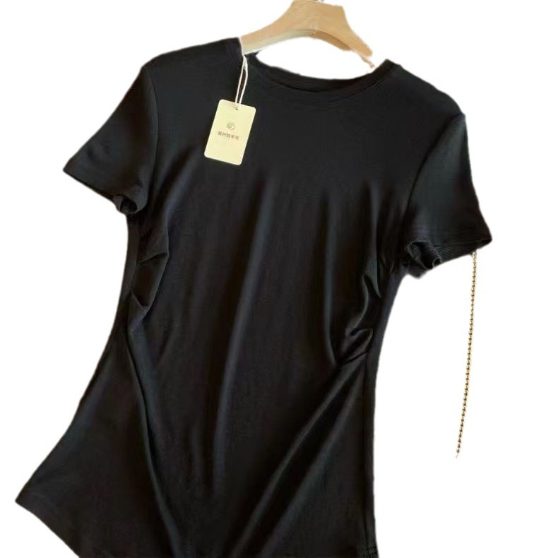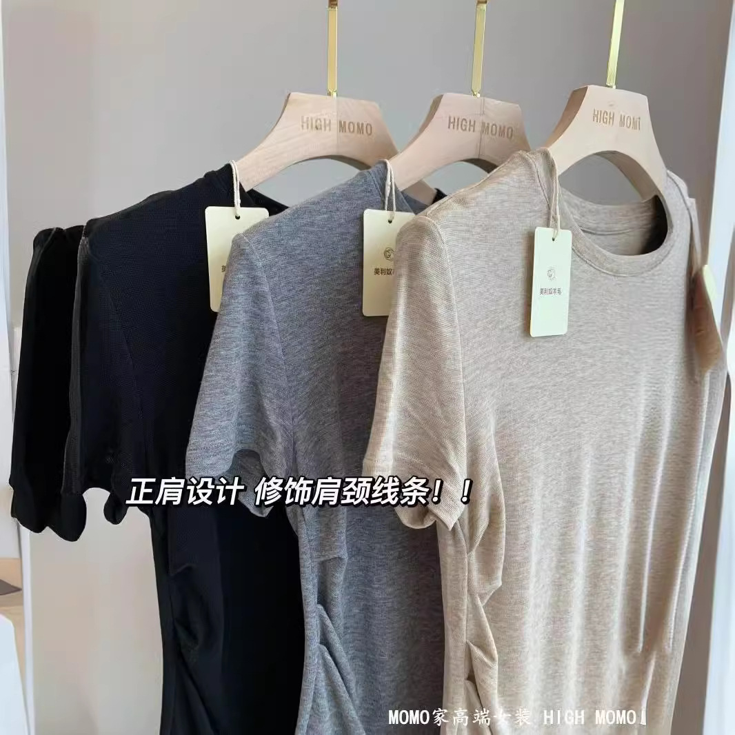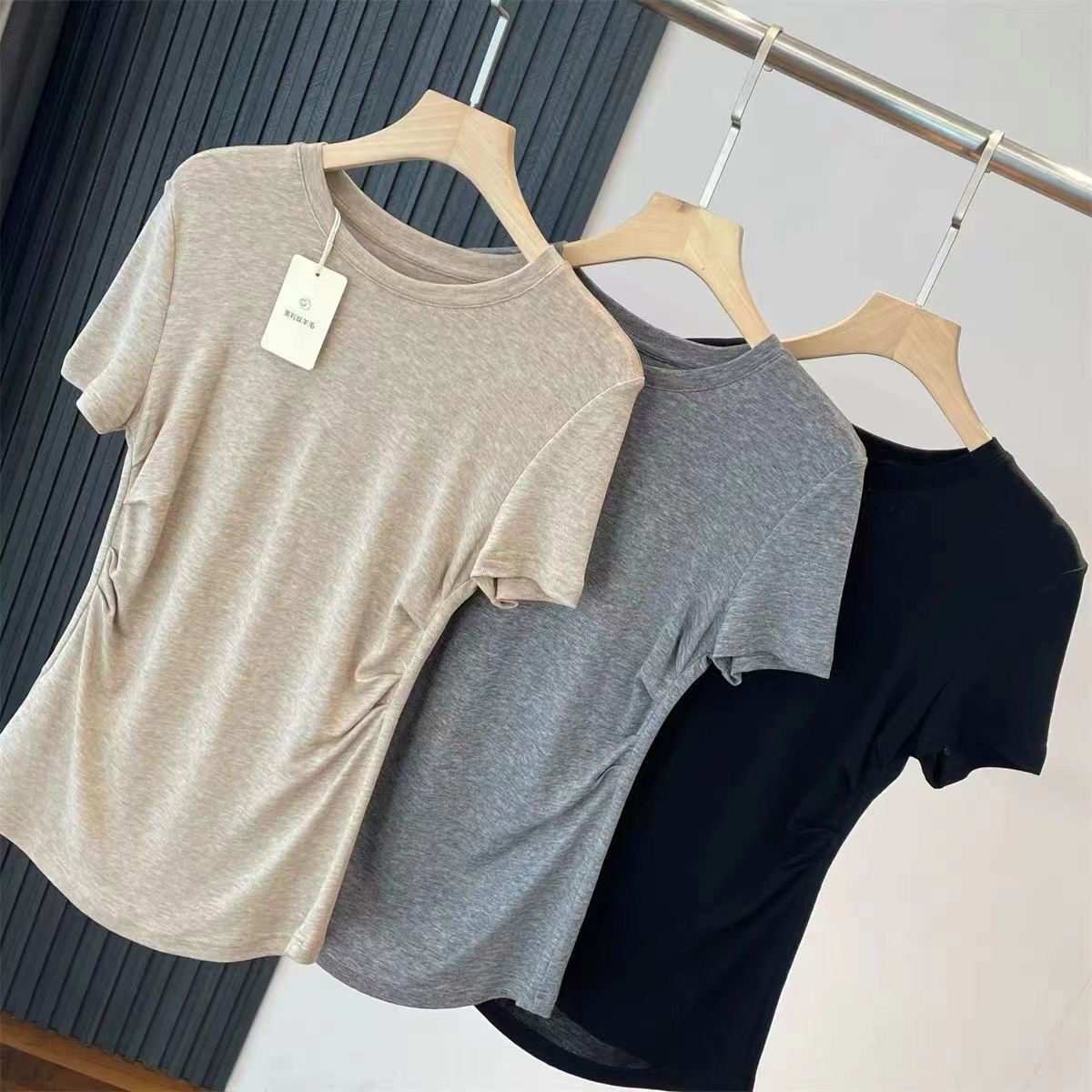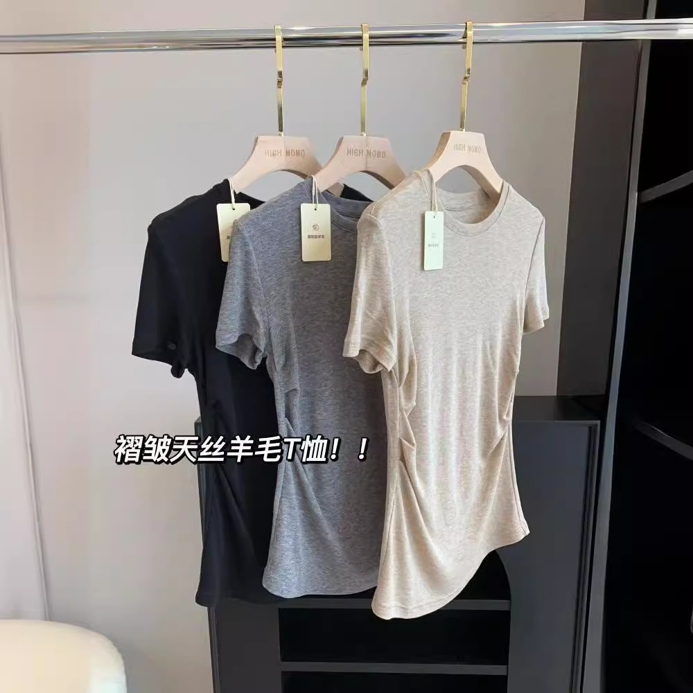 显瘦薄款天丝不规则上衣莱赛尔褶皱收腰修身正肩面膜短袖T恤女夏