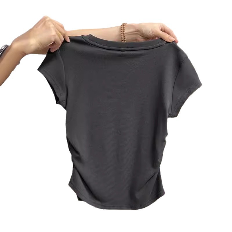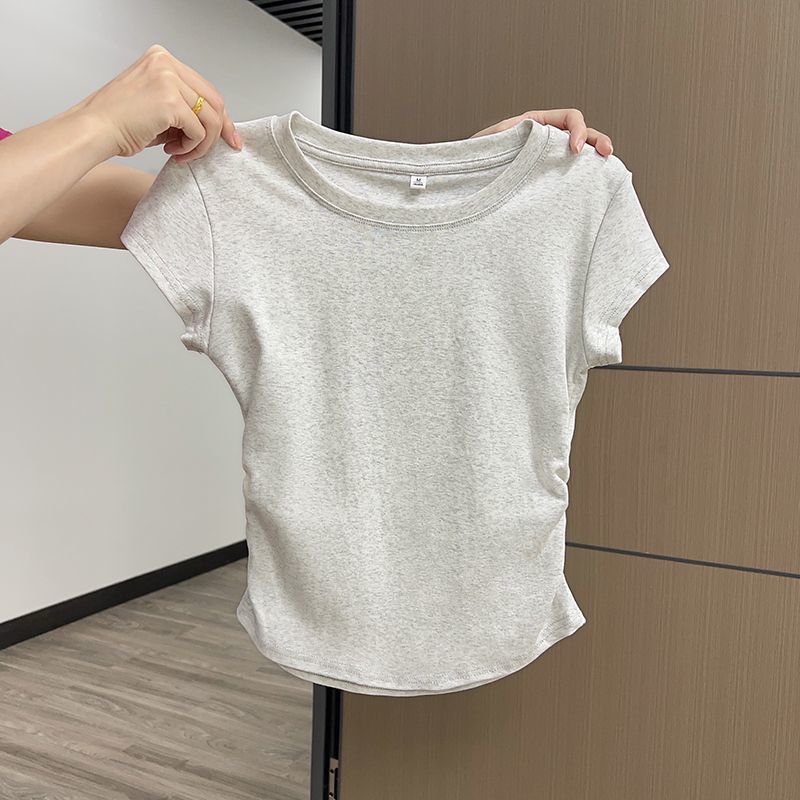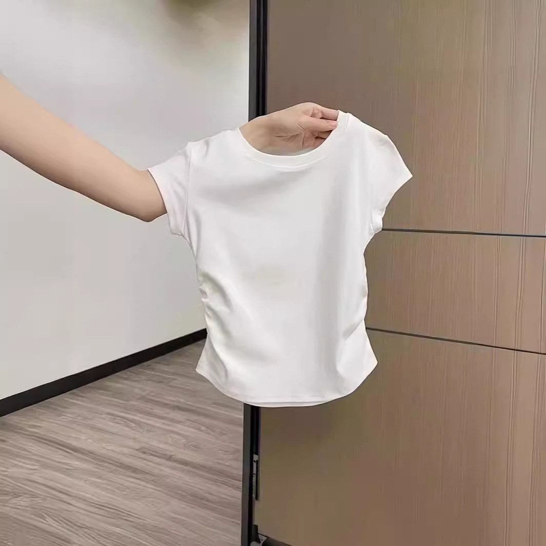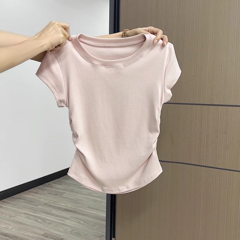 侨芙朵纯棉正肩短袖t恤女辣妹褶皱收腰修身小个子短款多巴胺上衣