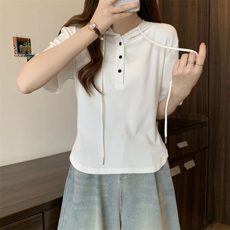 高档夏季韩版新款连帽短袖t恤女显瘦遮肚休闲上衣女打底衫潮