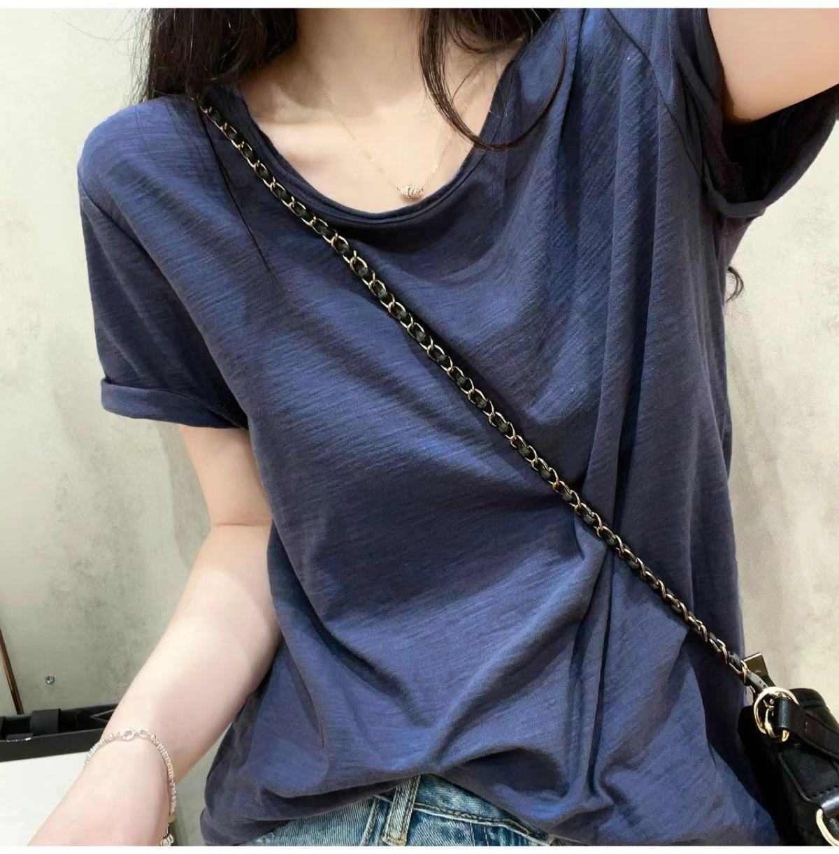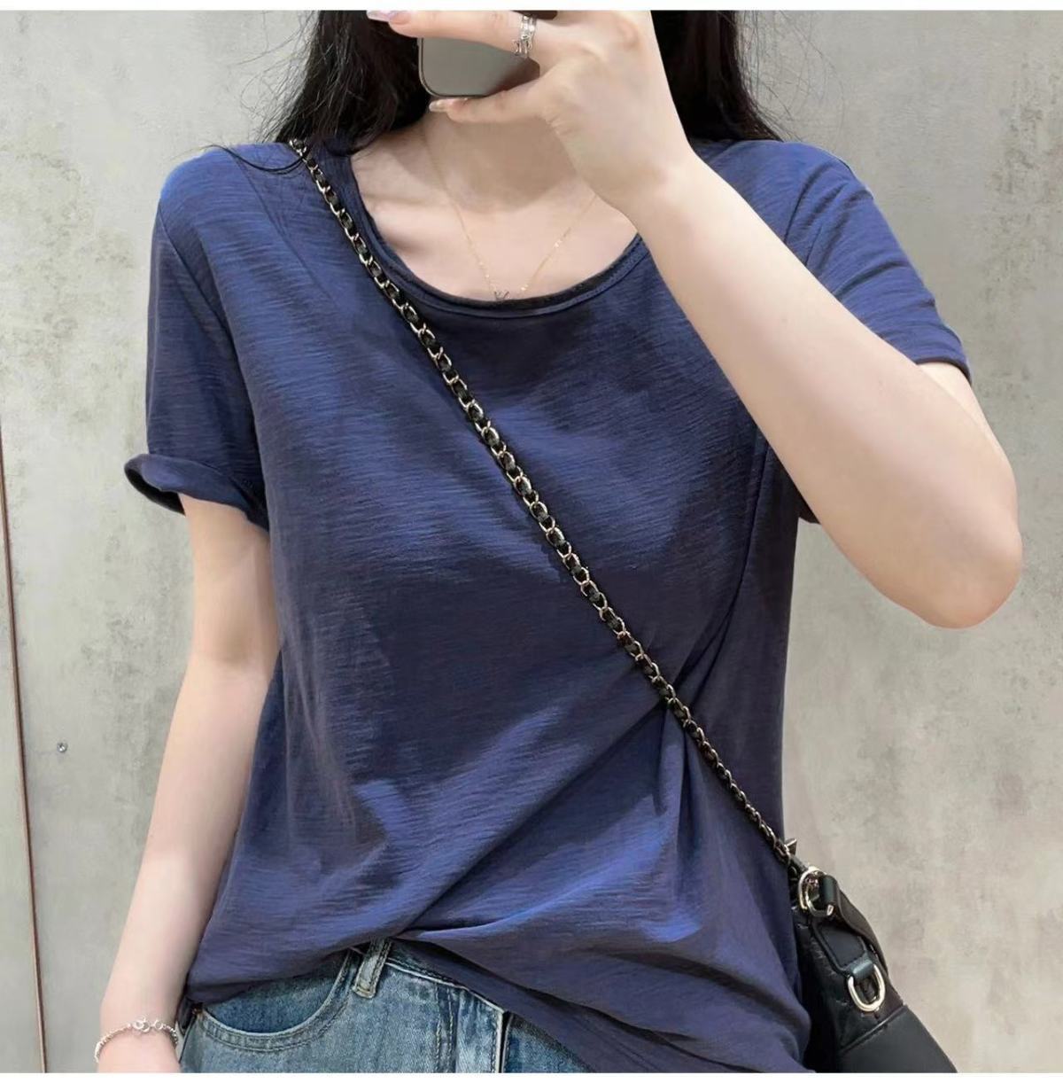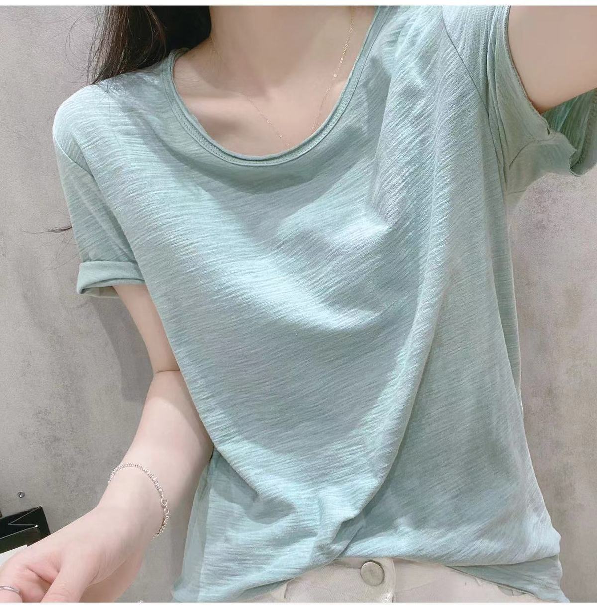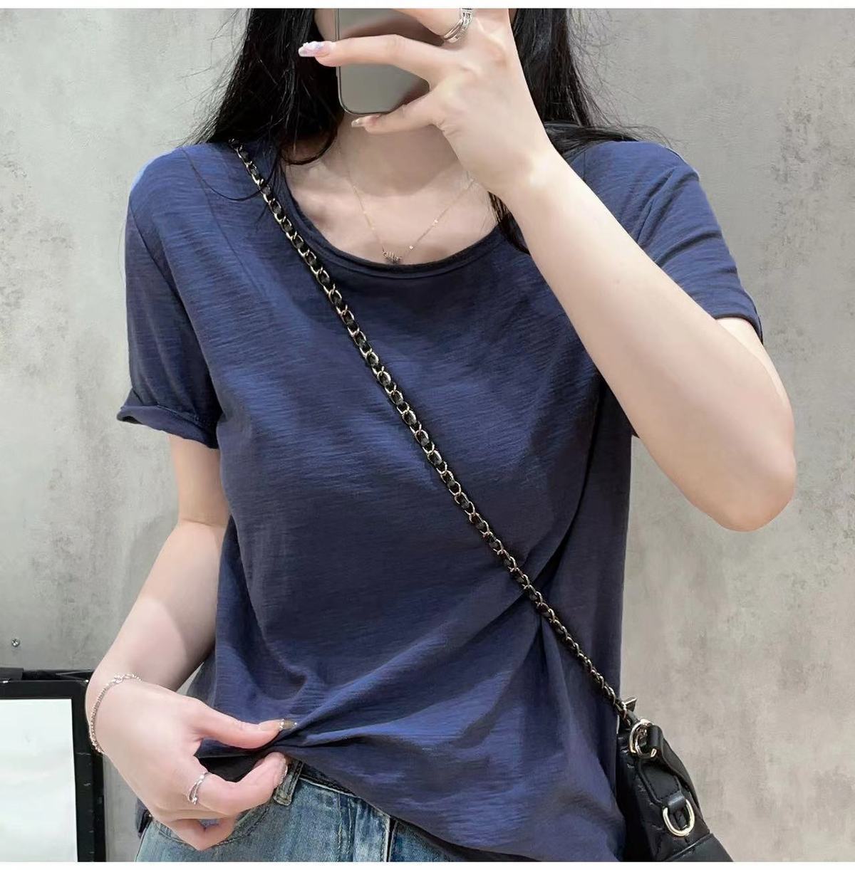 竹节棉卷边短袖t恤女夏季爆款纯棉宽松休闲圆领体恤百搭简约上衣