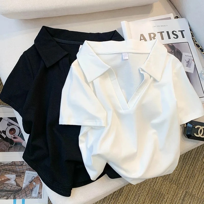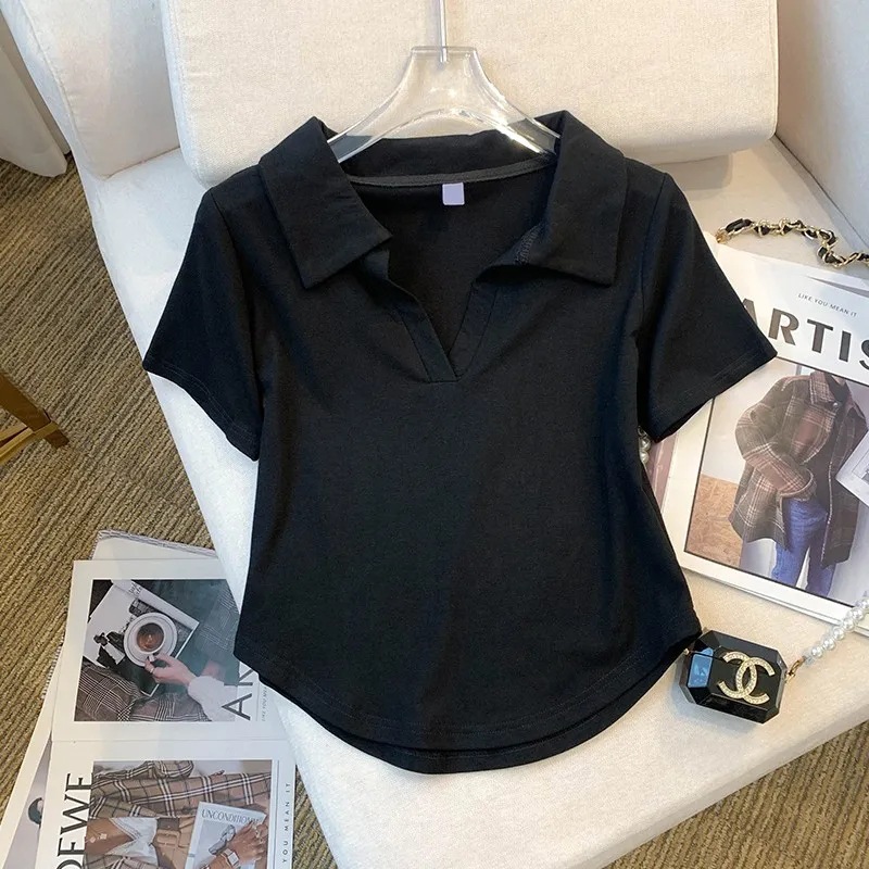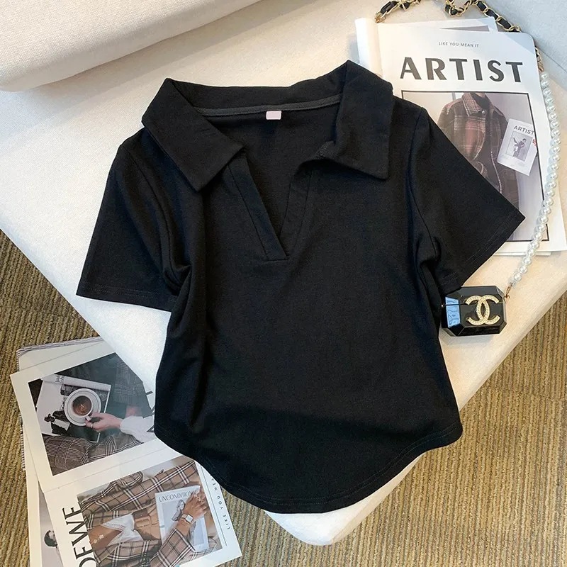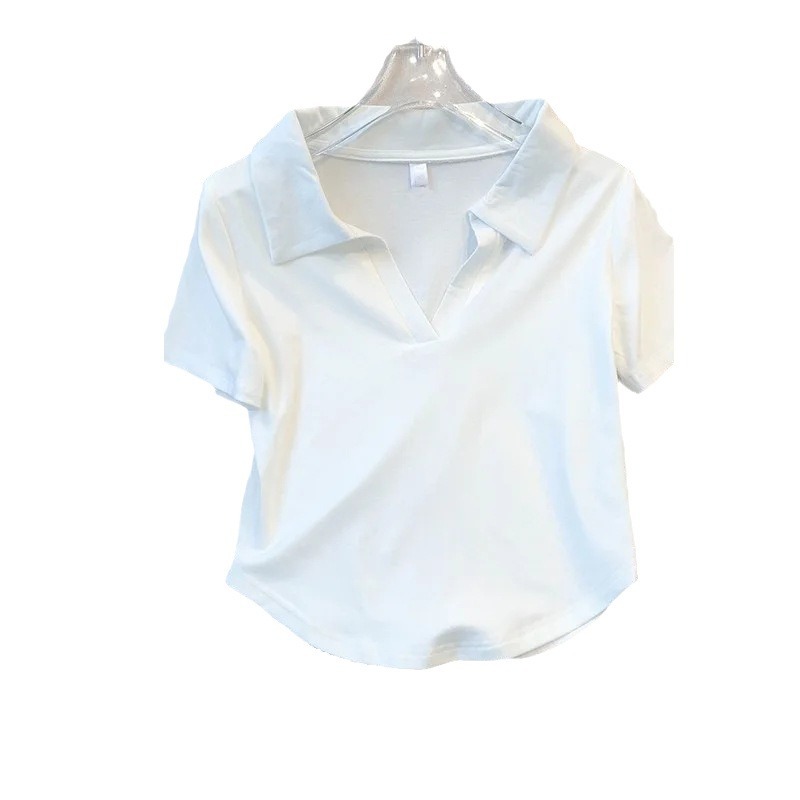 POLO领夏季新款短款正肩不规则下摆设计感小众冰丝螺纹短袖t恤女