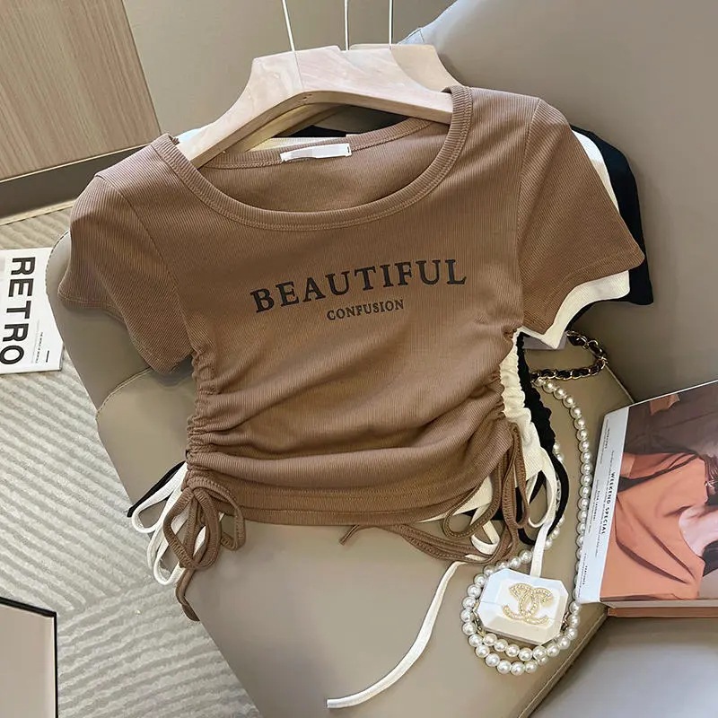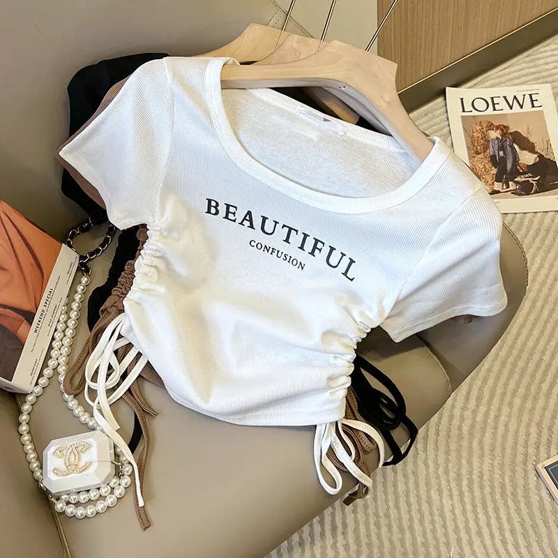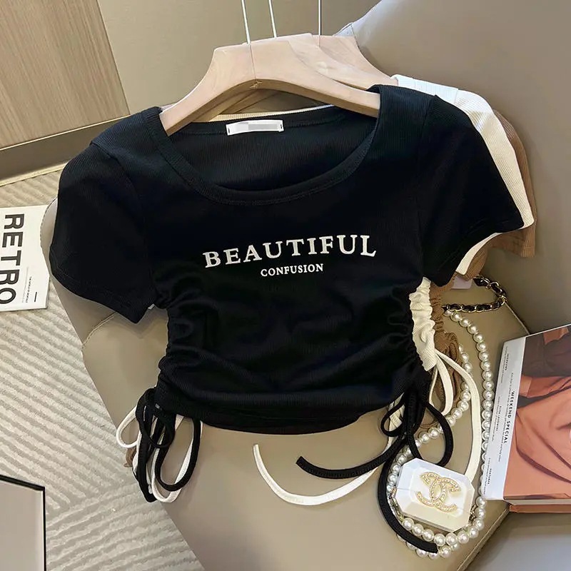 韩版U领字母抽绳印花小众设计感短袖T恤衫女夏季新款百搭上衣